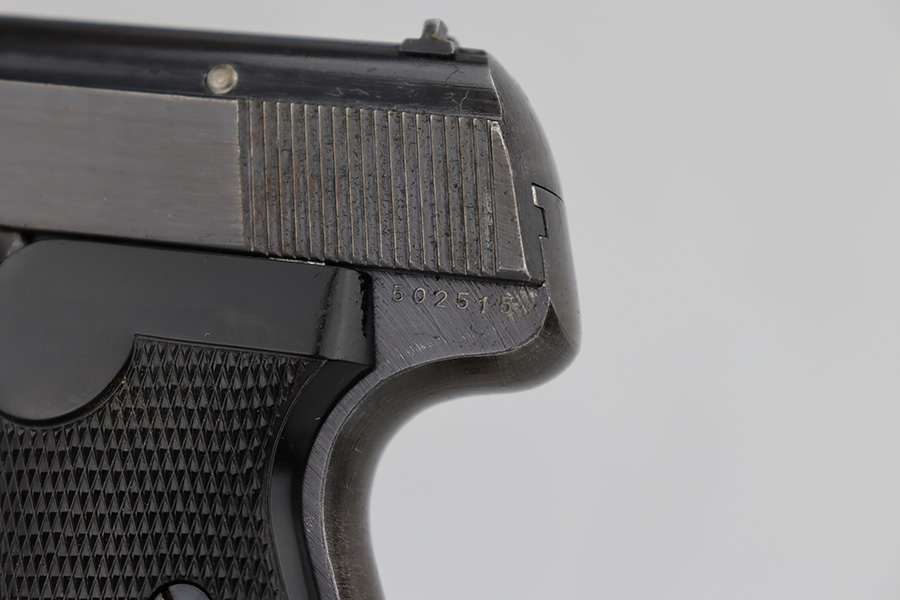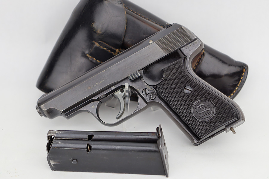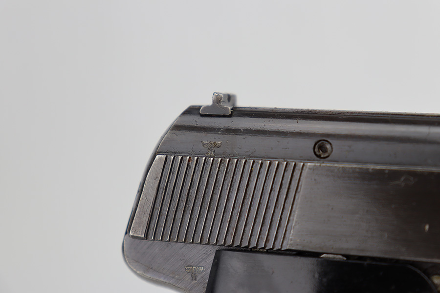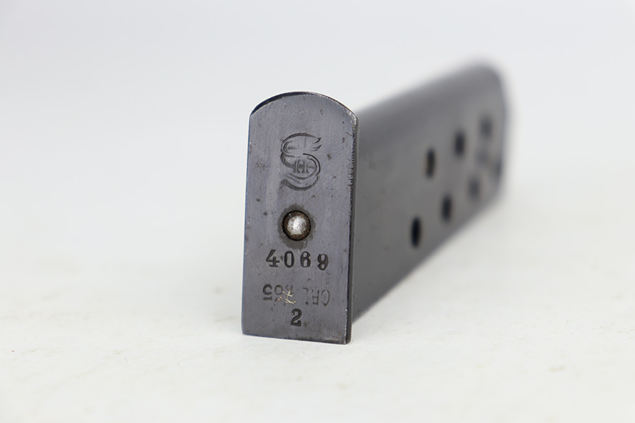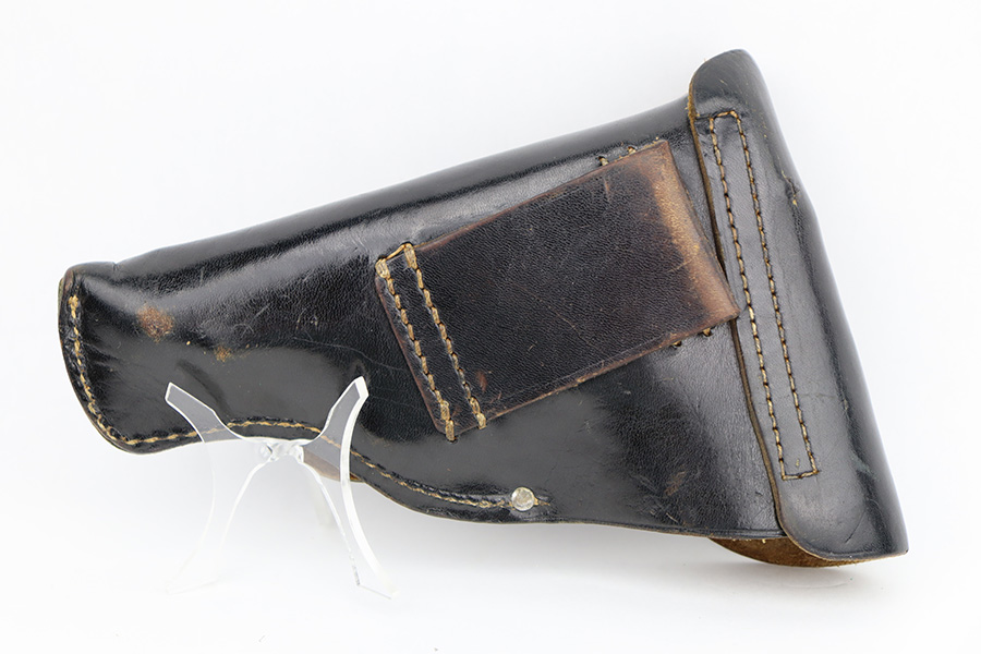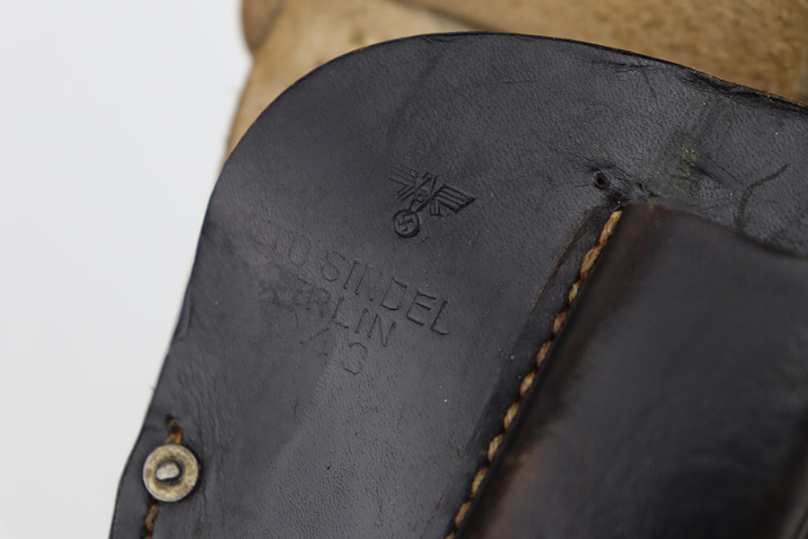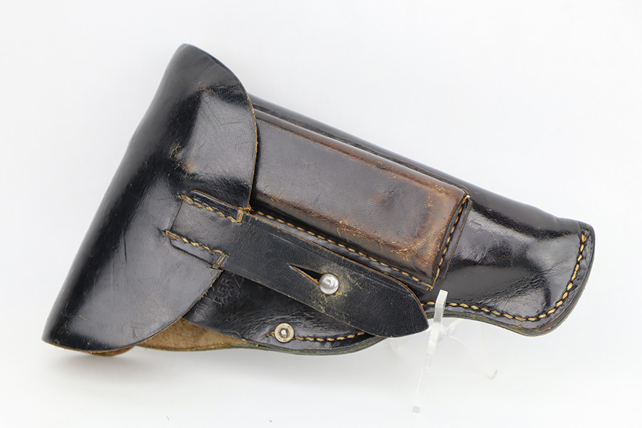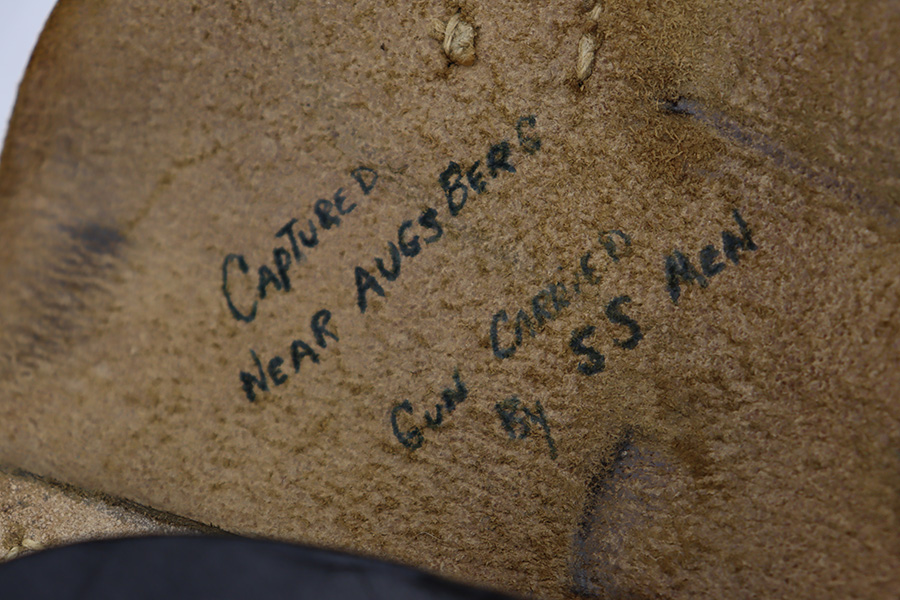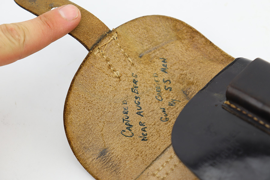 6/12/23 – This is a rare, original Sauer 38h pistol with Eagle/F on frame. One of only 7,500 produced. It has a very nice profile but some patina and thinning to the grip frame. Mint bore, hardly looks used. Nice, original grips with only minor handling wear on the right panel. Police added a lanyard ring on the base of the frame. It comes as a rig with one half-moon magazine, one police-numbered magazine (not matching), and an excellent 1943-dated police holster. The inside of the holster has some writing in marker that reads “Captured Near Ausberg, Gun Carried By SS Men”.