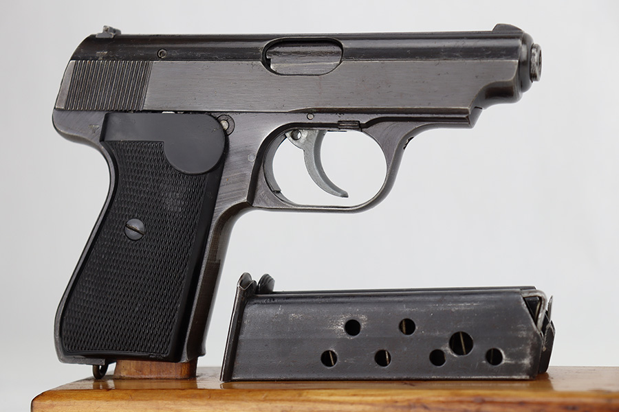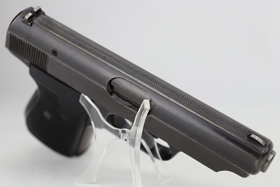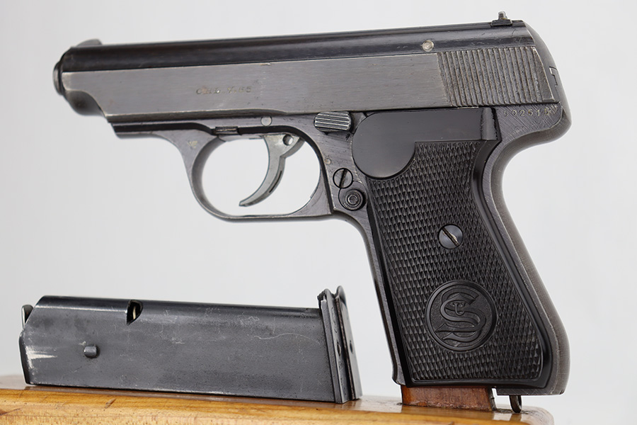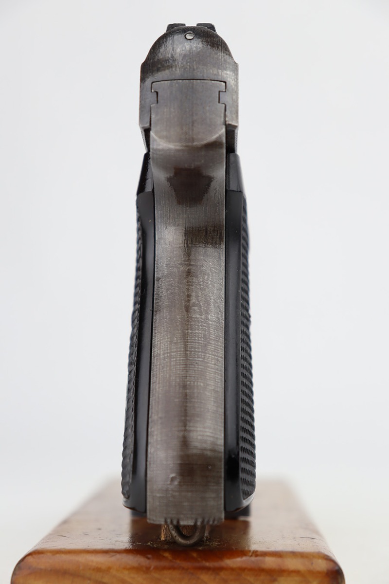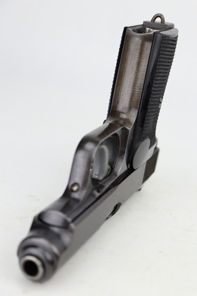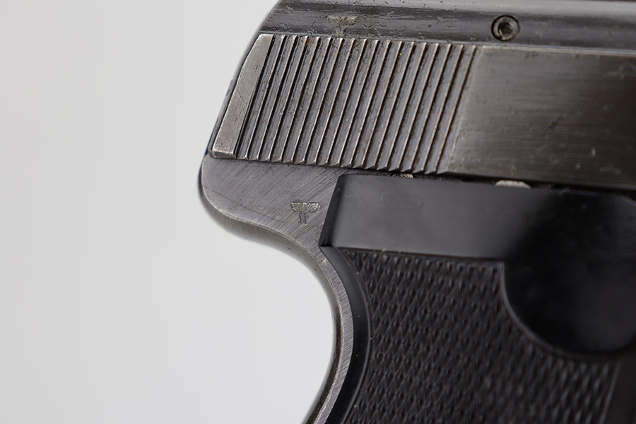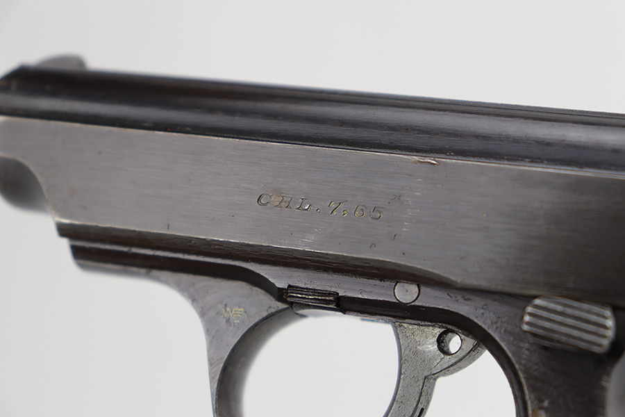 6/12/23 – This is a rare, original Sauer 38h pistol with Eagle/F on frame. One of only 7,500 produced. It has a very nice profile but some patina and thinning to the grip frame. Mint bore, hardly looks used. Nice, original grips with only minor handling wear on the right panel. Police added a lanyard ring on the base of the frame. It comes as a rig with one half-moon magazine, one police-numbered magazine (not matching), and an excellent 1943-dated police holster. The inside of the holster has some writing in marker that reads “Captured Near Ausberg, Gun Carried By SS Men”.