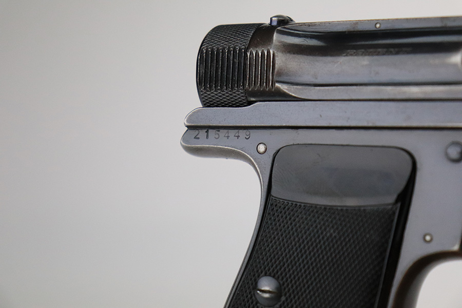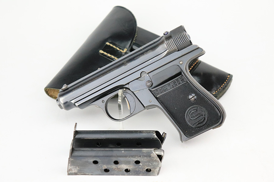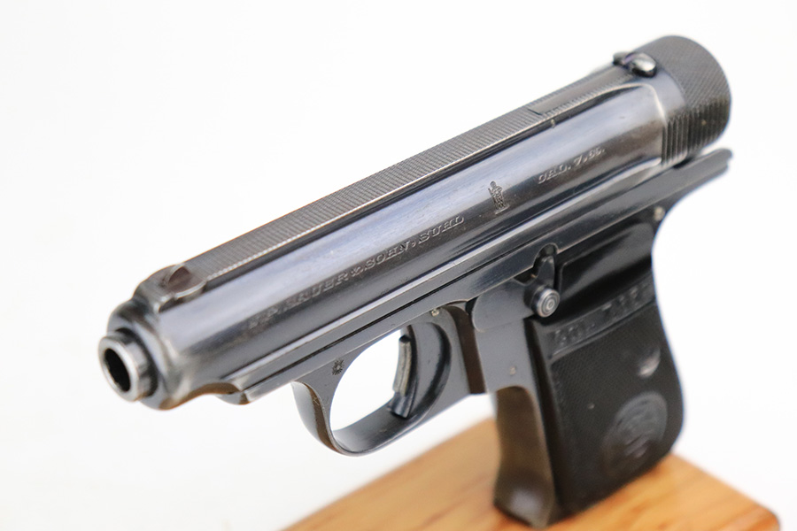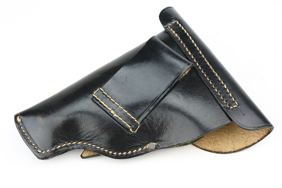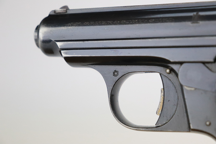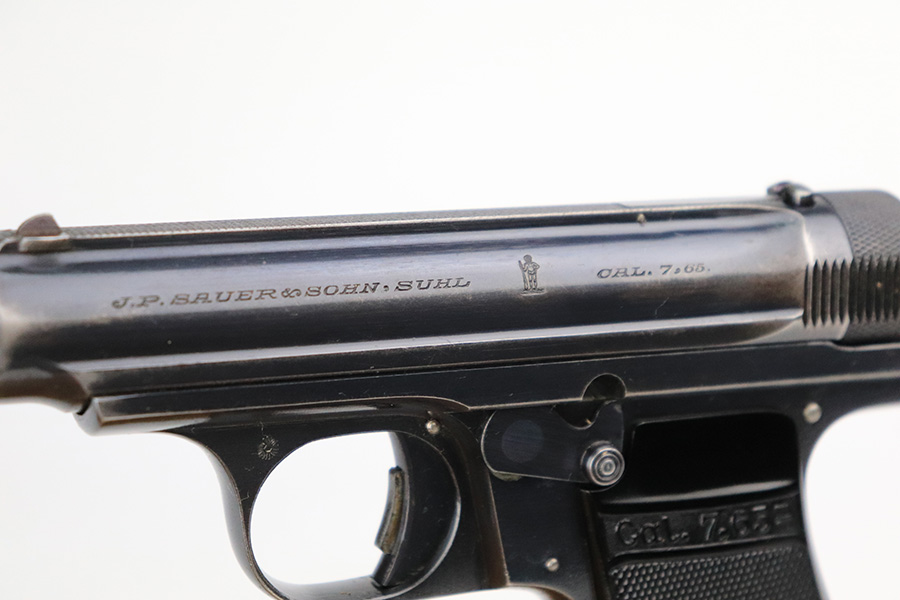 7/20/22 – This is a very nice example of a rare Sauer Behorden pistol. This is a Sauer Model 1913 issued to the Nazi-era Prussian State Police. This is evidenced by the police sunburst marking on the left side of the frame. This was the last iteration of this pistol before they switched over to the 38h. They were marketed to and almost exclusively sold to Nazi-era police organizations. They had added safety features, such as the additional trigger safety, making them appealing for police. Very few of these guns were produced. This one is all matching and comes as a rig with a mint 1941-dated Nazi police holster (faint circular ink stamp on the inside) and two period-correct magazines. The gun itself has retained roughly 80% of its original high polish finish. There is thinning and spotty oxidation on the grip straps and minor wear along both sides of the slide, concentrated mostly around the high edges. Comes with excellent black plastic grips. Mint bore.
