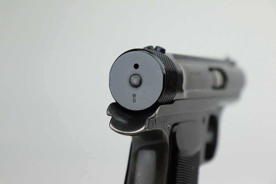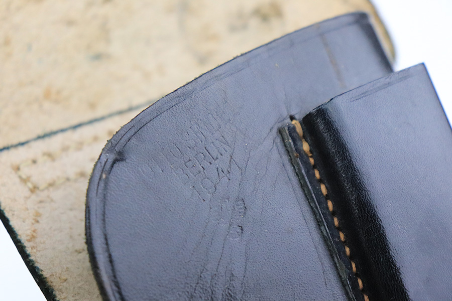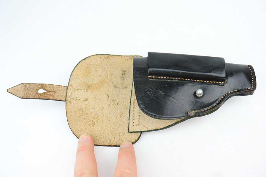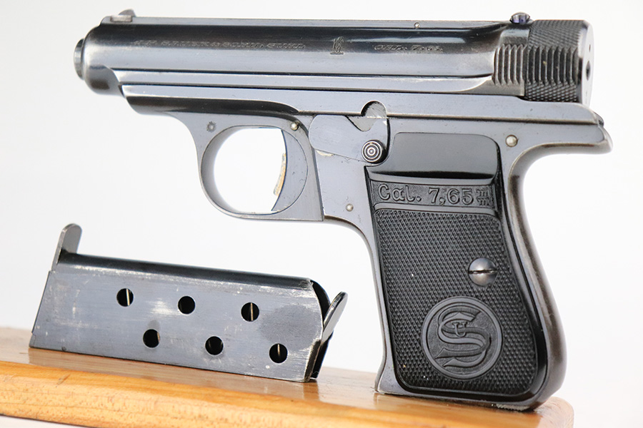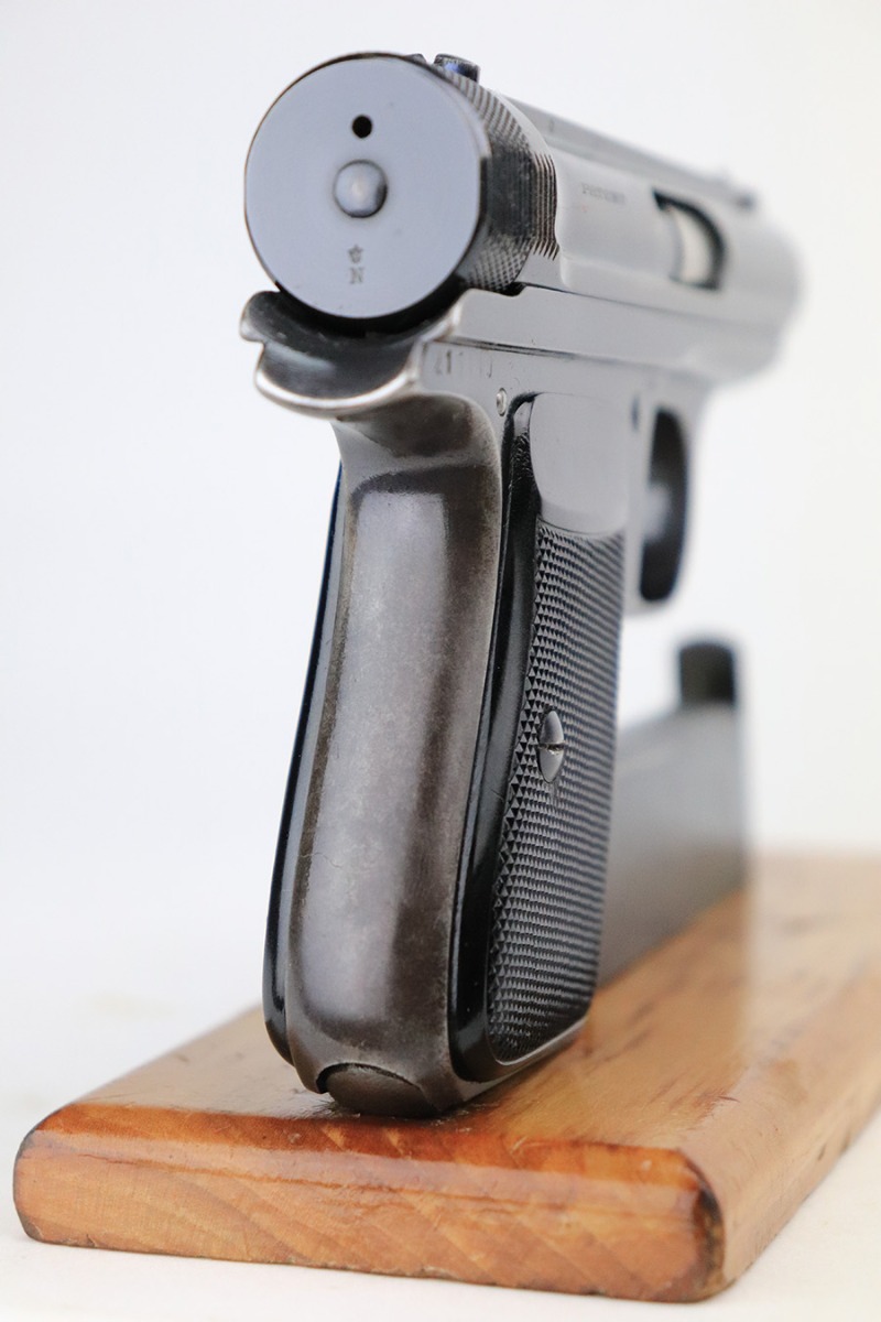 7/20/22 – This is a very nice example of a rare Sauer Behorden pistol. This is a Sauer Model 1913 issued to the Nazi-era Prussian State Police. This is evidenced by the police sunburst marking on the left side of the frame. This was the last iteration of this pistol before they switched over to the 38h. They were marketed to and almost exclusively sold to Nazi-era police organizations. They had added safety features, such as the additional trigger safety, making them appealing for police. Very few of these guns were produced. This one is all matching and comes as a rig with a mint 1941-dated Nazi police holster (faint circular ink stamp on the inside) and two period-correct magazines. The gun itself has retained roughly 80% of its original high polish finish. There is thinning and spotty oxidation on the grip straps and minor wear along both sides of the slide, concentrated mostly around the high edges. Comes with excellent black plastic grips. Mint bore.