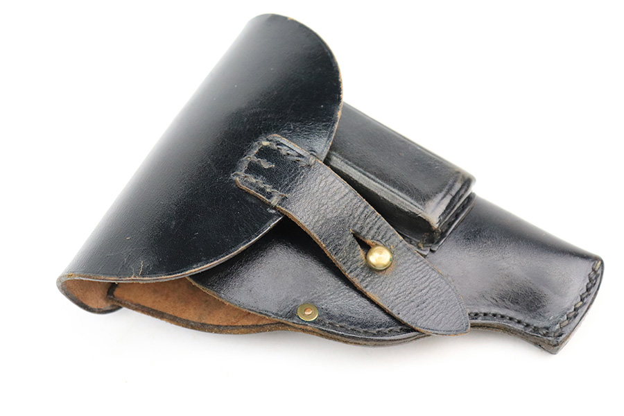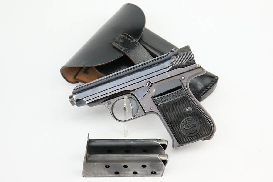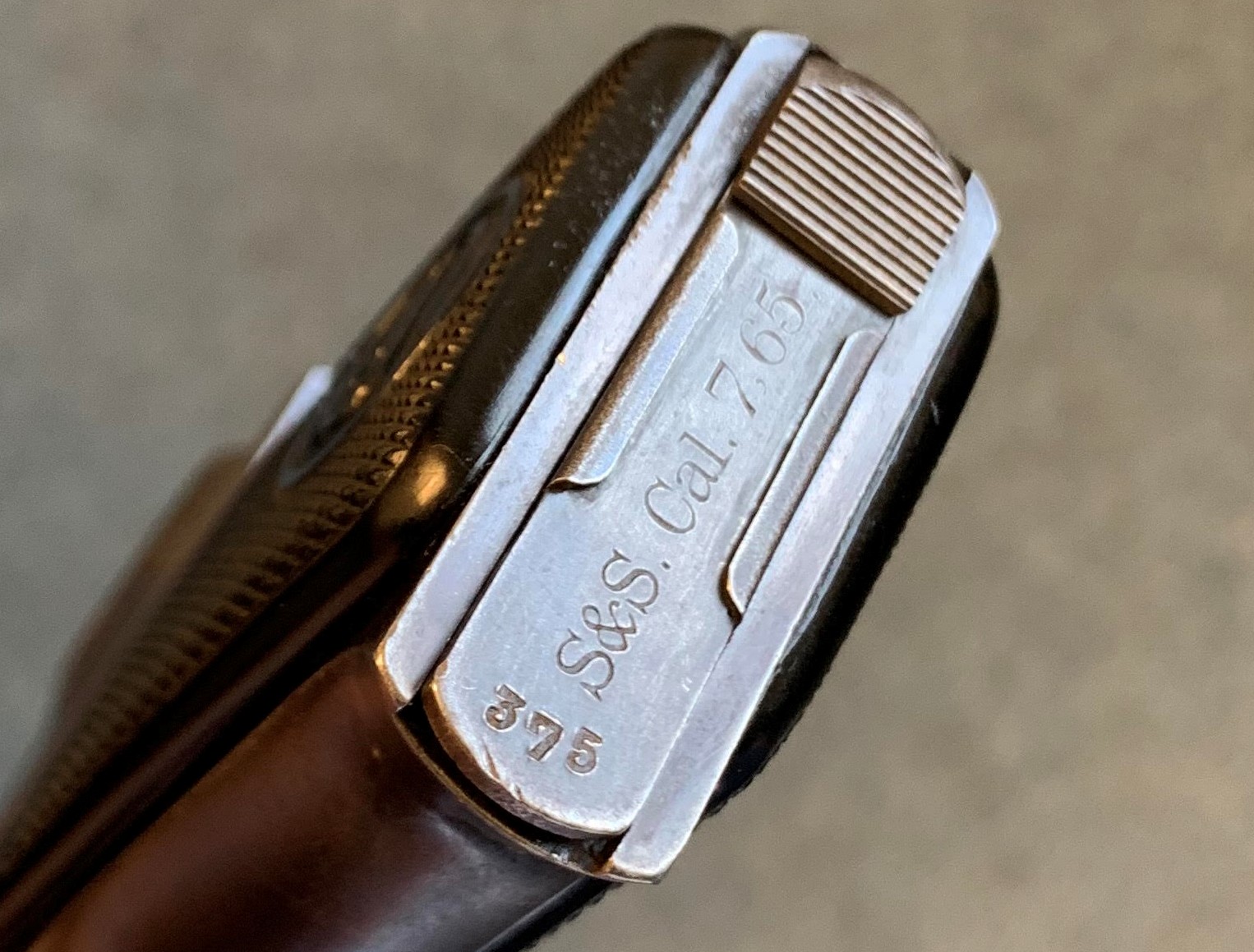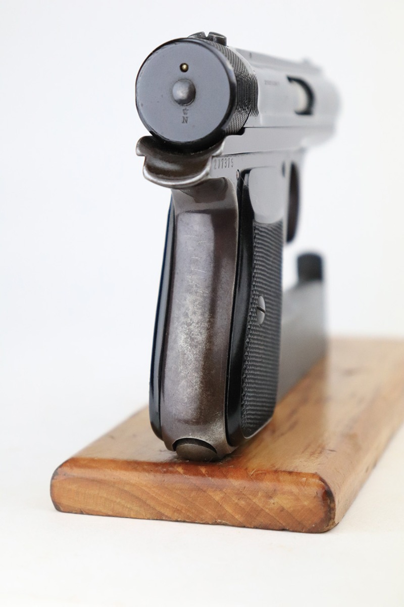 7/19/22 – This is a very nice example of a rare Sauer Behorden pistol. This is a Sauer Model 1913 issued to the Nazi-era Prussian State Police. This is evidenced by the “Starburst K” marking on the web of the trigger guard. This was the last iteration of this pistol before they switched over to the 38h. They were marketed to and almost exclusively sold to Nazi-era police organizations. They had added safety features, such as the additional trigger safety, making them appealing for police. Very few of these guns were produced. This one is all matching and comes as a rig with 1933-dated police holster (un-issued condition), one matching police arsenal-numbered magazine, and one un-numbered magazine. The gun has retained somewhere between 85-90% of its original finish. There is minor muzzle wear and light, somewhat spotty wear along both sides of the slide. Very minor thinning and freckling on the grip straps, especially the back. Excellent black bakelite grips. Mint bore.