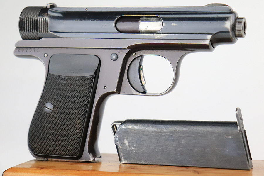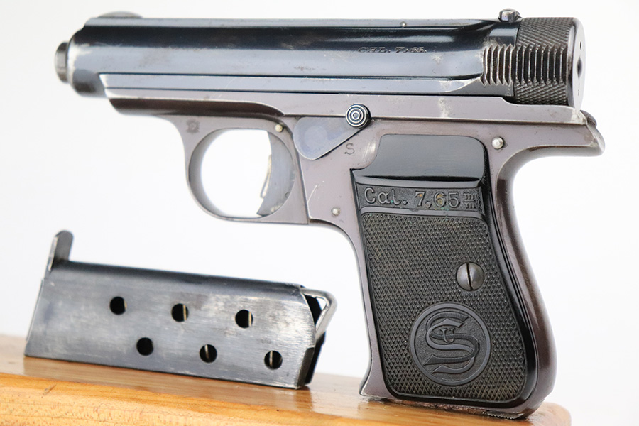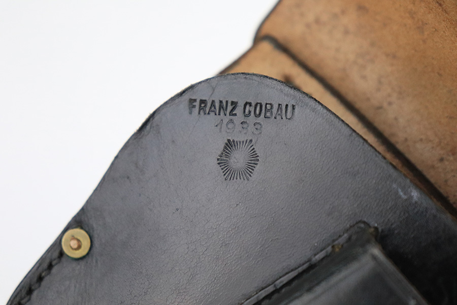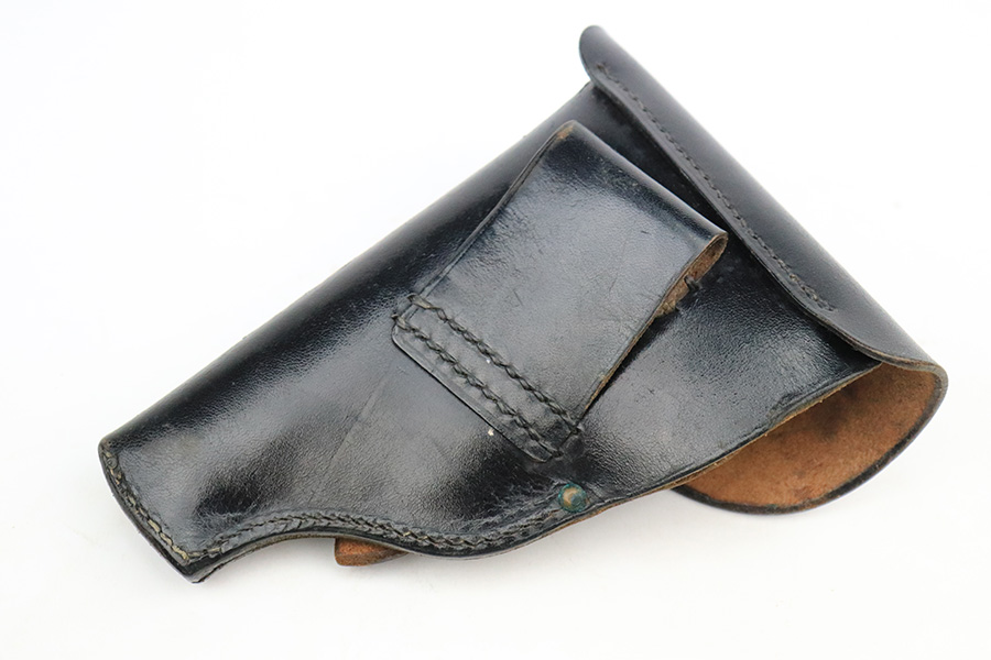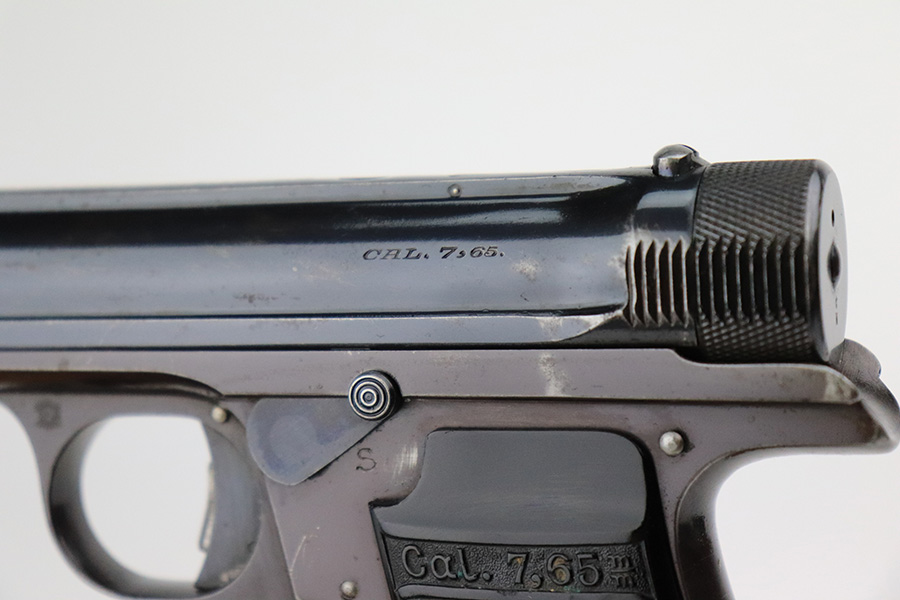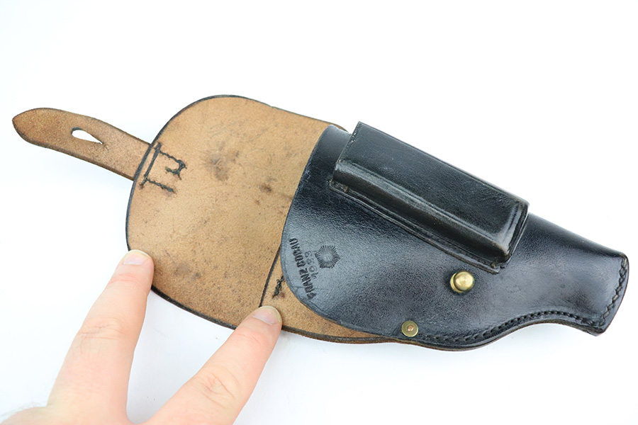 7/19/22 – This is a very nice example of a rare Sauer Behorden pistol. This is a Sauer Model 1913 issued to the Nazi-era Prussian State Police. This is evidenced by the “Starburst K” marking on the web of the trigger guard. This was the last iteration of this pistol before they switched over to the 38h. They were marketed to and almost exclusively sold to Nazi-era police organizations. They had added safety features, such as the additional trigger safety, making them appealing for police. Very few of these guns were produced. This one is all matching and comes as a rig with 1933-dated police holster (un-issued condition), one matching police arsenal-numbered magazine, and one un-numbered magazine. The gun has retained somewhere between 85-90% of its original finish. There is minor muzzle wear and light, somewhat spotty wear along both sides of the slide. Very minor thinning and freckling on the grip straps, especially the back. Excellent black bakelite grips. Mint bore.