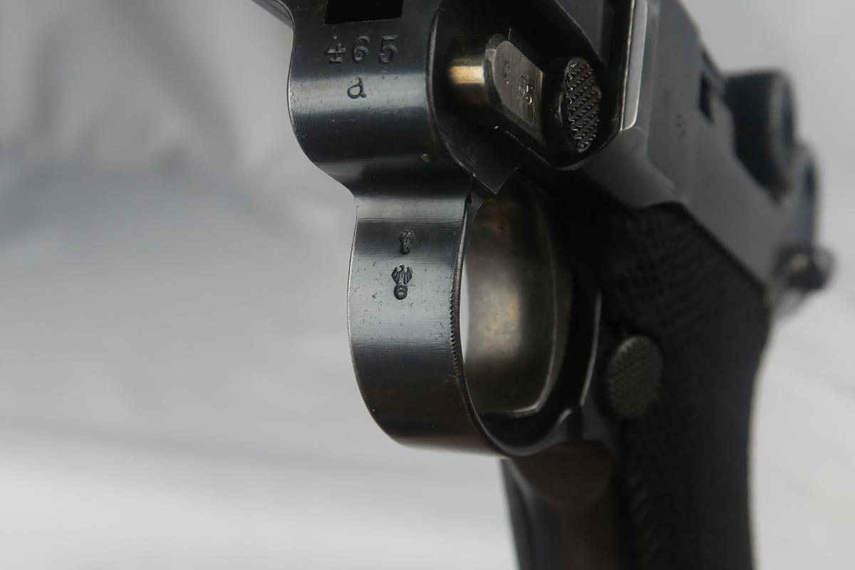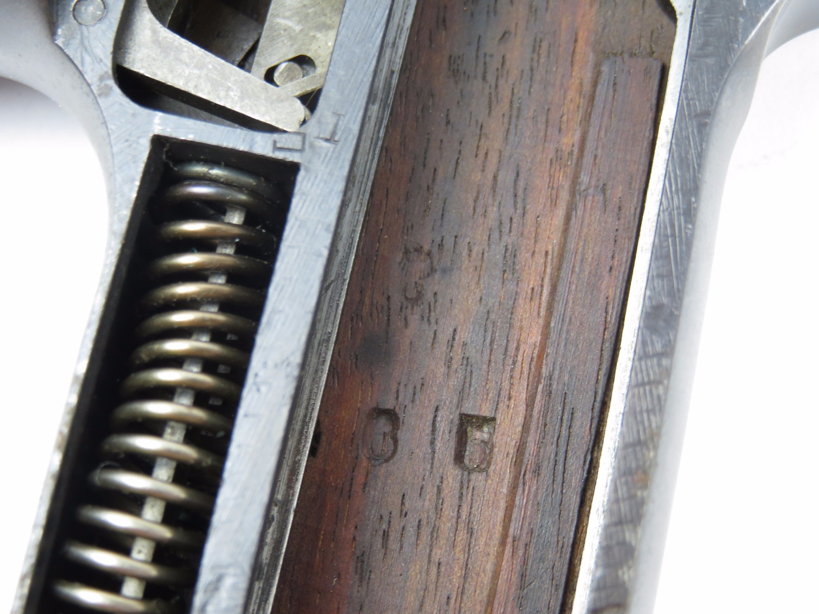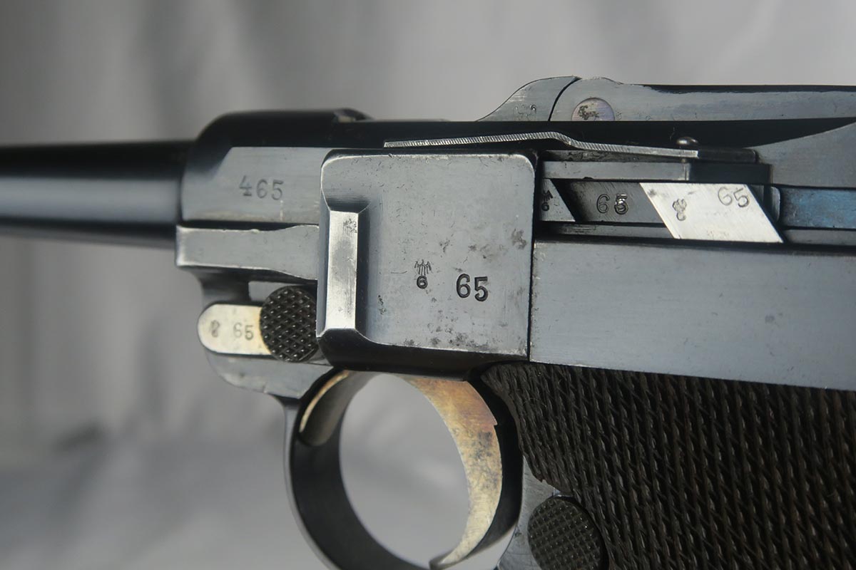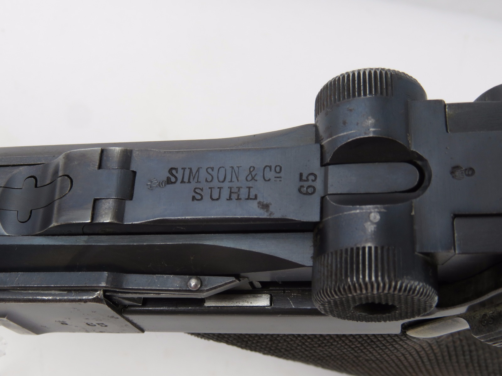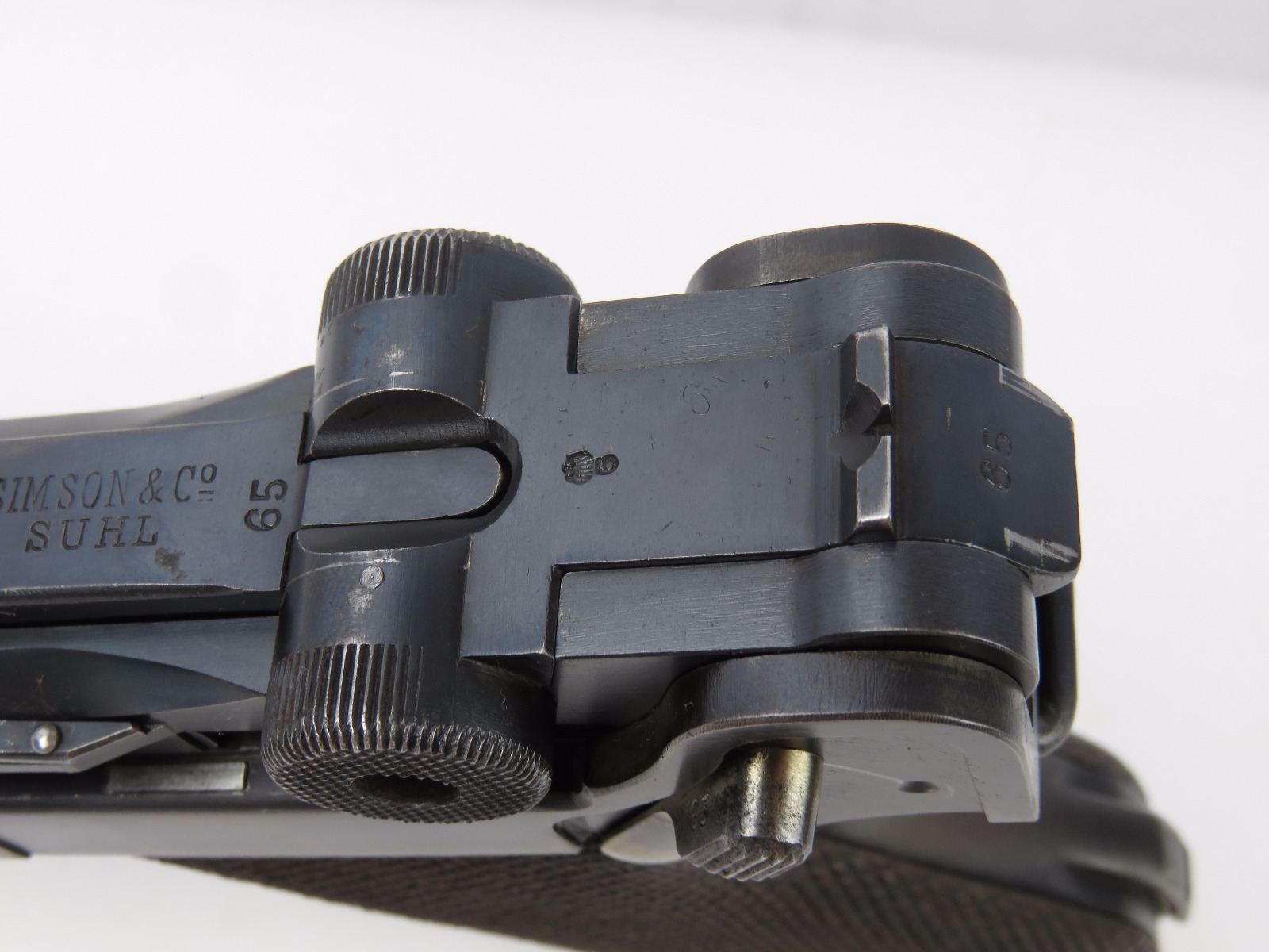 10/23/17 – This is a very rare 1929 or 1930 made Simson luger that was issued to the German Police. Only about 12,000 total Simsons were made with only about 1k going to the police. It has all original finish, and ALL matching numbered parts with all parts being correct Eagle/6 (Simson) proofed including the grip screws. Grips also numbered to the gun with Simson proofs. Excellent finish at about 92-93%, with a good amount of browning to the finish on the straps. But these are rarely found in such great condition. We spoke with Simson book author Ed Tinker and he had this gun verified and listed in his database. It is a consignment gun for us, so no trades on this one. Comes with original capture papers. A rare 1926 dated holster from Albert Fishier in Berlin. Back of holster badly cracked. Also, rare Eagle/6 Simson marked tool. Excellent bore.
