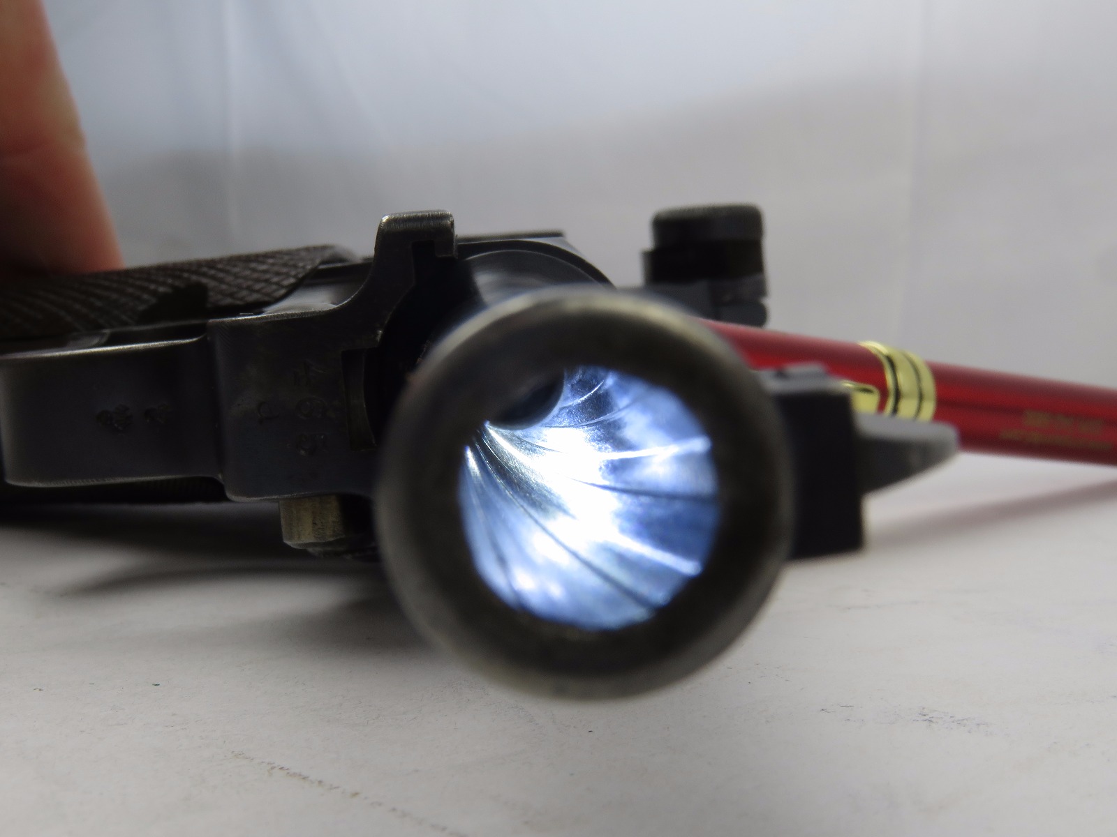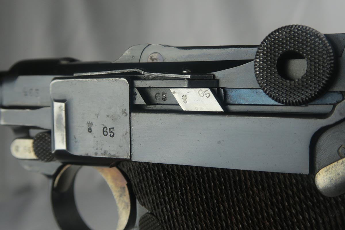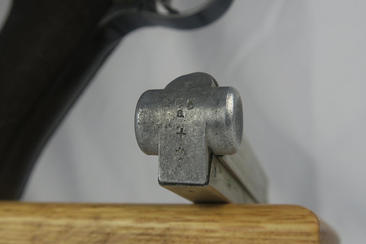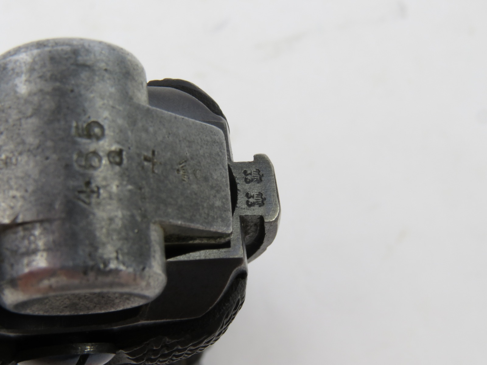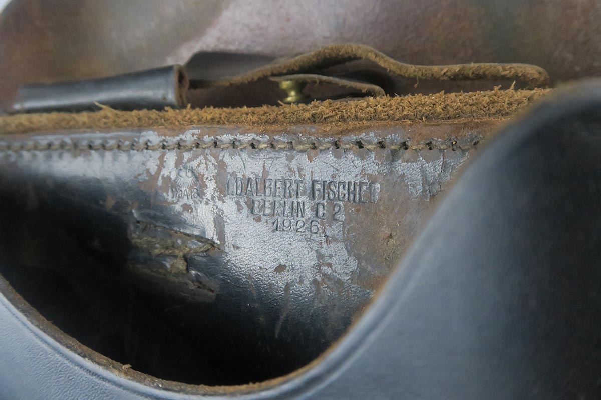 10/23/17 – This is a very rare 1929 or 1930 made Simson luger that was issued to the German Police. Only about 12,000 total Simsons were made with only about 1k going to the police. It has all original finish, and ALL matching numbered parts with all parts being correct Eagle/6 (Simson) proofed including the grip screws. Grips also numbered to the gun with Simson proofs. Excellent finish at about 92-93%, with a good amount of browning to the finish on the straps. But these are rarely found in such great condition. We spoke with Simson book author Ed Tinker and he had this gun verified and listed in his database. It is a consignment gun for us, so no trades on this one. Comes with original capture papers. A rare 1926 dated holster from Albert Fishier in Berlin. Back of holster badly cracked. Also, rare Eagle/6 Simson marked tool. Excellent bore.