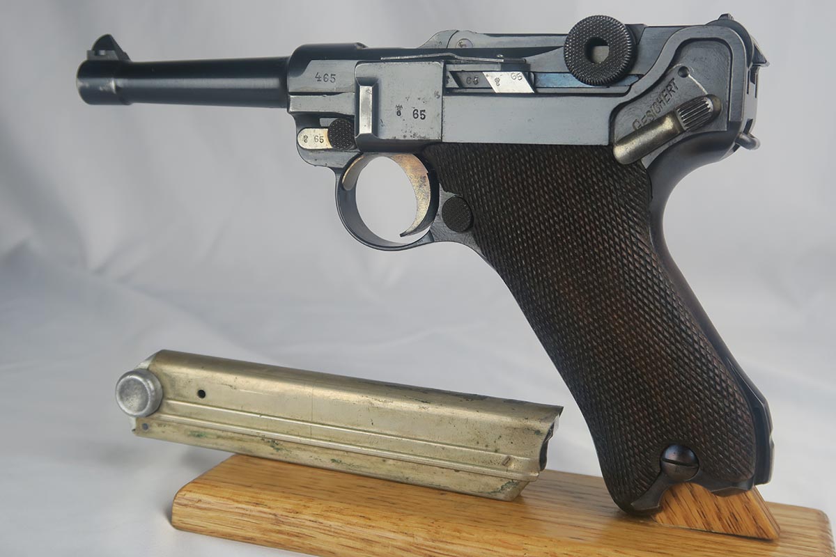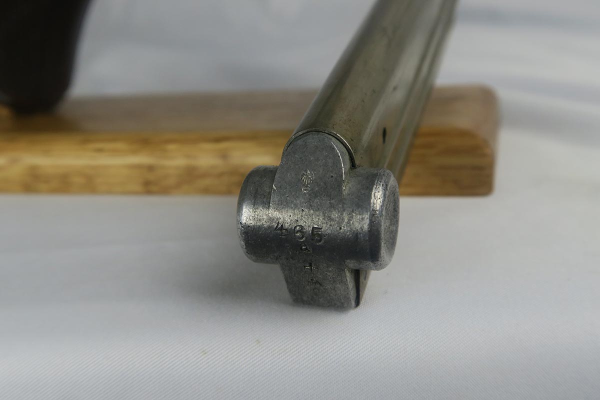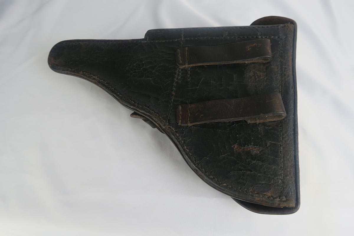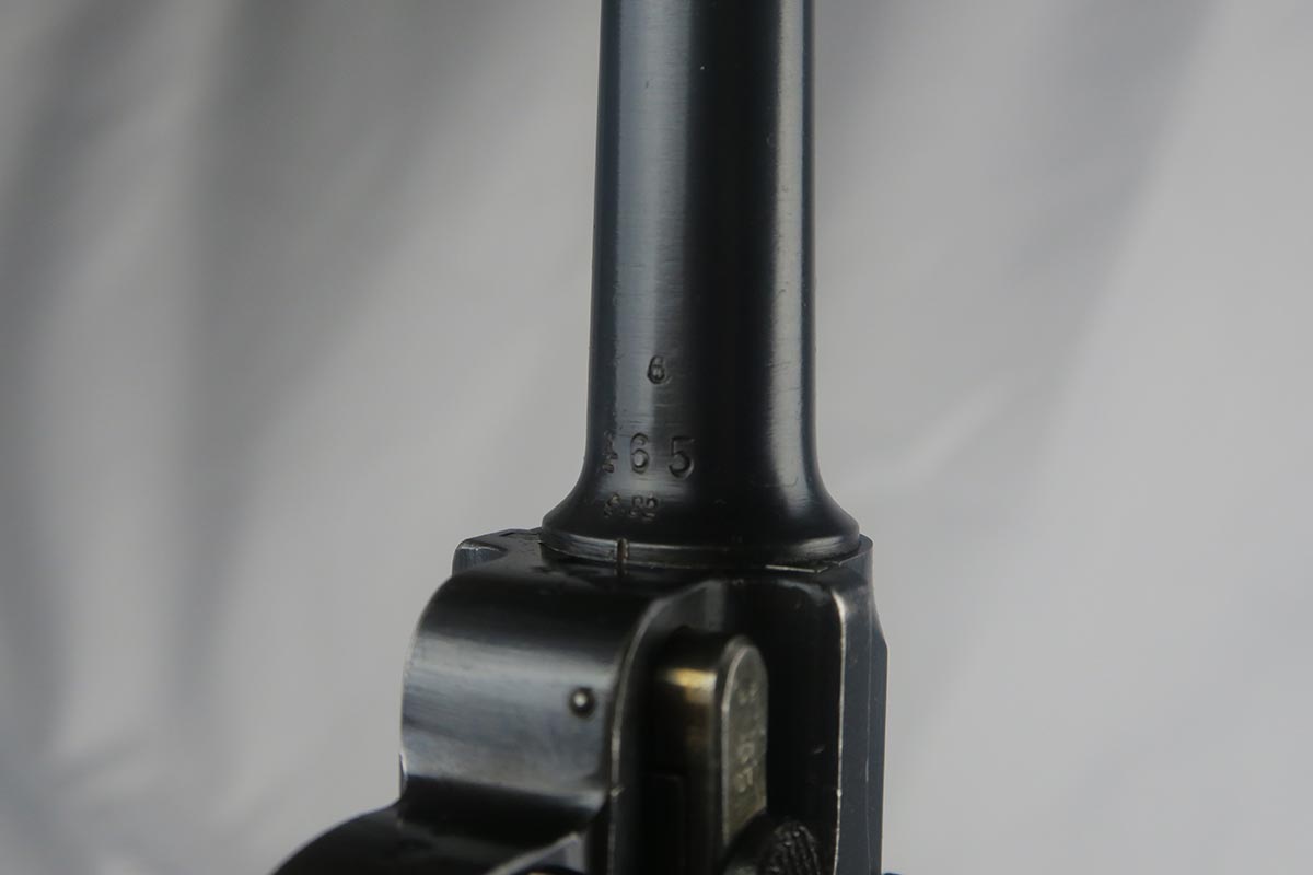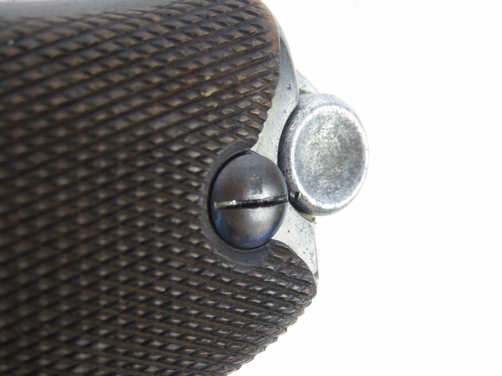 10/23/17 – This is a very rare 1929 or 1930 made Simson luger that was issued to the German Police. Only about 12,000 total Simsons were made with only about 1k going to the police. It has all original finish, and ALL matching numbered parts with all parts being correct Eagle/6 (Simson) proofed including the grip screws. Grips also numbered to the gun with Simson proofs. Excellent finish at about 92-93%, with a good amount of browning to the finish on the straps. But these are rarely found in such great condition. We spoke with Simson book author Ed Tinker and he had this gun verified and listed in his database. It is a consignment gun for us, so no trades on this one. Comes with original capture papers. A rare 1926 dated holster from Albert Fishier in Berlin. Back of holster badly cracked. Also, rare Eagle/6 Simson marked tool. Excellent bore.