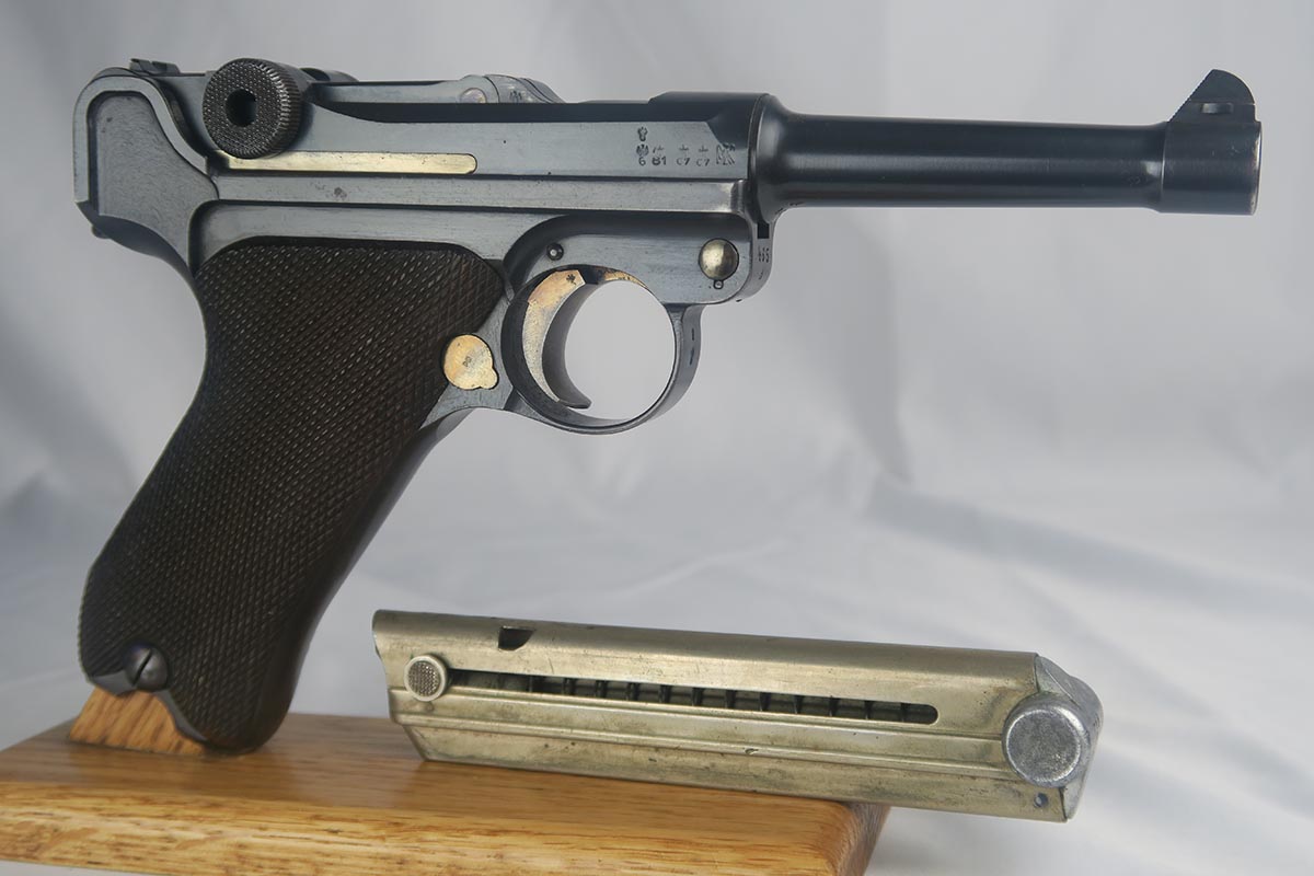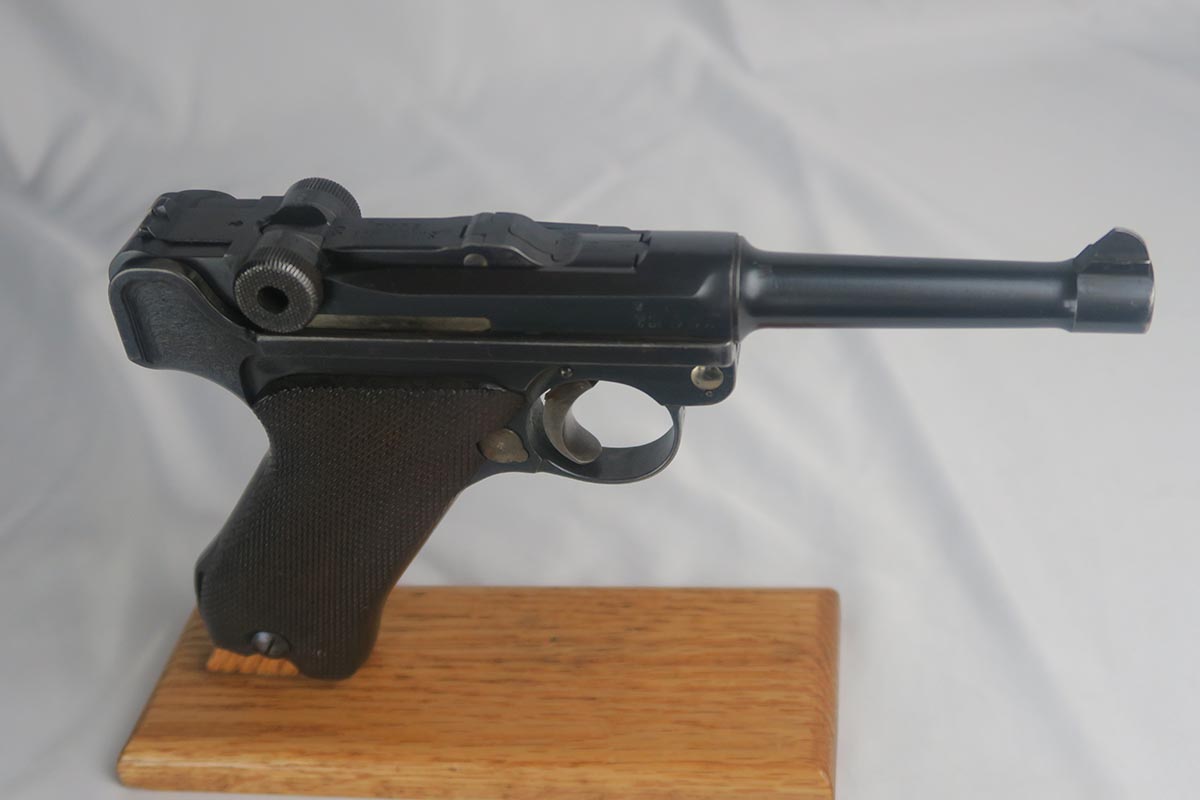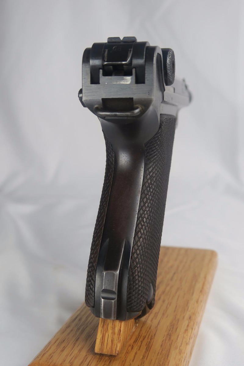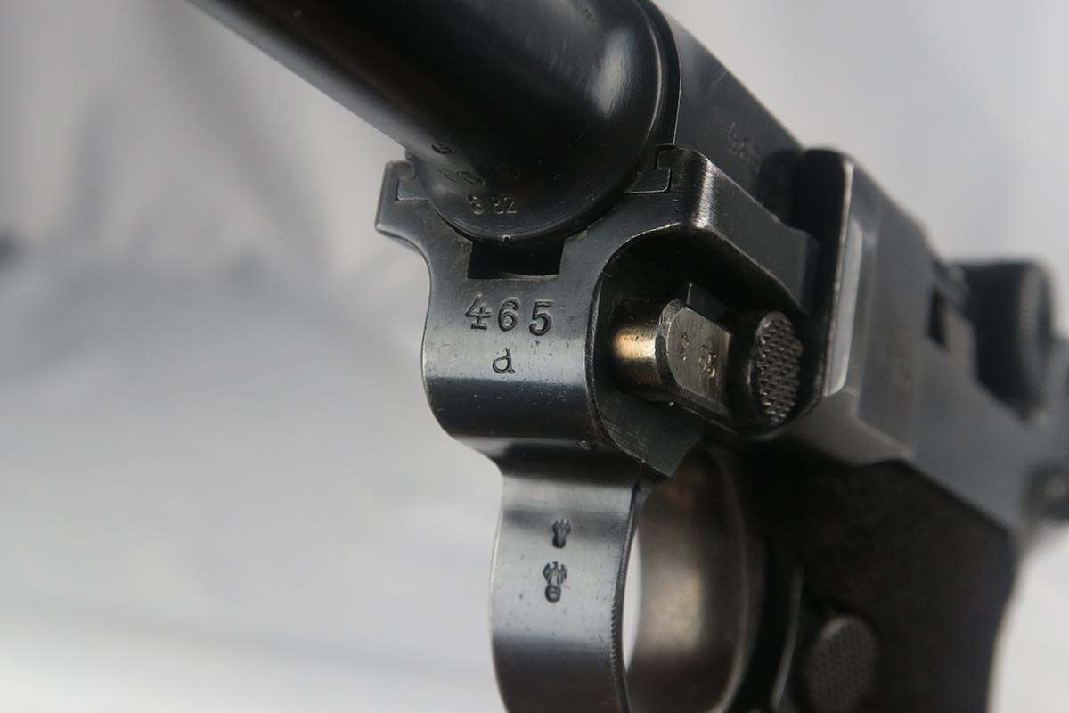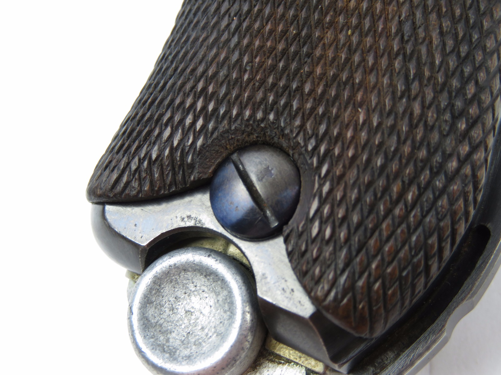 10/23/17 – This is a very rare 1929 or 1930 made Simson luger that was issued to the German Police. Only about 12,000 total Simsons were made with only about 1k going to the police. It has all original finish, and ALL matching numbered parts with all parts being correct Eagle/6 (Simson) proofed including the grip screws. Grips also numbered to the gun with Simson proofs. Excellent finish at about 92-93%, with a good amount of browning to the finish on the straps. But these are rarely found in such great condition. We spoke with Simson book author Ed Tinker and he had this gun verified and listed in his database. It is a consignment gun for us, so no trades on this one. Comes with original capture papers. A rare 1926 dated holster from Albert Fishier in Berlin. Back of holster badly cracked. Also, rare Eagle/6 Simson marked tool. Excellent bore.