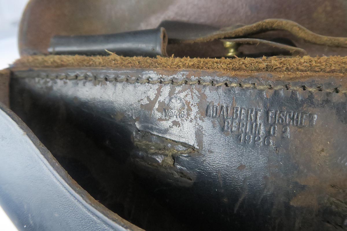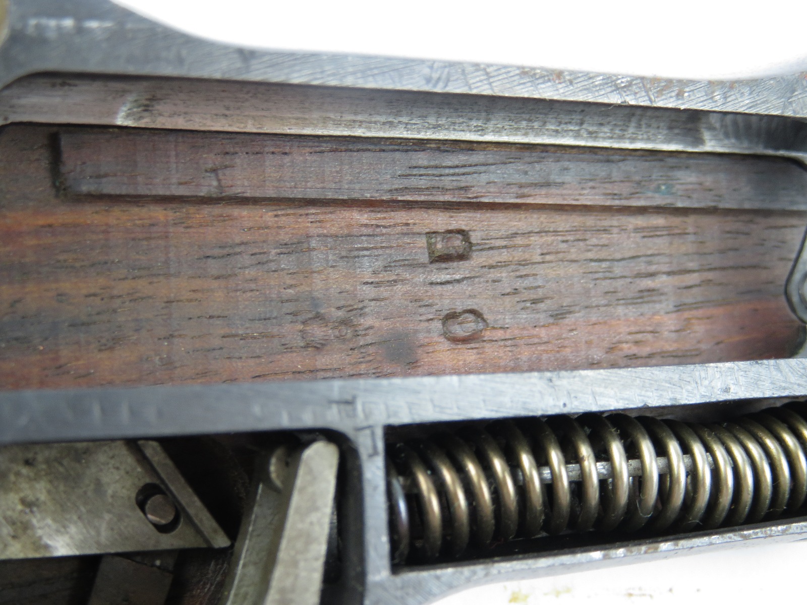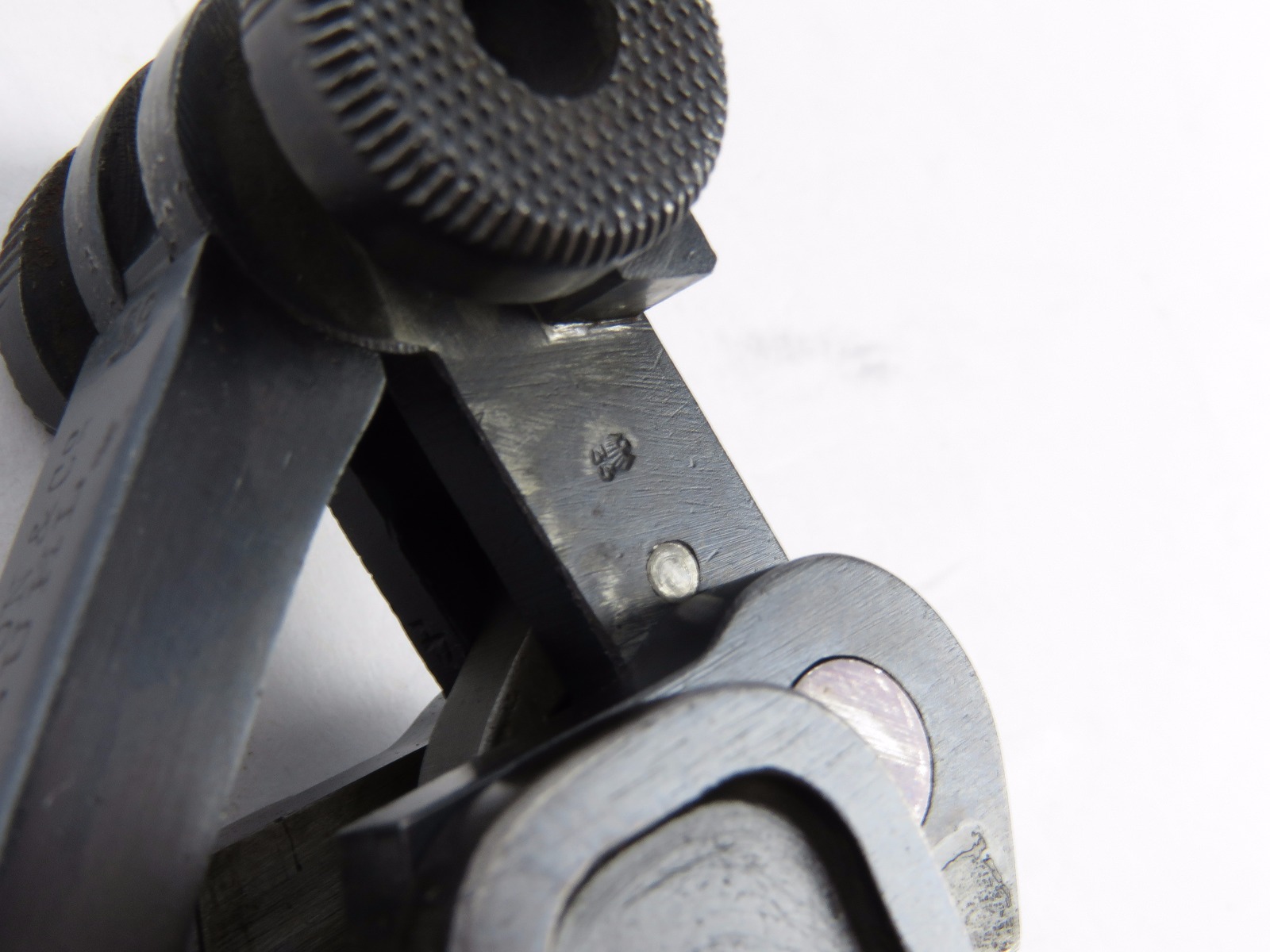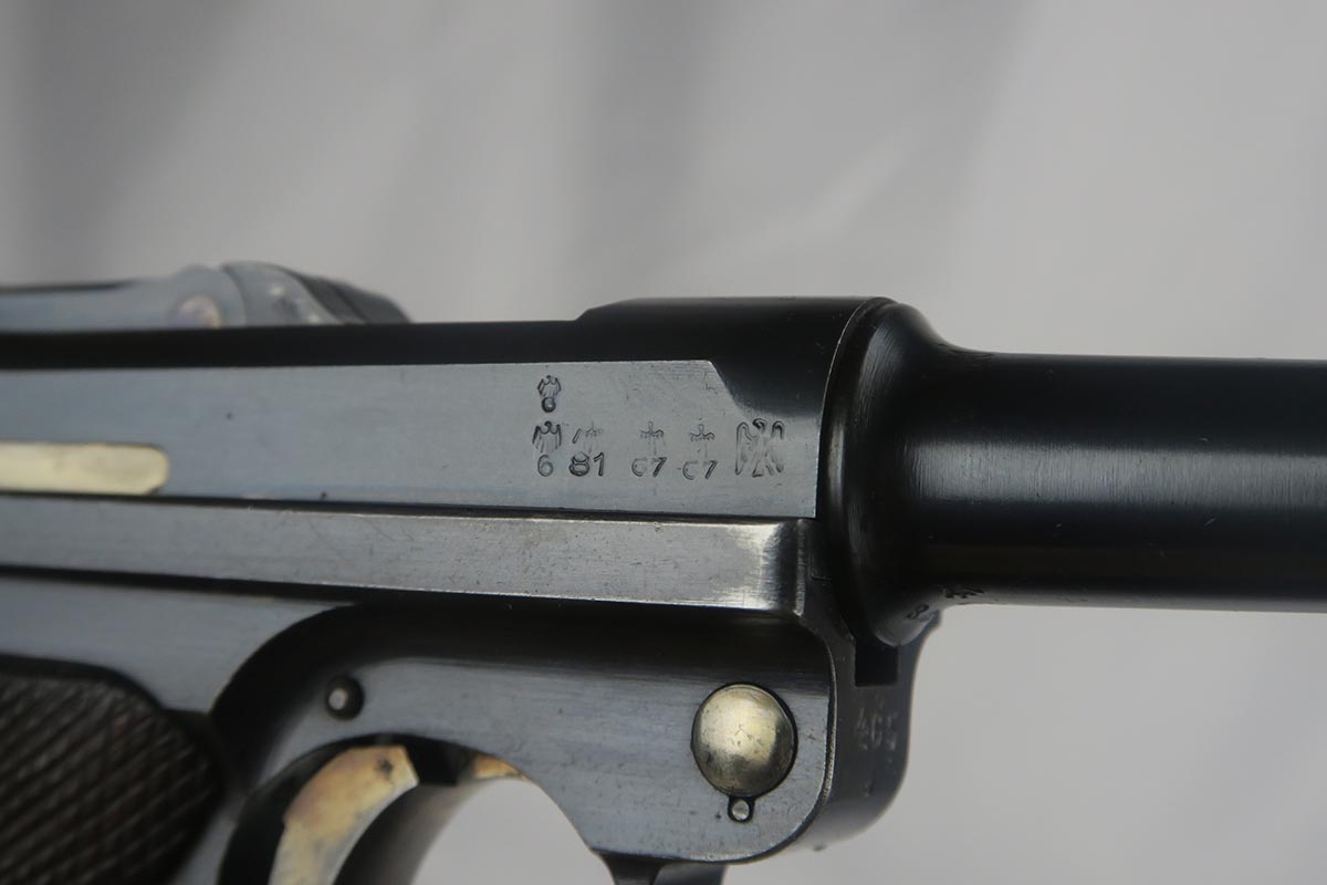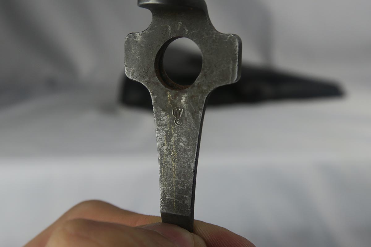 10/23/17 – This is a very rare 1929 or 1930 made Simson luger that was issued to the German Police. Only about 12,000 total Simsons were made with only about 1k going to the police. It has all original finish, and ALL matching numbered parts with all parts being correct Eagle/6 (Simson) proofed including the grip screws. Grips also numbered to the gun with Simson proofs. Excellent finish at about 92-93%, with a good amount of browning to the finish on the straps. But these are rarely found in such great condition. We spoke with Simson book author Ed Tinker and he had this gun verified and listed in his database. It is a consignment gun for us, so no trades on this one. Comes with original capture papers. A rare 1926 dated holster from Albert Fishier in Berlin. Back of holster badly cracked. Also, rare Eagle/6 Simson marked tool. Excellent bore.