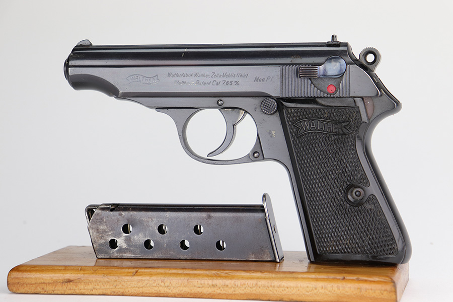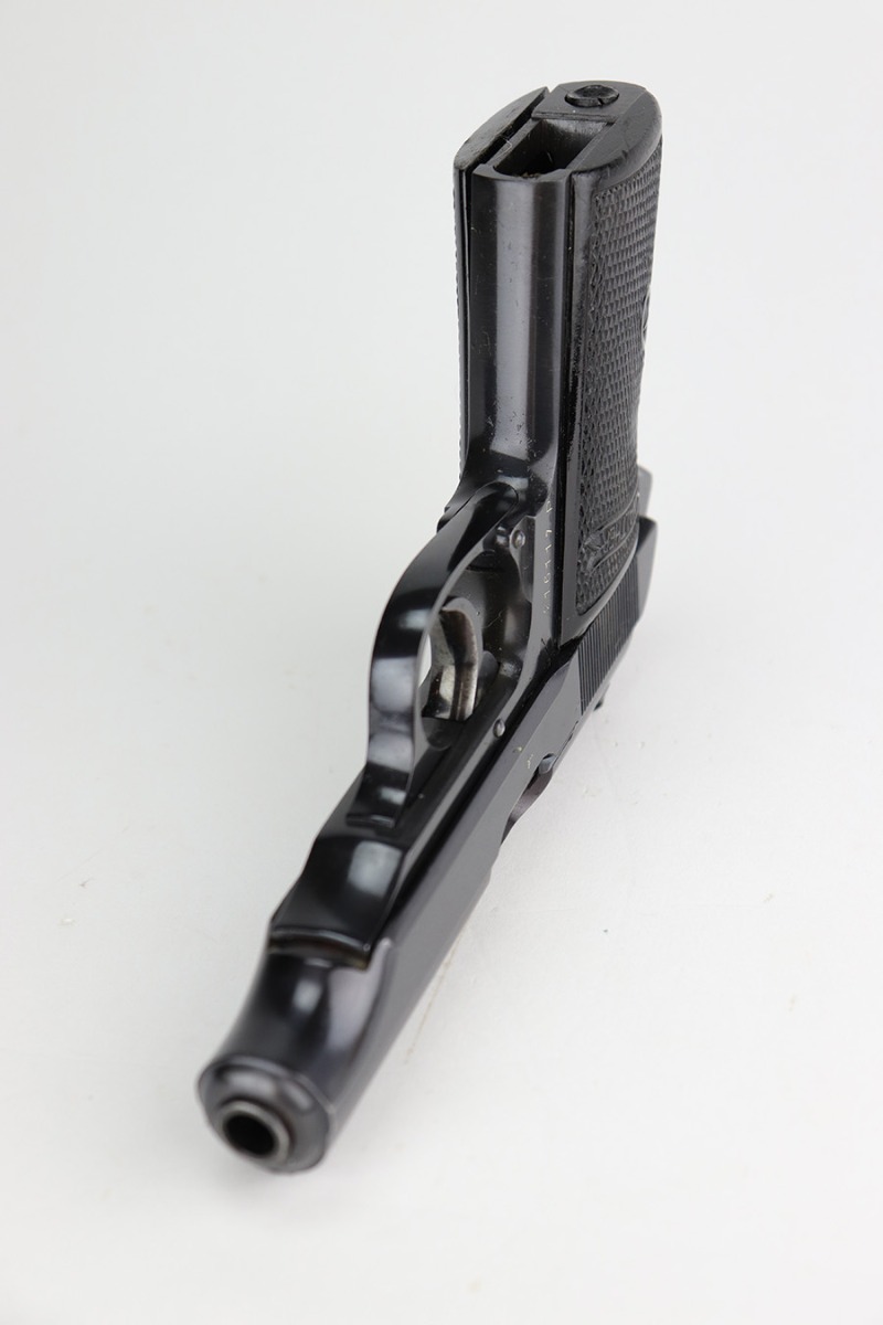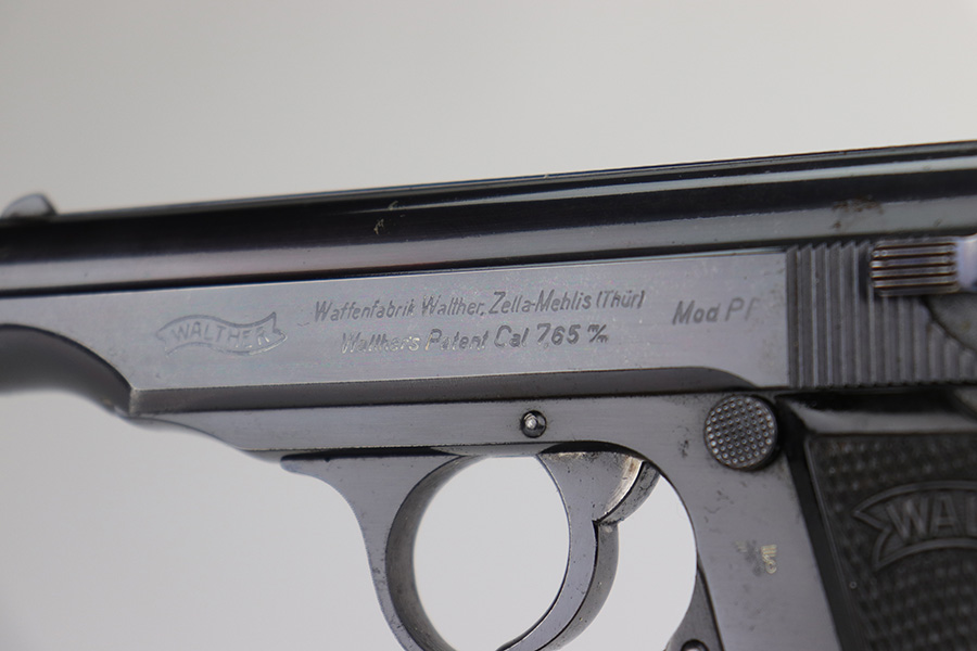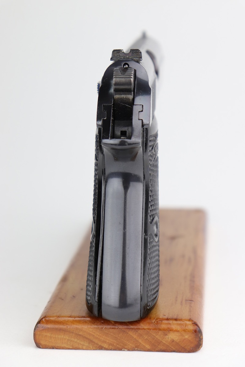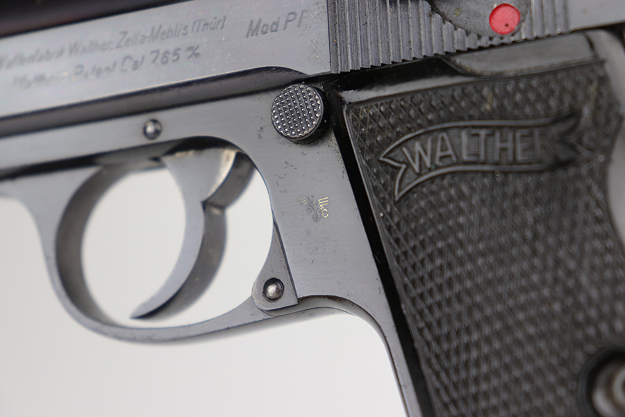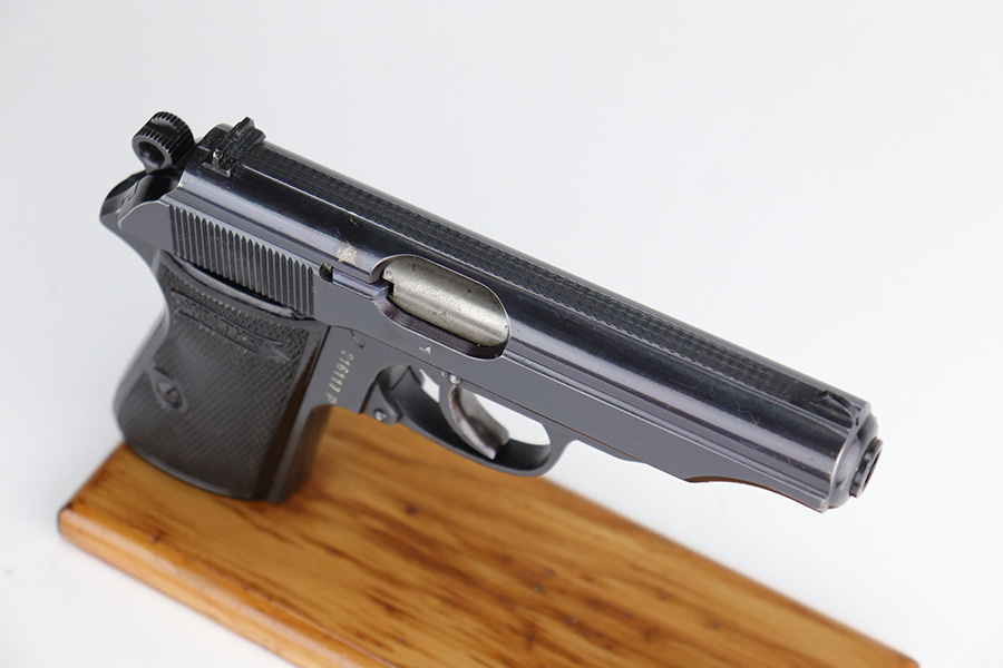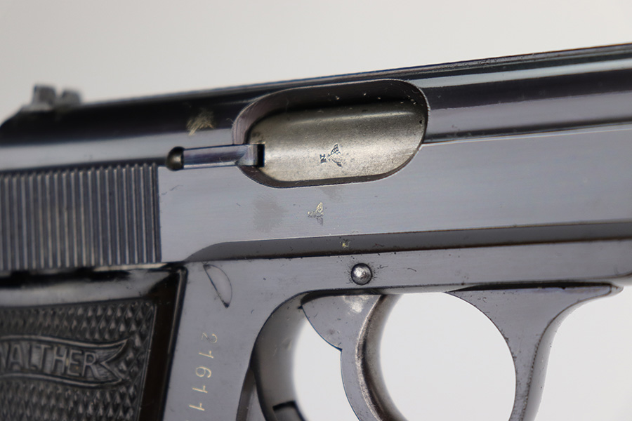 12/13/22 – This is a rare variation, only 1100 issued to the Police in 1940-41. It has the early high polish commercial finish. 60 degree safety and banner only magazine. Finish is at about 97% with some minor “dulling” on the finish of the grip straps. The slide is beautiful with the exception of a few scratches and a rub mark on the right hand side behind the ejector port. Most likely from rubbing something in the holster. It has the correct wartime grips. The matching slide has the proper number (117) etched inside. The Eagle/C marking is double struck. This is very common with the Walther police marks, but the reason I am certain this is an authentic marking is due to the serial. It falls within a very small band of serial numbers where ALL of the guns were E/C marked. This is in the middle of that serial band.
