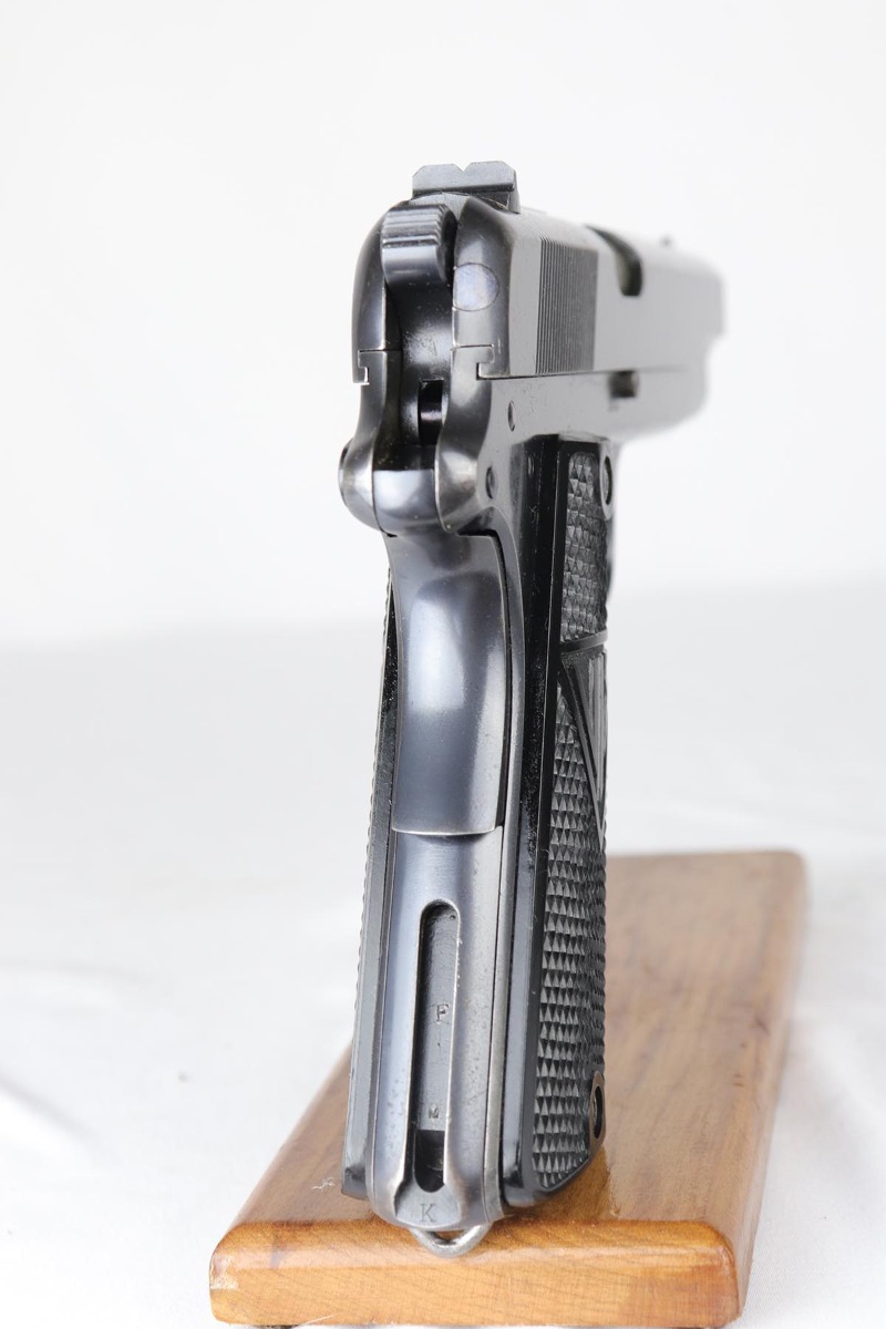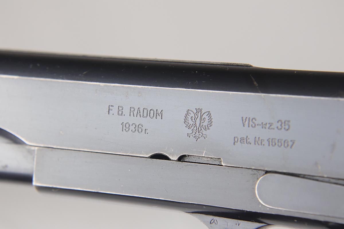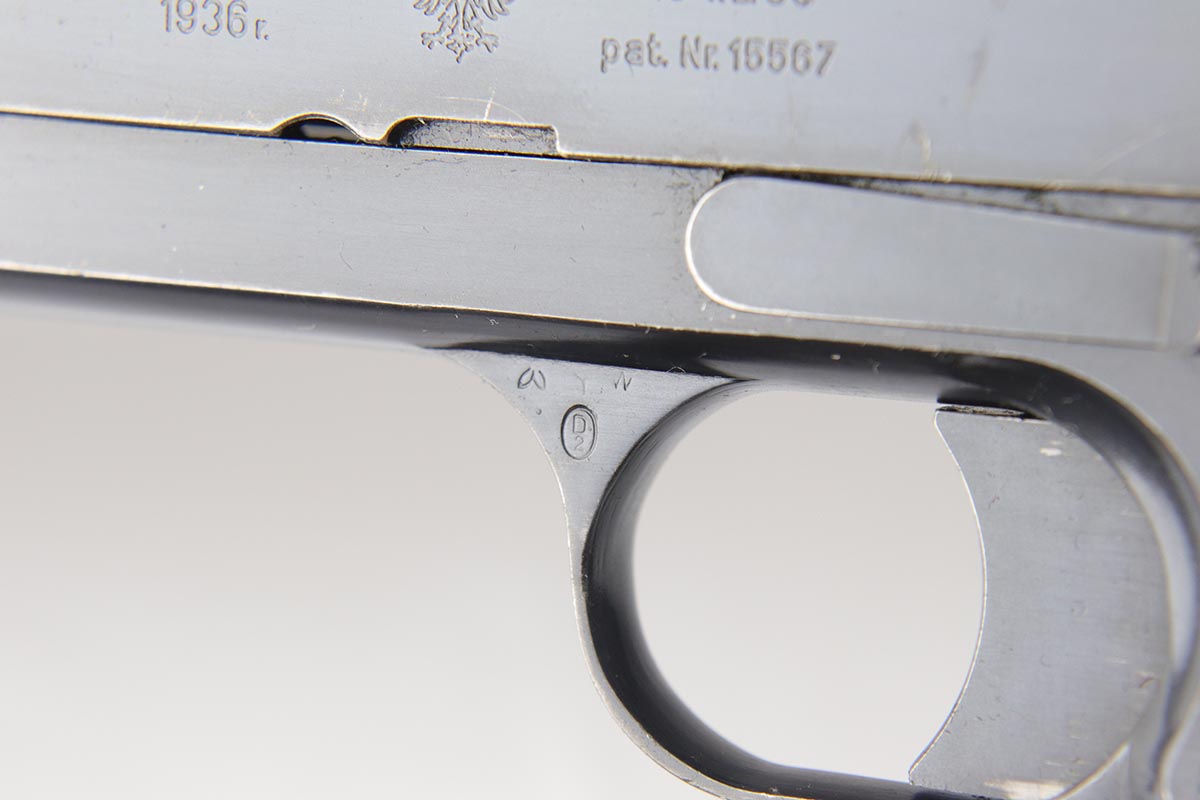 4/10/18 – This is a gorgeous and extremely hard to find Polish Eagle Radom manufactured in 1936. There were only 5,500 of these Radom’s produced in 1936, and this one is on the early end of that range. It’s the 1813th ever made! The original finish rates at 96-97% with minor muzzle wear and edge thinning, as well as a spot of thinning on the front strap and trigger guard. All matching parts. Scarce G2 proofed magazine. Excellent grips and minty bore!