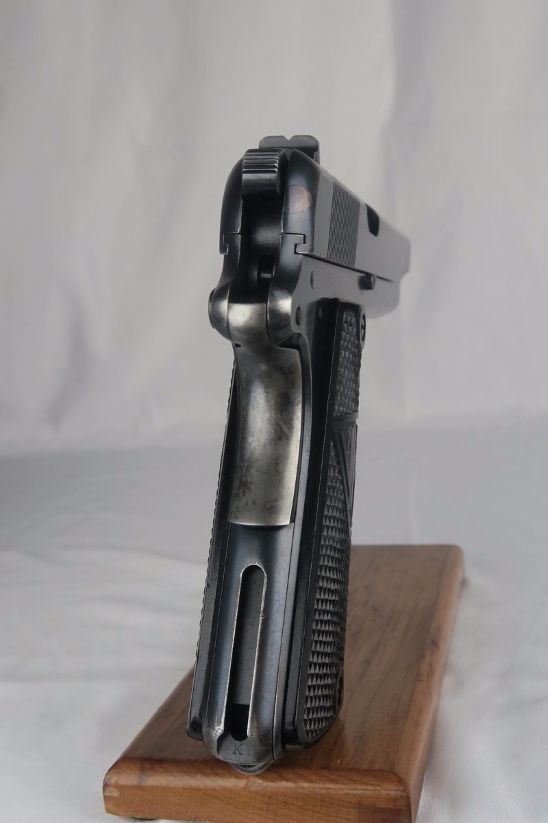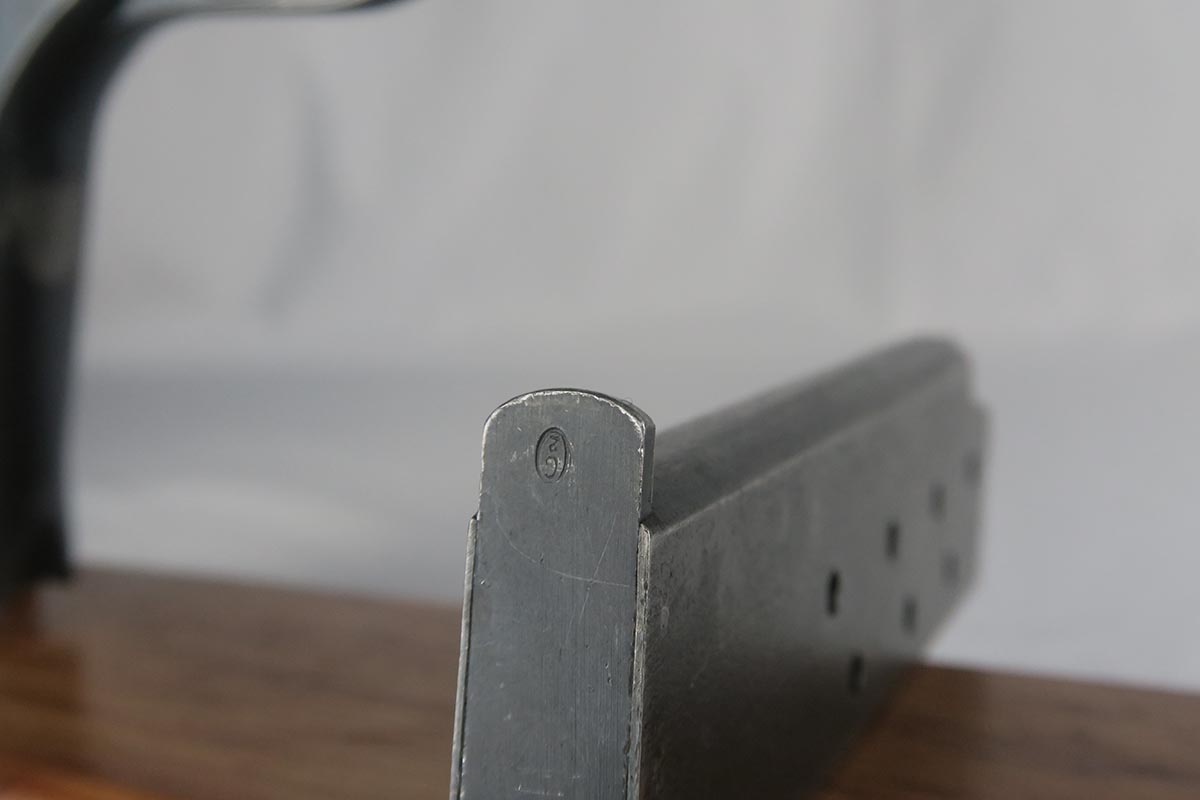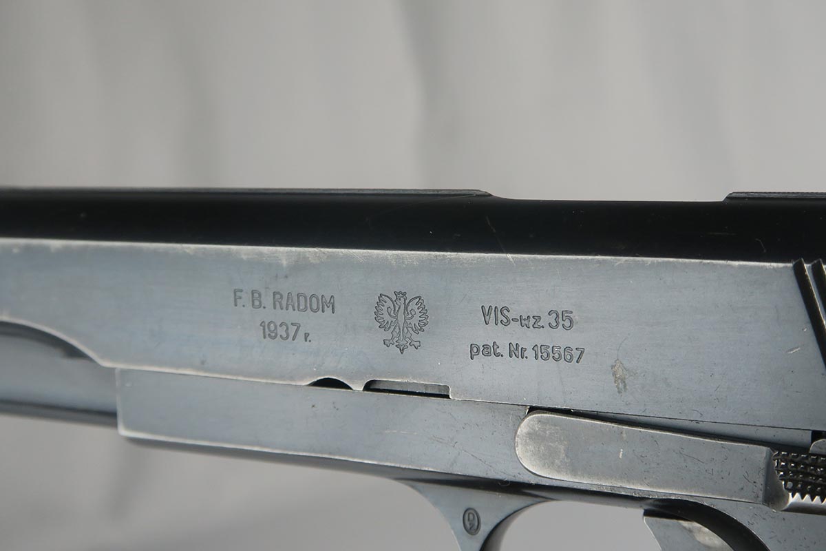 10/17/17 – Here we have one of the rarest World War II era Radom’s: the 1937 Polish Eagle.  There were only 3,300 of this variation produced, compared to the 5,500 1936’s, and ~20,000 each for 1938 and ’39.  This pistol is all matching and correct, including frame, barrel and slide. It is all original with about 90-92% high-polish blue remaining.  The slide is beautiful but the grip safety and front strap show the majority of the finish loss.   The grips are very nice with no major cracks or chips, just a couple dings.  Rare G2 proofed magazine.  Excellent bore.