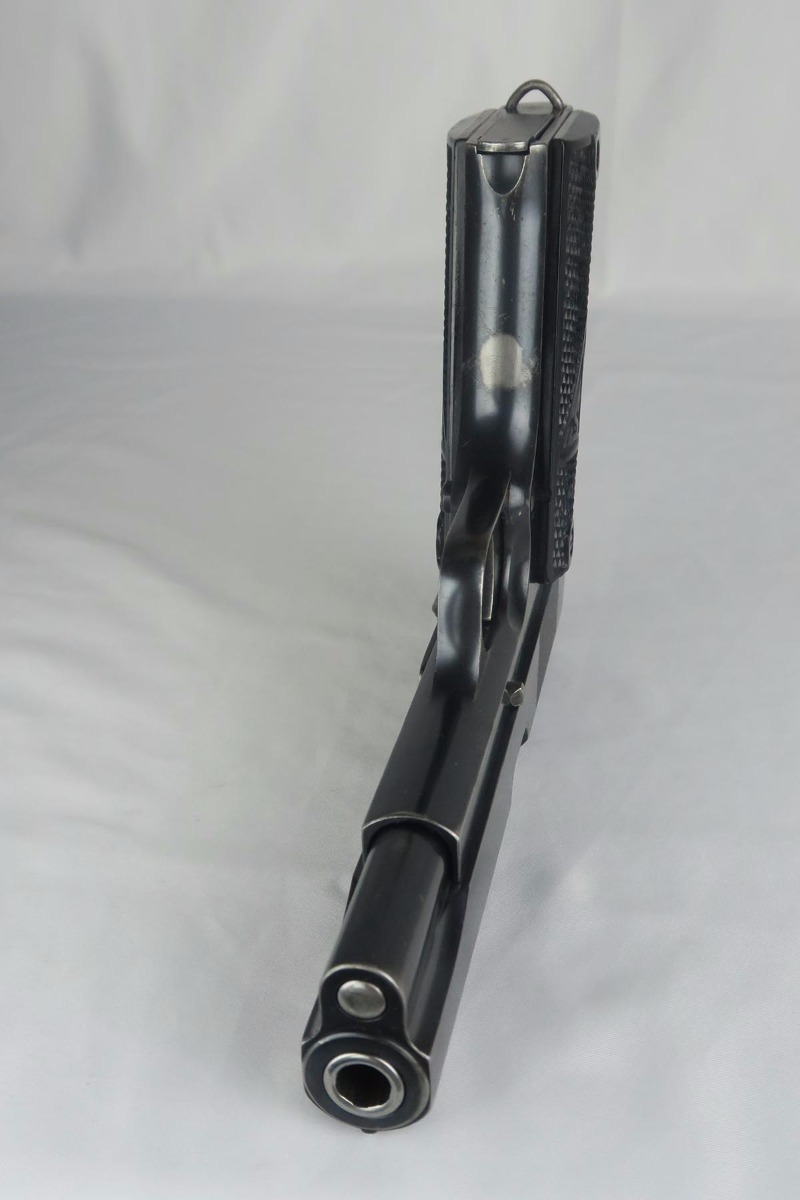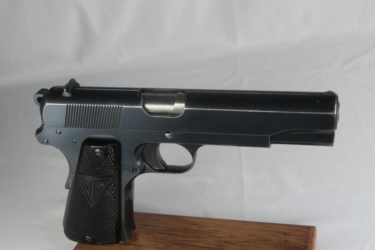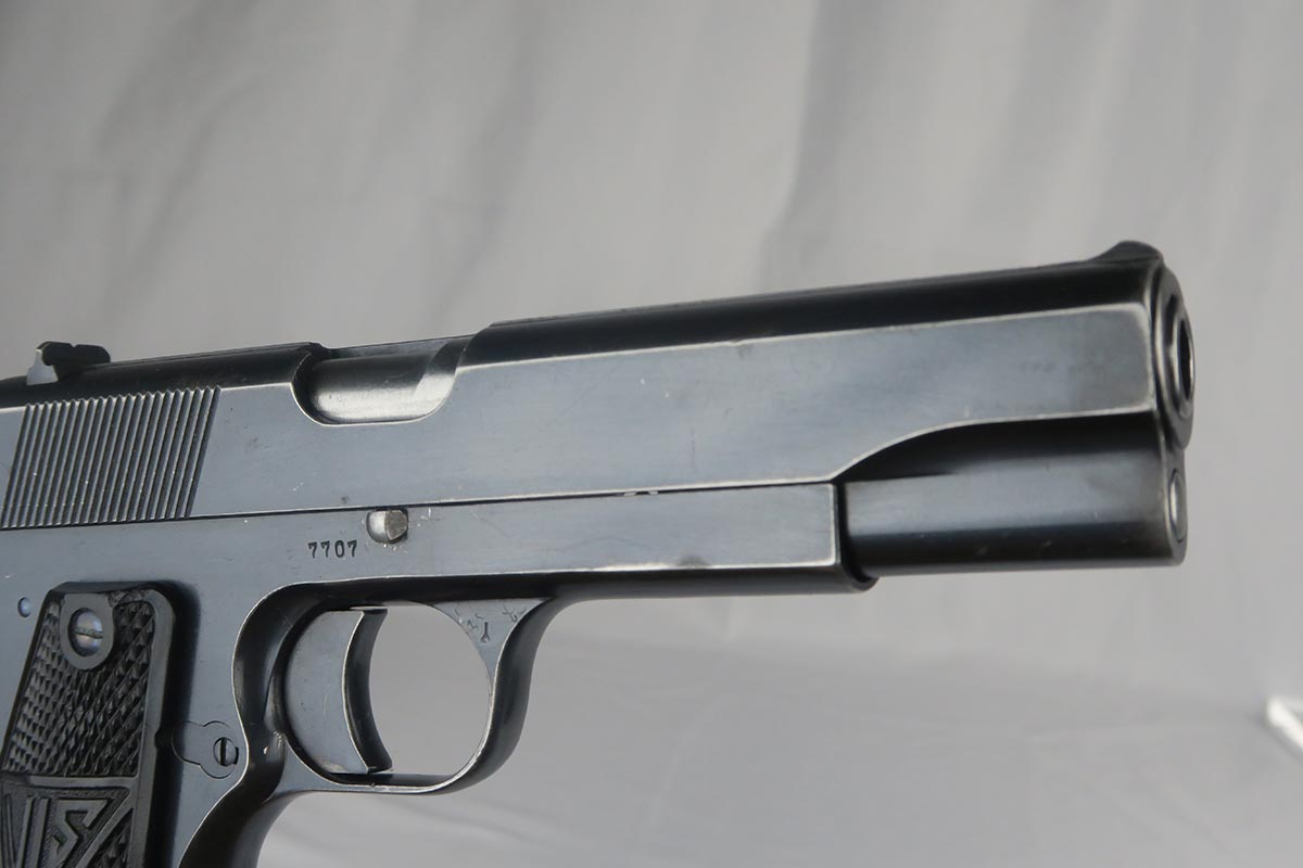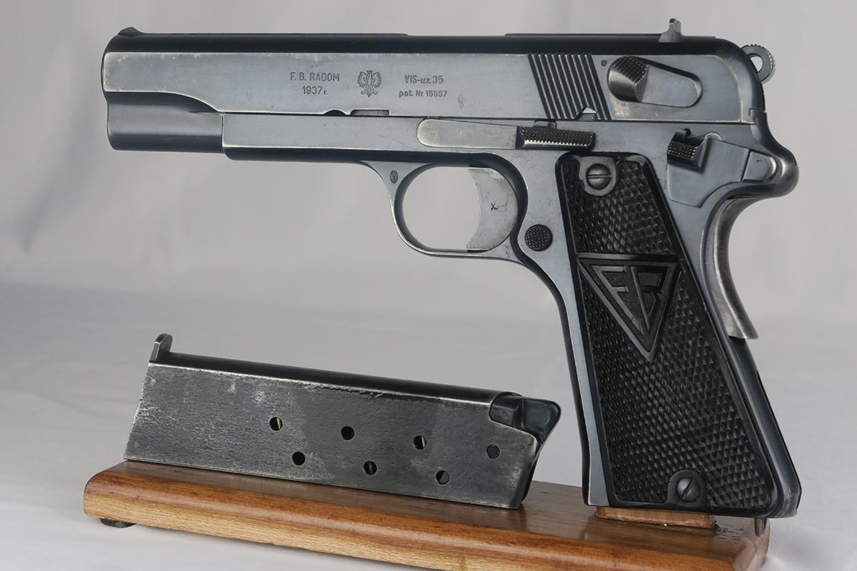 10/17/17 – Here we have one of the rarest World War II era Radom’s: the 1937 Polish Eagle.  There were only 3,300 of this variation produced, compared to the 5,500 1936’s, and ~20,000 each for 1938 and ’39.  This pistol is all matching and correct, including frame, barrel and slide. It is all original with about 90-92% high-polish blue remaining.  The slide is beautiful but the grip safety and front strap show the majority of the finish loss.   The grips are very nice with no major cracks or chips, just a couple dings.  Rare G2 proofed magazine.  Excellent bore.