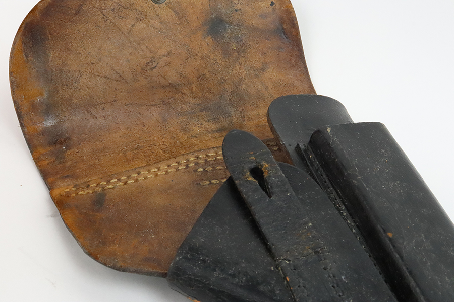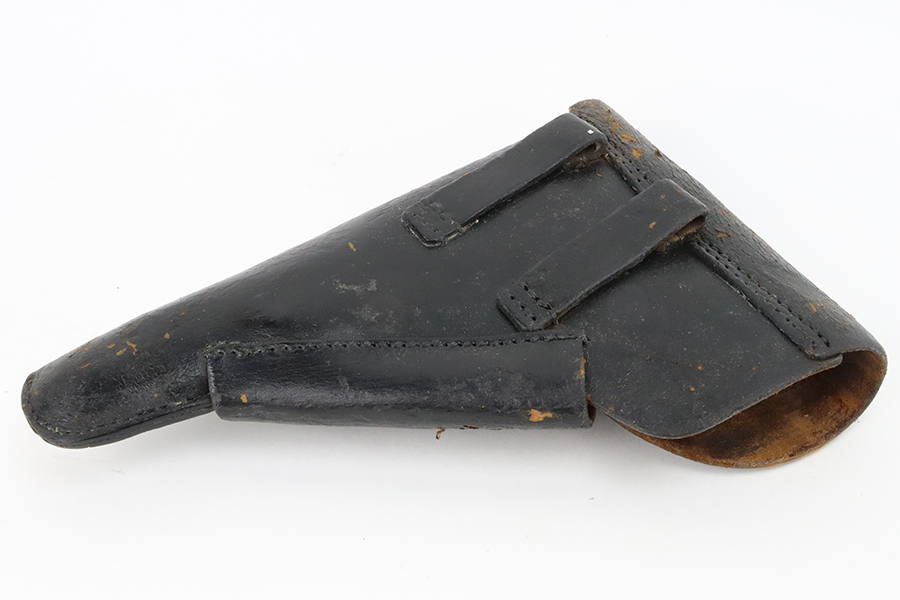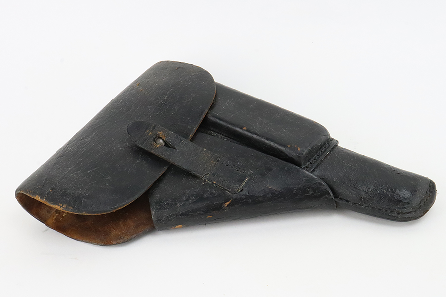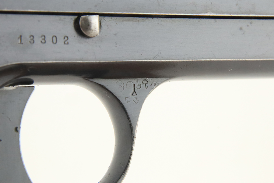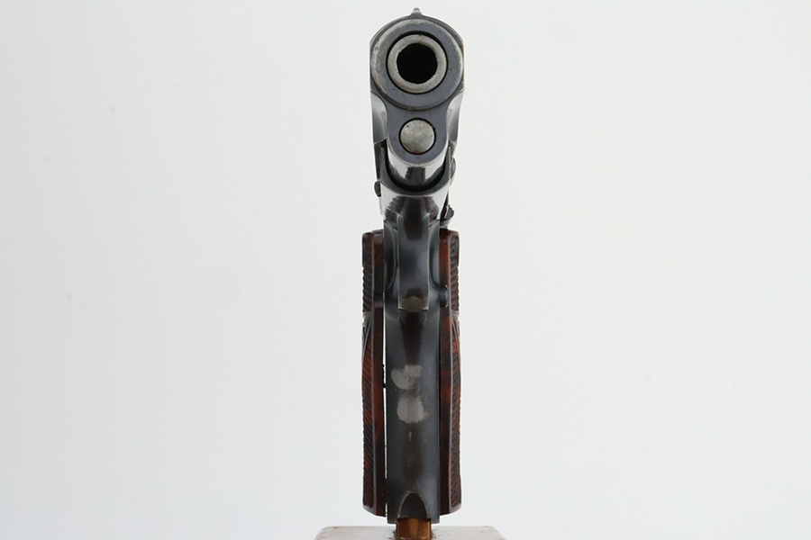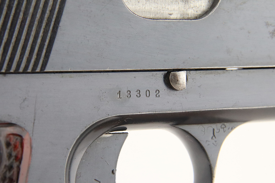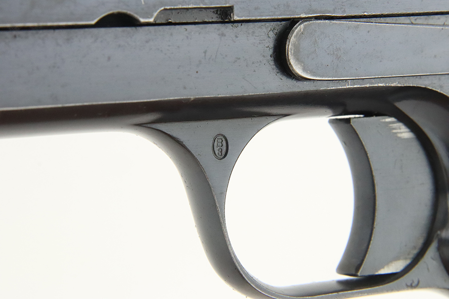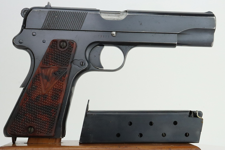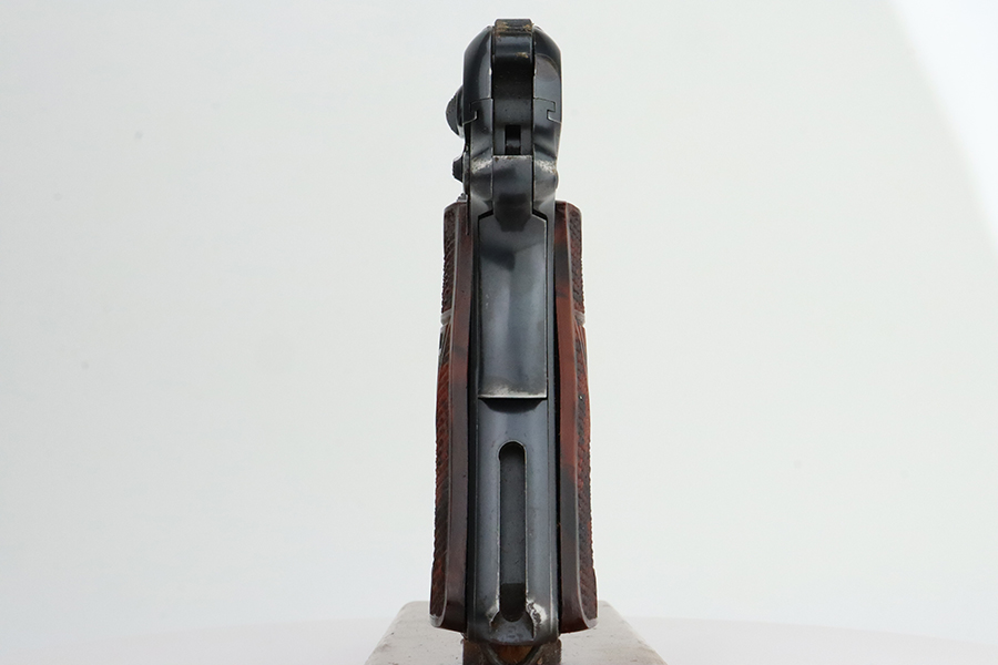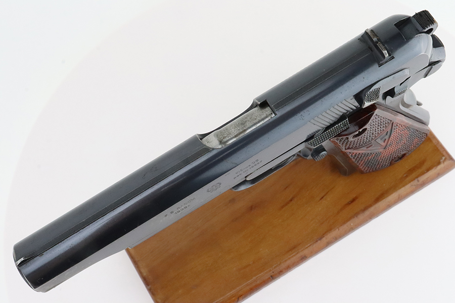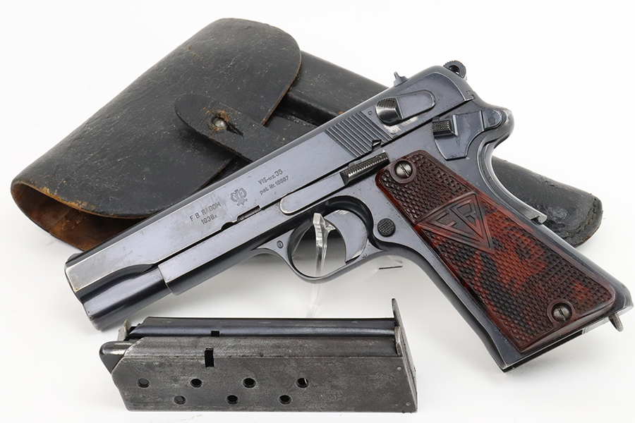 2/7/24 – This is a very nice example of a rare Polish Eagle Radom VIS P.35 that was produced in 1938. Seen as the some of the highest production quality of Nazi era handguns in Europe, this one is no different. It’s all matching and original with 90-92% of the blue remaining. Beautiful profile views, with most of the wear on the trigger guard and front strap, but some on the forward left edge of the slide. Excellent bore. Cool looking but postwar grips with red swirls. The listing includes one wartime magazine, and one spare reproduction. Also comes with a worn P.38 holster.