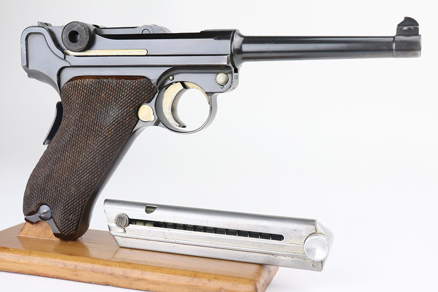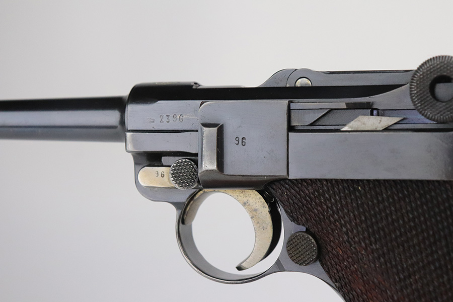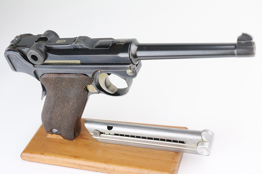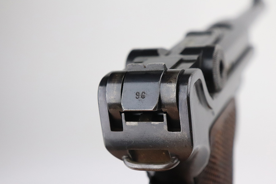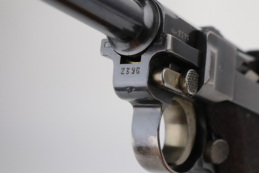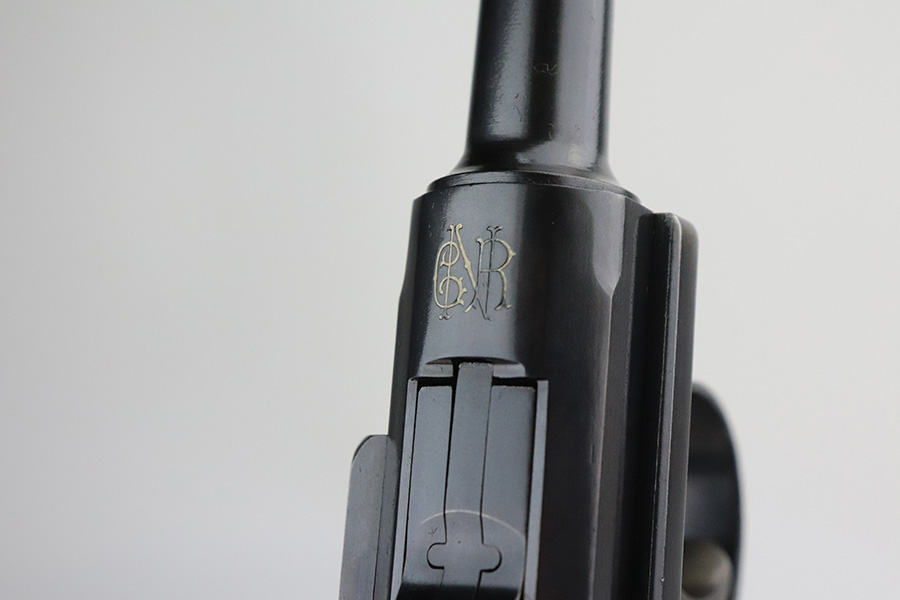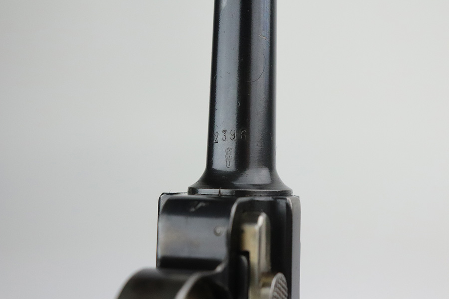 7/27/21 – This is an excellent example of a rare Mauser Banner Luger that was made under contract with the Portuguese government. It is all matching and has the proper Portuguese “GNR” (Guarda Nacional Republicana) marking on the chamber. These lugers were largely unheard of in the collector market for a long time, as only 564 were produced! This is a well documented series of exactly 564 guns from 1921v through 2484v. This model has the 1906 old style frame with grip safety, no stock lug and fast taper barrel. These were made specifically for the Portuguese “Republican National Guard”. This particular example has retained somewhere between 93-95% of its finish. There is wear and spotty oxidation at the base of both straps. A spot of minor wear in the center of the front strap. There is minor wear on the side plate, side rails, and around the muzzle. Very minor pin-pricking on the high edges of the side plate. Comes with excellent grips and an un-numbered aluminum magazine. The bore is excellent – shiny with strong rifling.