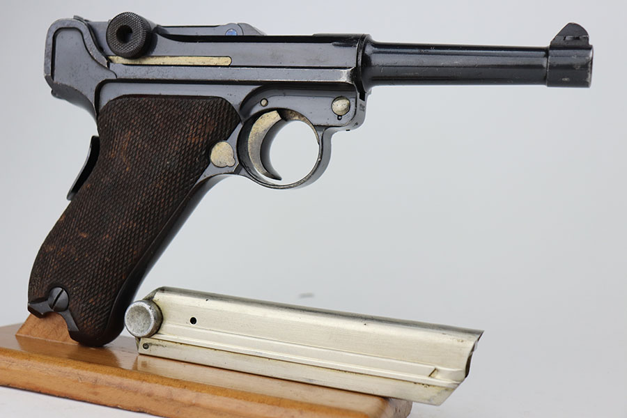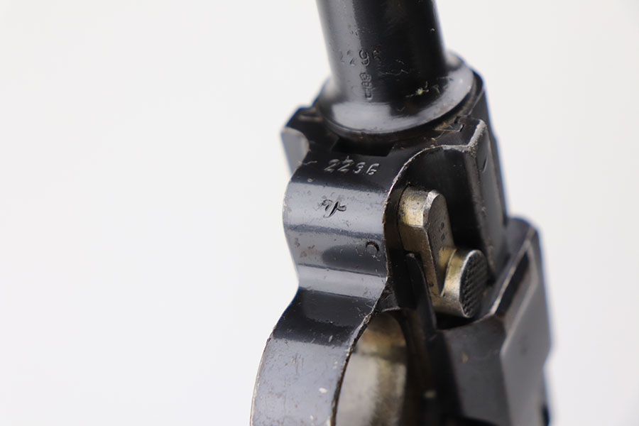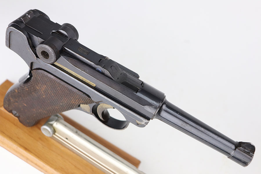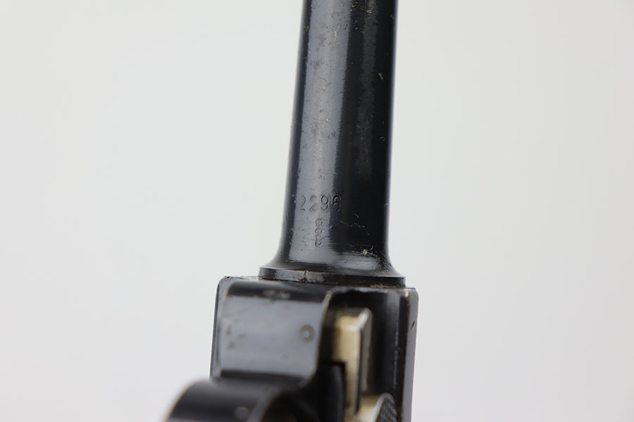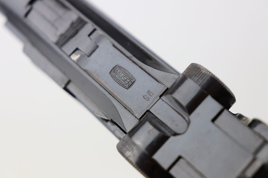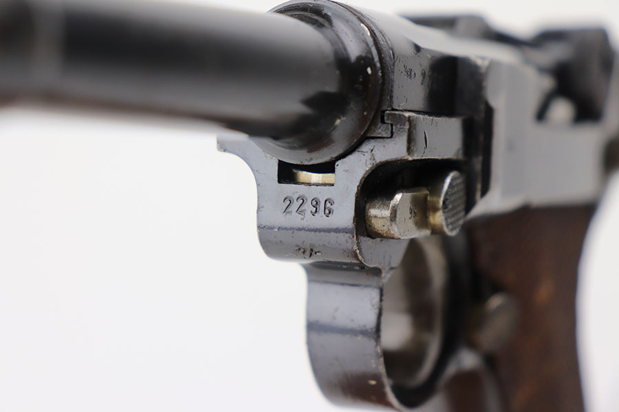 3/26/21 – This is a rare 1906/34 Portuguese Mauser Banner luger.  The original finish rates at about 95% with some finish loss on the muzzle and sideplate, and some patina on the grip straps.  It is all matching on the small part. Grips are unmarked, and the magazine is a rare K Date example but obviously mismatched to the gun. Crown/U proofed.  Lower safety position is marked “Seguranca” and extractor is marked “Carregada”.  There were only ~500 of this variation produced for the Portuguese contract, and this is the earliest reported serial number. Strong, shiny bore.