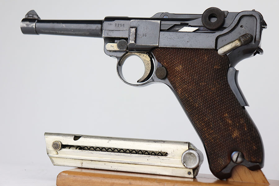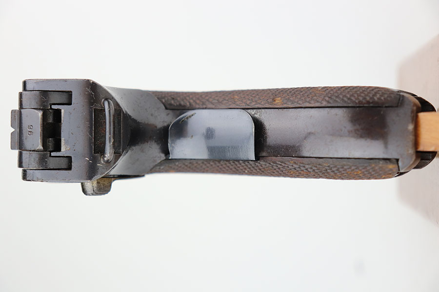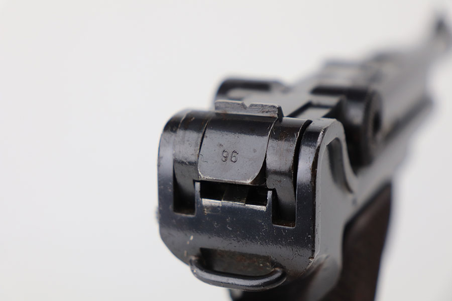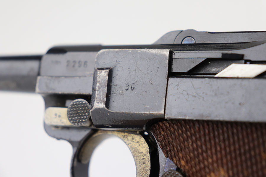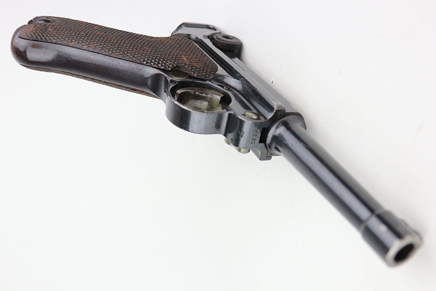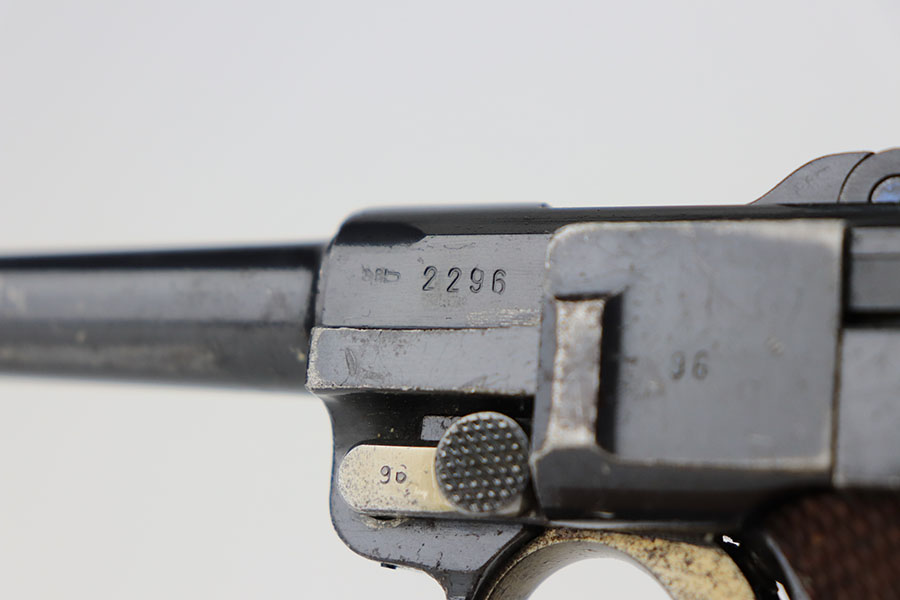 3/26/21 – This is a rare 1906/34 Portuguese Mauser Banner luger.  The original finish rates at about 95% with some finish loss on the muzzle and sideplate, and some patina on the grip straps.  It is all matching on the small part. Grips are unmarked, and the magazine is a rare K Date example but obviously mismatched to the gun. Crown/U proofed.  Lower safety position is marked “Seguranca” and extractor is marked “Carregada”.  There were only ~500 of this variation produced for the Portuguese contract, and this is the earliest reported serial number. Strong, shiny bore.
