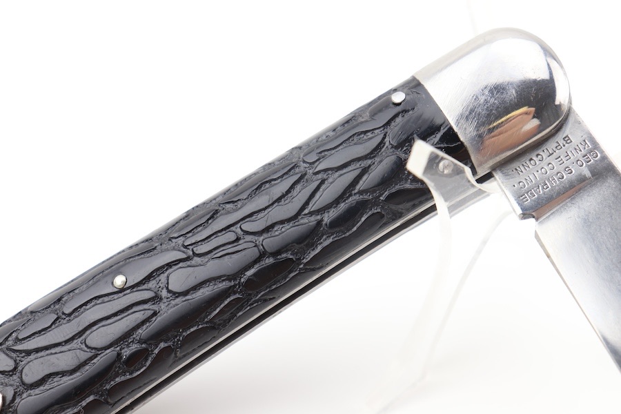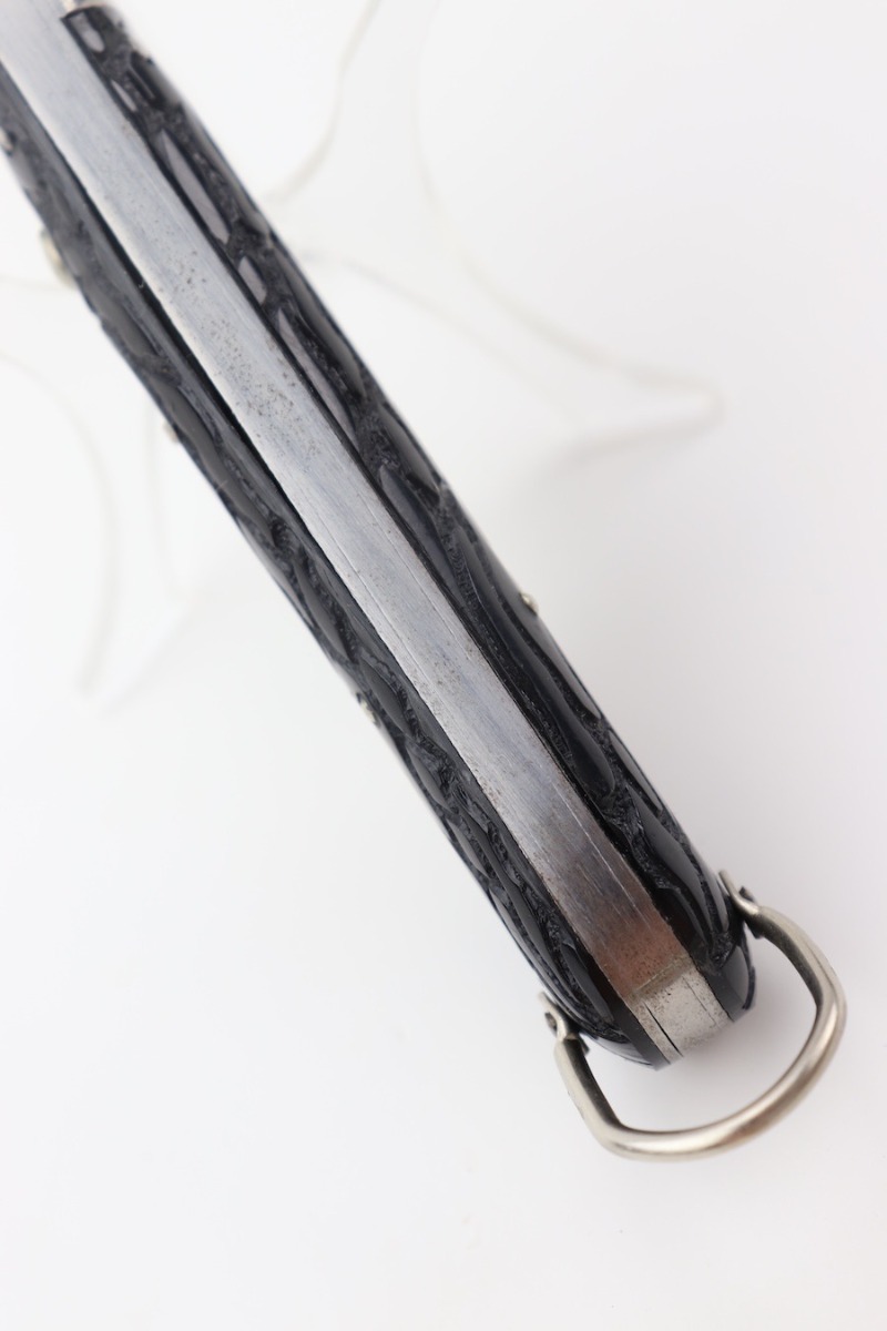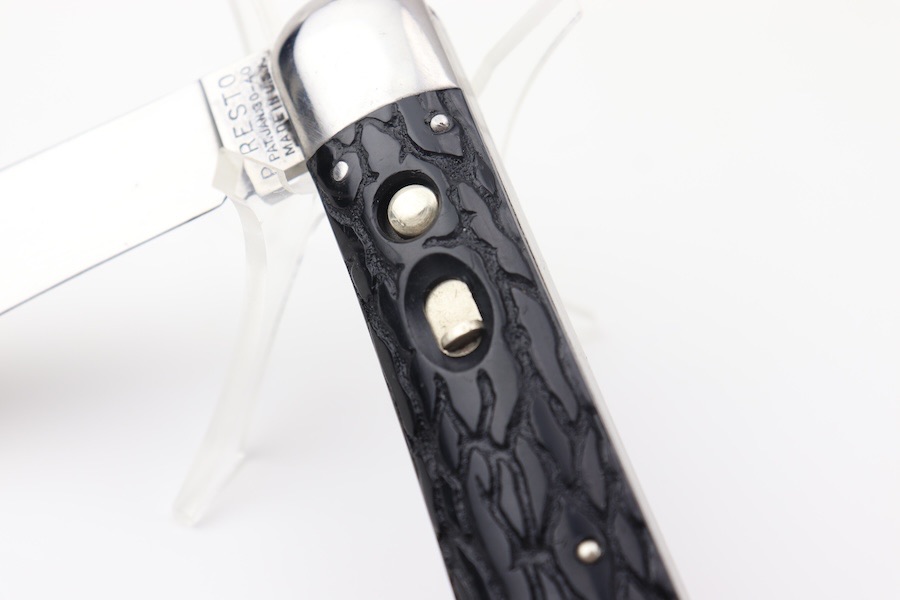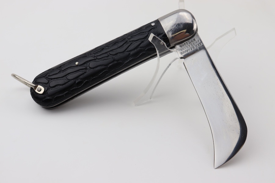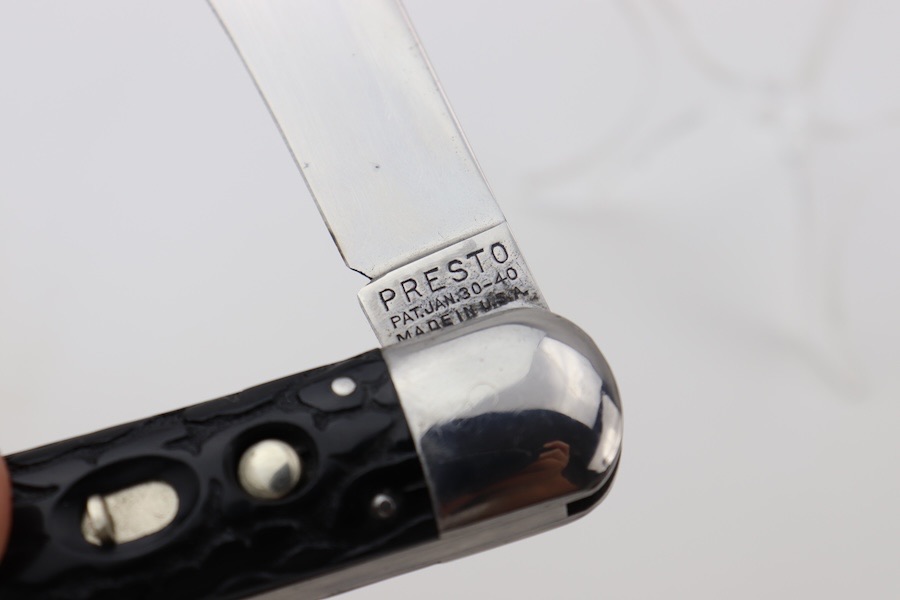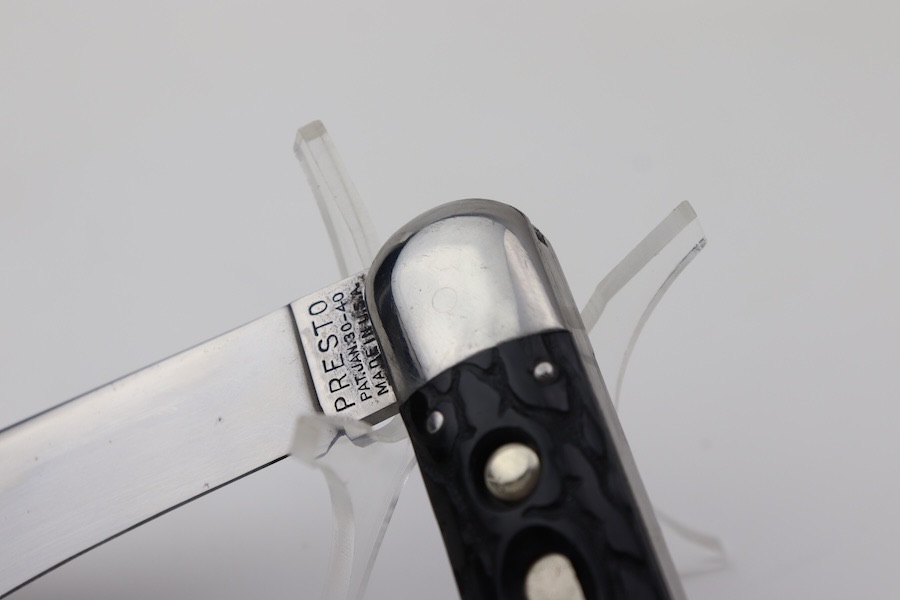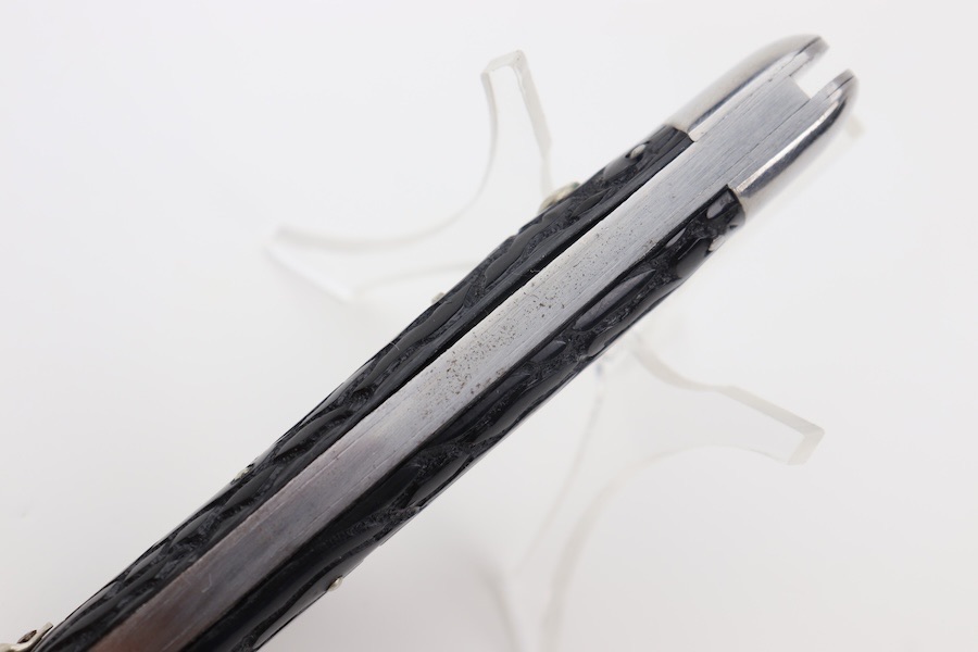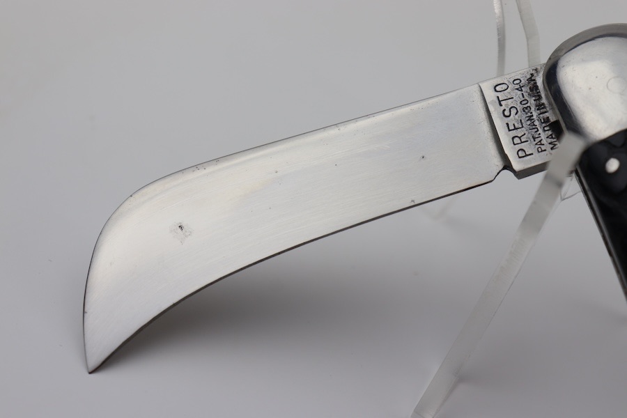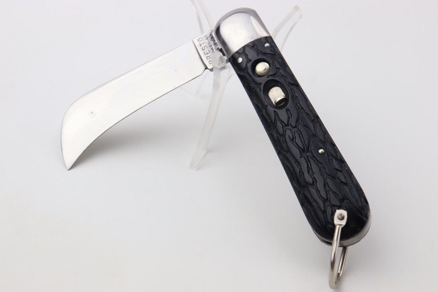 2/27/24 – This is an extremely rare WW2 Parachutist M2 spring-assisted knife. The knife is the “pruning style” that the US military experimented with as this style / shape of blade was thought to be more efficient for cutting a jumper loose from their parachute. The idea didn’t catch on, and the result is only a few hundred of these ever being produced. The blade is sharp and excellent with no signs of sharpening and very minimal amount of wear. The spring / mechanism is strong and fully functional. A very cool piece of US military history.