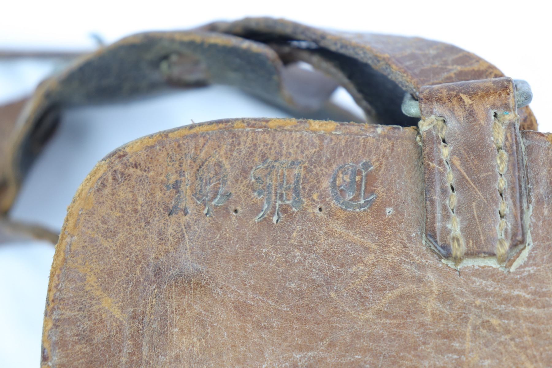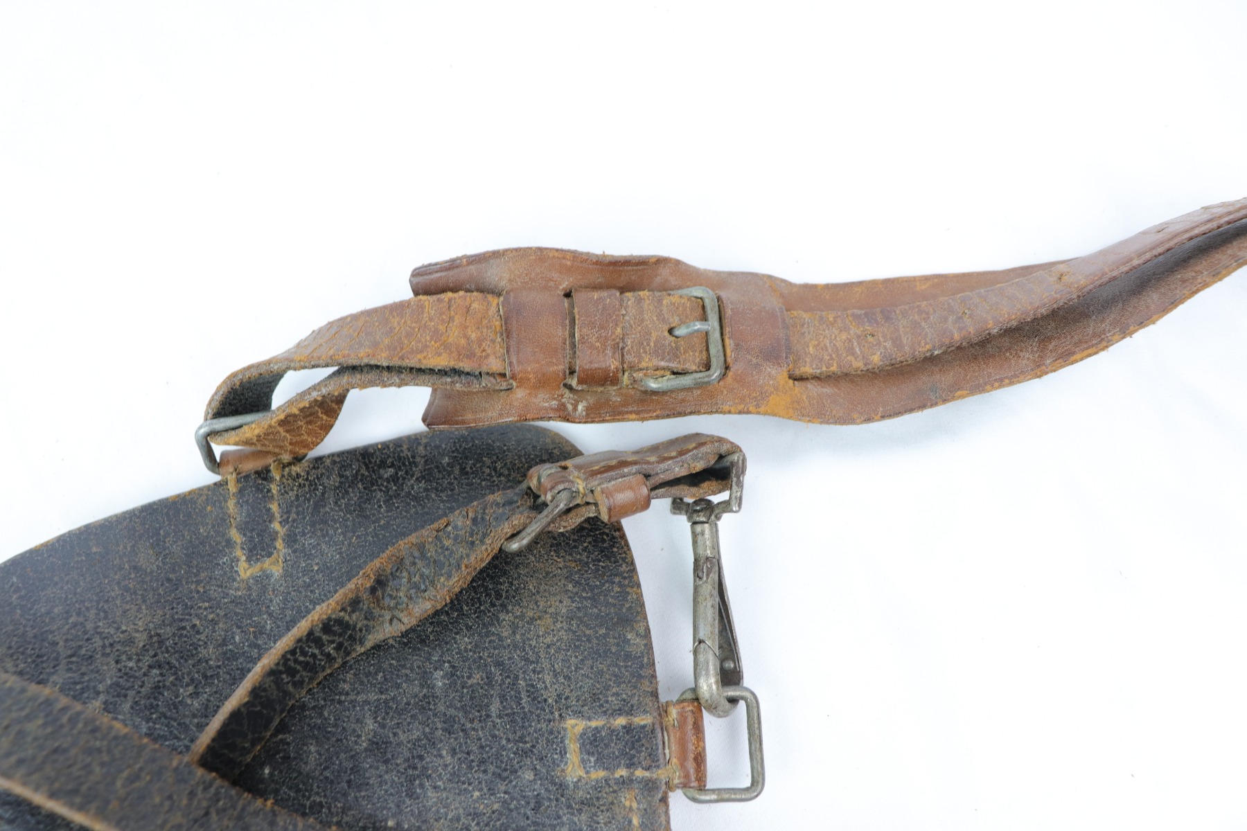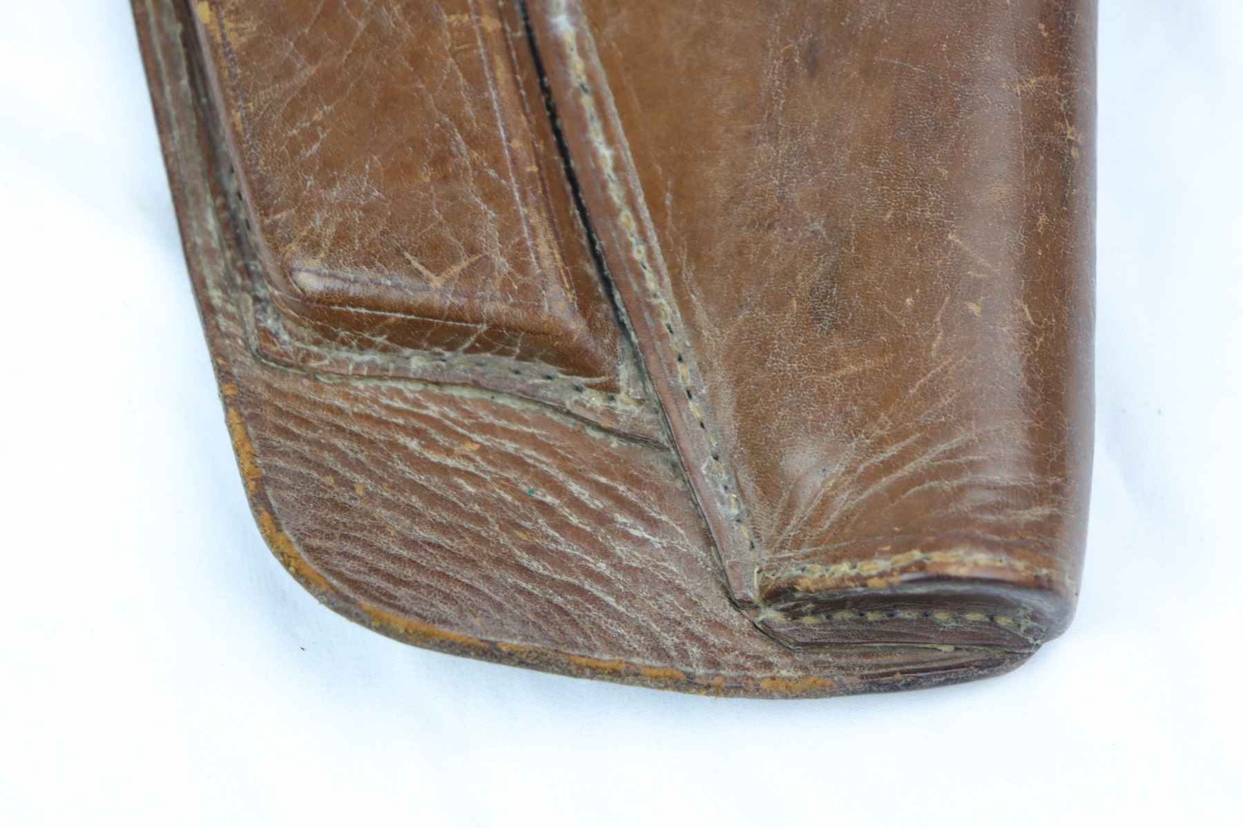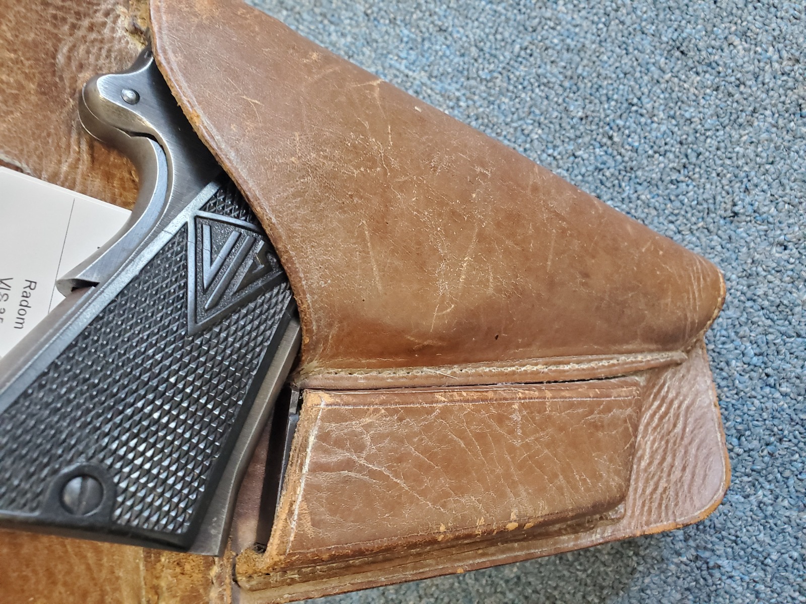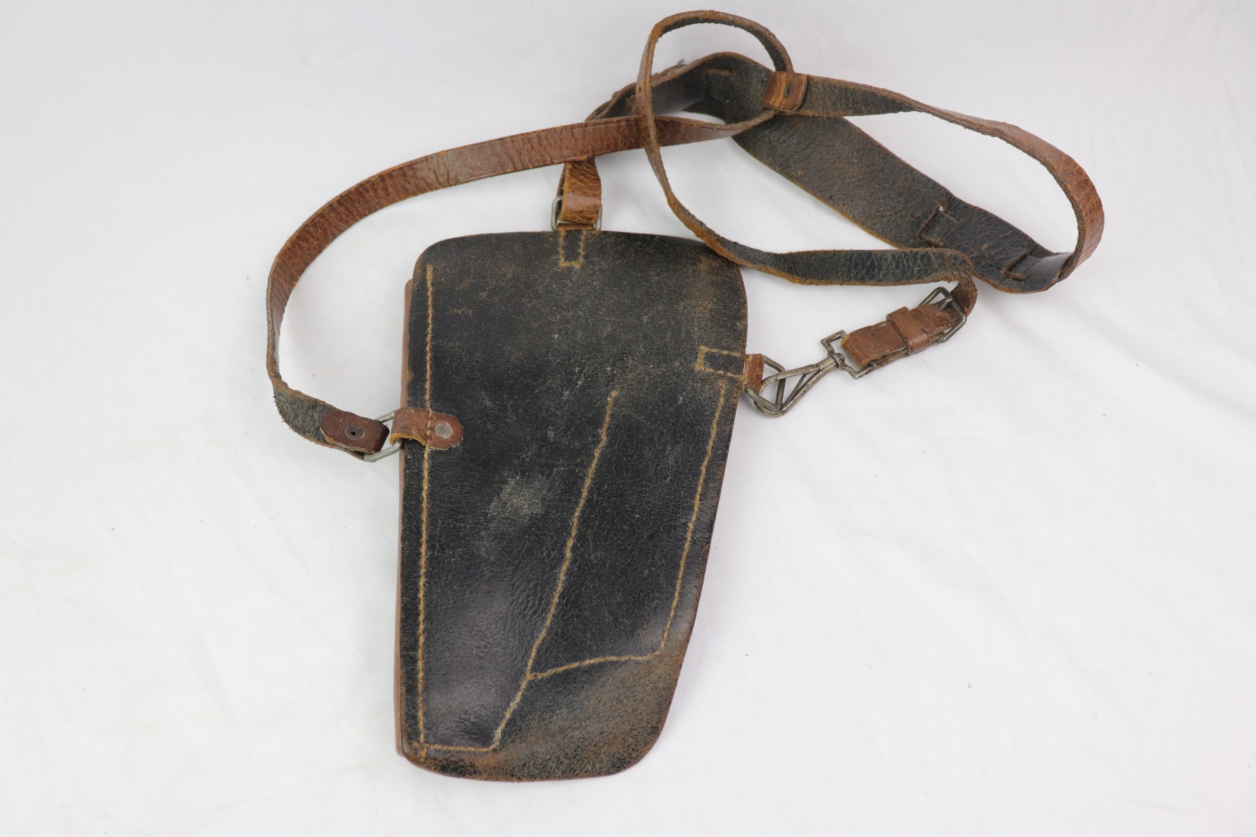 8/10/20 – This is a very scarce shoulder holster for a Radom pistol. The holster is stamped on the front with initials that are a German scriptic font. No other markings. A fellow collector appraised this and concluded these were found with panzer tank divisions as they often only had room for shoulder holsters inside the tanks. The holster is definitely WW2 style and shows considerable aging and surface wrinkling throughout, but is completely in tact. All original leather and stitching. A fairly unique piece of history and unlike many we see. Shoulder strap is strong and completely in tact.