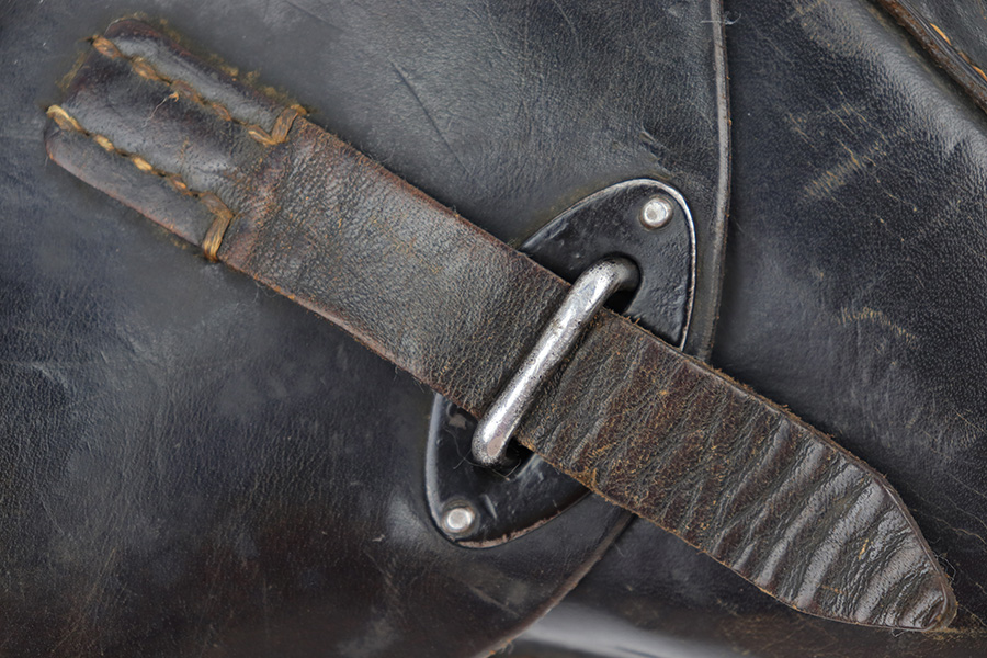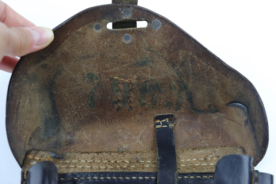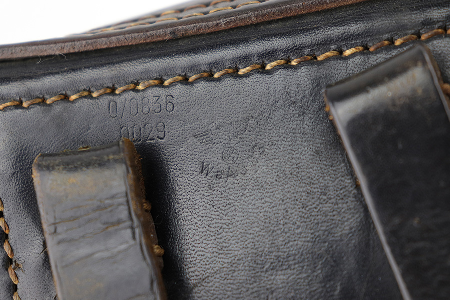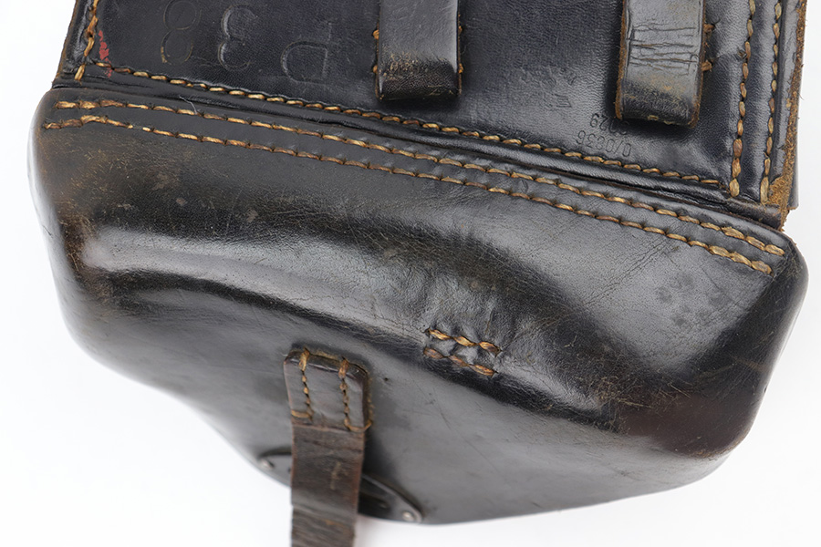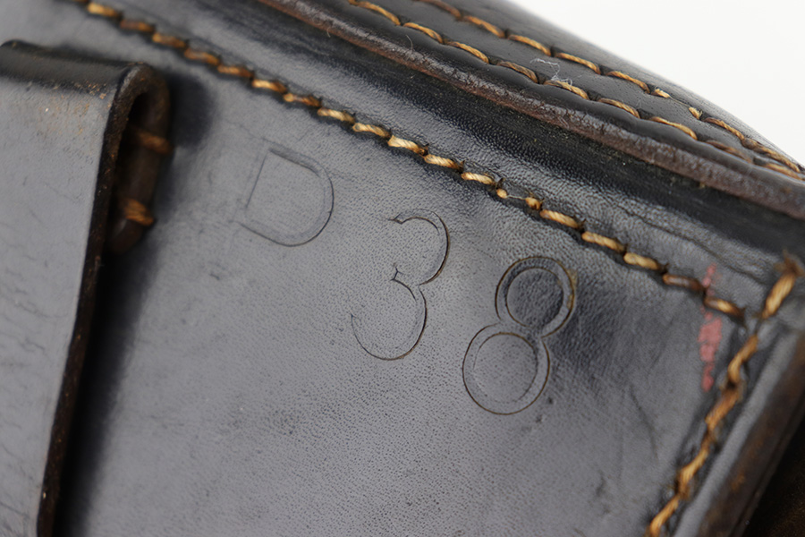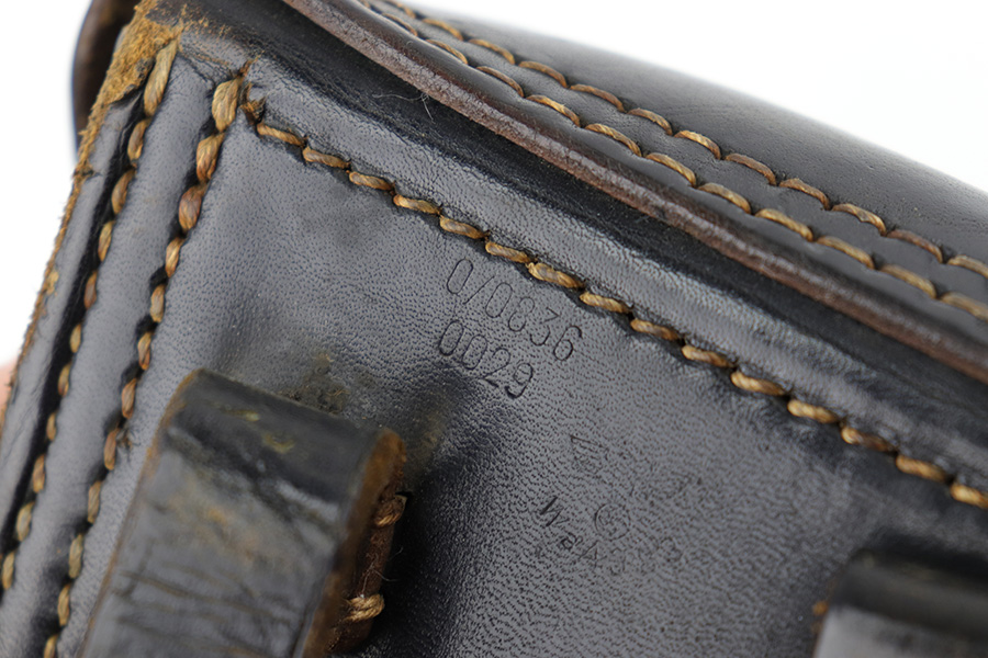 7/14/23 – This is an original late WW2 production, rare hard shell style P.38 holster. The holster is stamped on the back leather with a RBNr. code, which reportedly corresponds to Hans Beuter Koffer-Rucksack (known as bmo) and 1944 production. Late war hard shell holsters are very rare as the Germans switched to soft shell style in 1943. This example is in great condition with normal pliability and some mild surface wear on the exterior leather. There’s light scratches and wrinkling but no major issues. The stitching is all tight, original, and intact. The back leather is also waffen proof stamped and P.38 stamped.