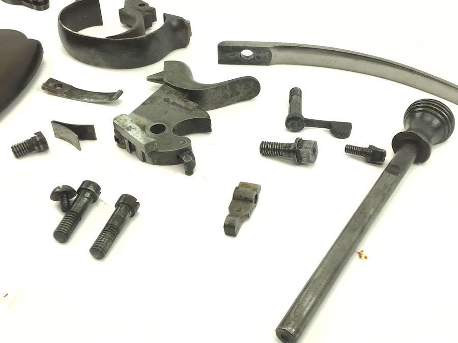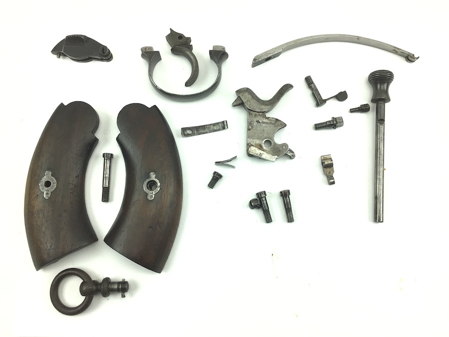 3/21/22 – Original and great condition. Rare, Reichsrevolver Model M1879. Parts kit and wooden grips. The grips and most parts are matching numbers “76”, including the grip screw. German service revolver used by the German Army from 1879 to 1908, when it was superseded by the Luger. All useable pieces. Very hard to find.