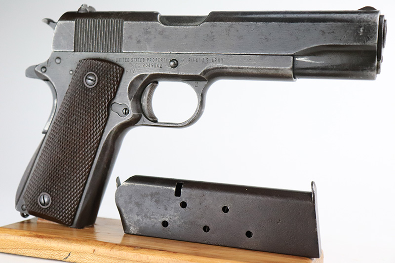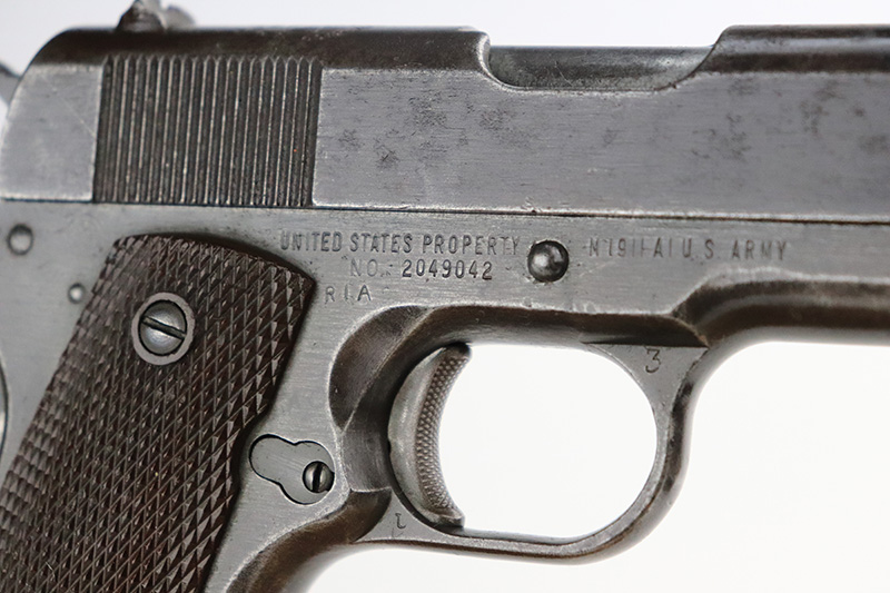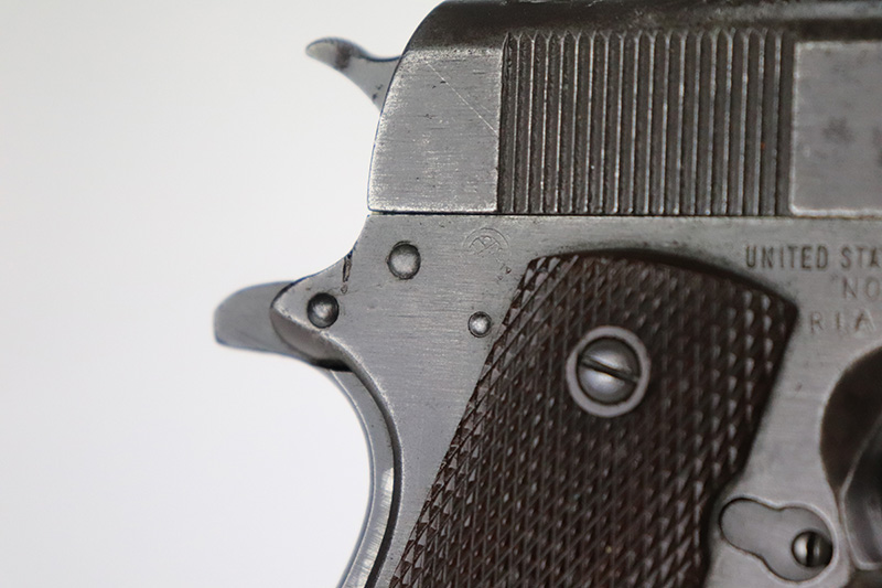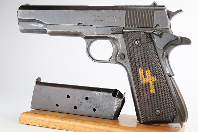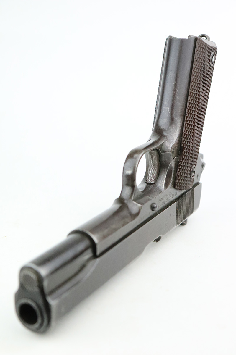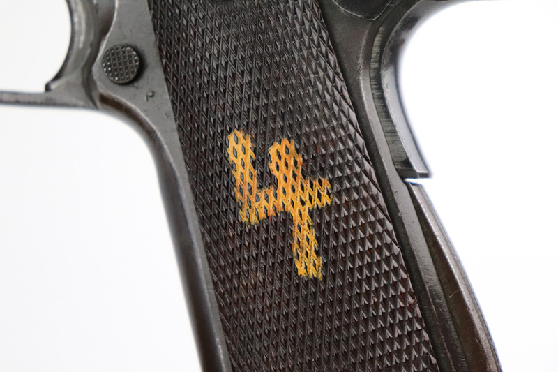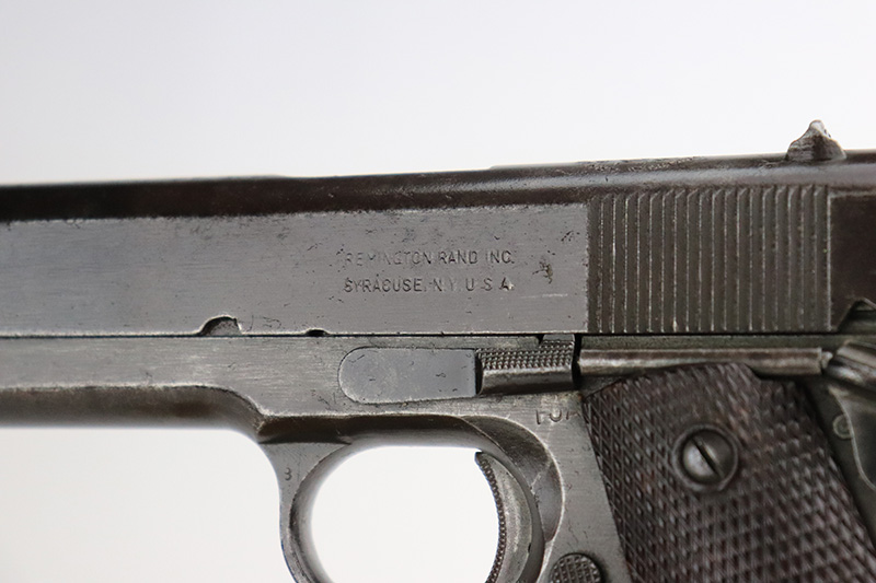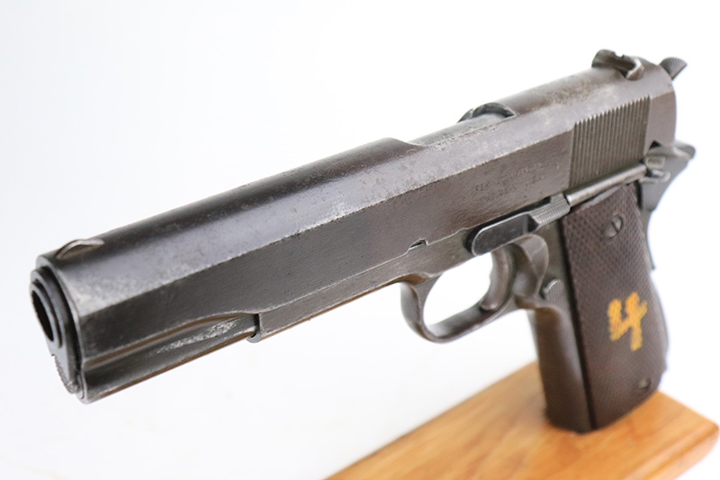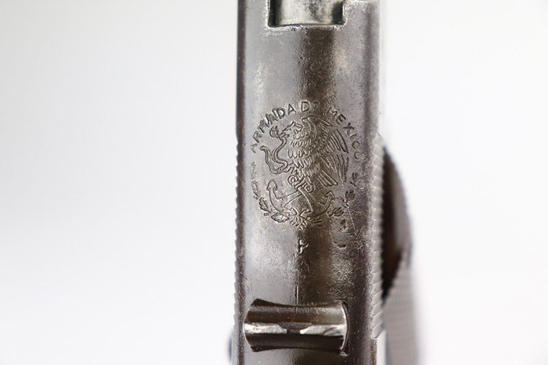 8/25/22 – This is a rare and interesting Remington Rand 1911A1 with crest on top of the slide indicating issue or presentation to the Mexican Navy. The crest reads “Armada de Mexico” and shows an eagle holding a snake in its mouth with crossed naval anchors in its talons. We were unable to find much information on this variation, with just a few similar examples previously shown/offered on the internet. The marking does appear aged similarly to the slide and does appear to match the other examples. The finish on the pistol is original but there is pitting in various areas, especially on the slide. Original HS barrel. ‘L’ marked magazine that also has pitting throughout. The bore has fair rifling but there is some pitting and frost throughout.