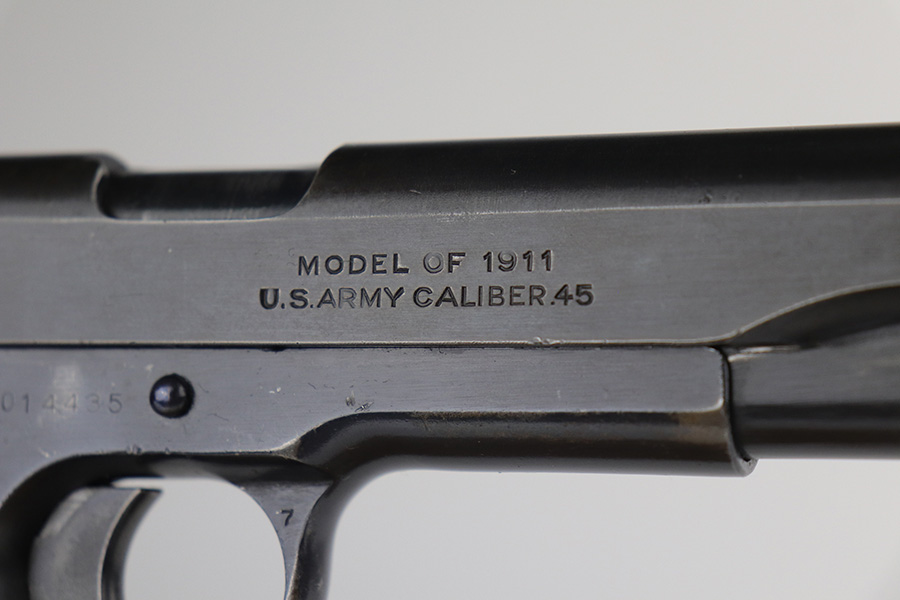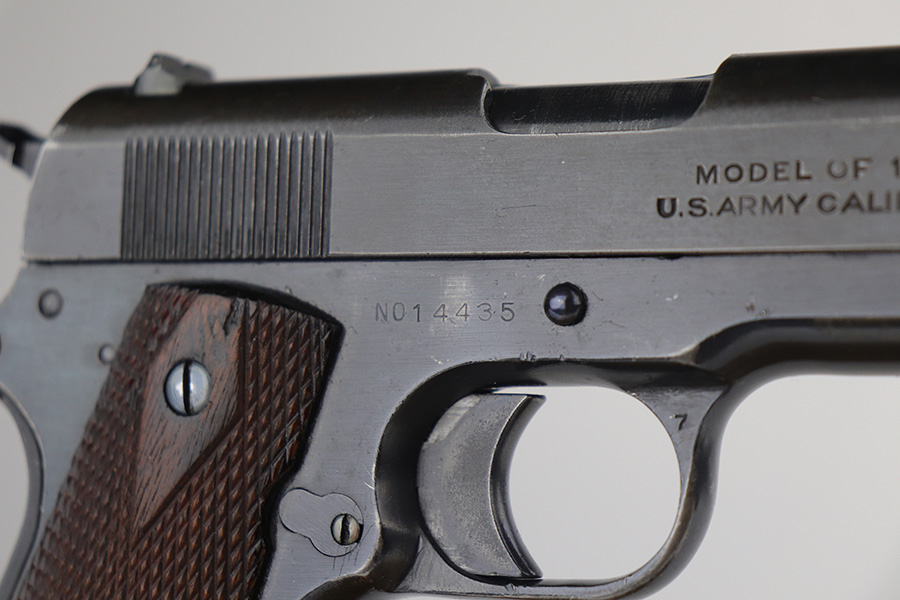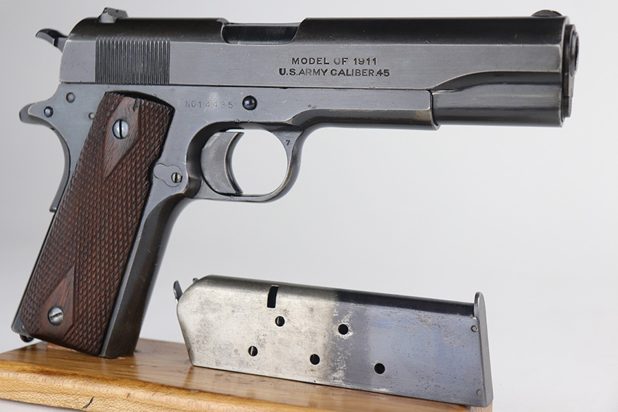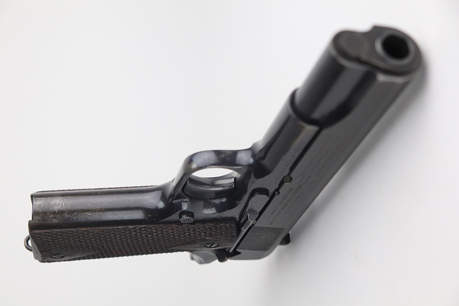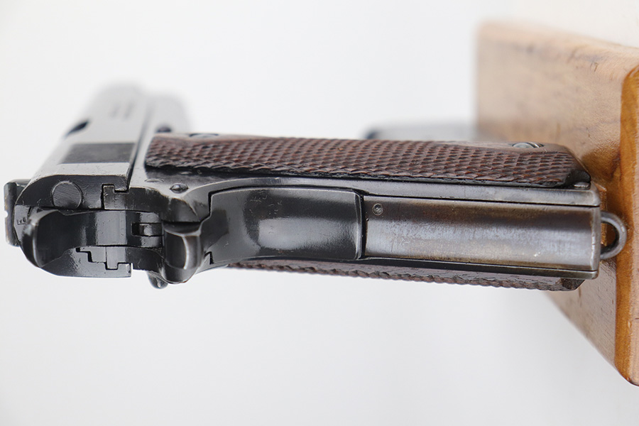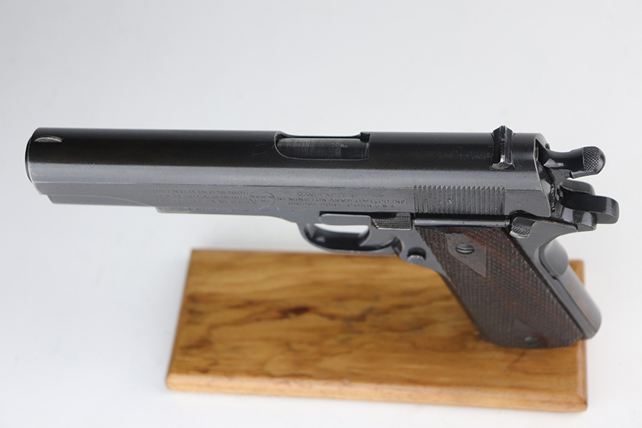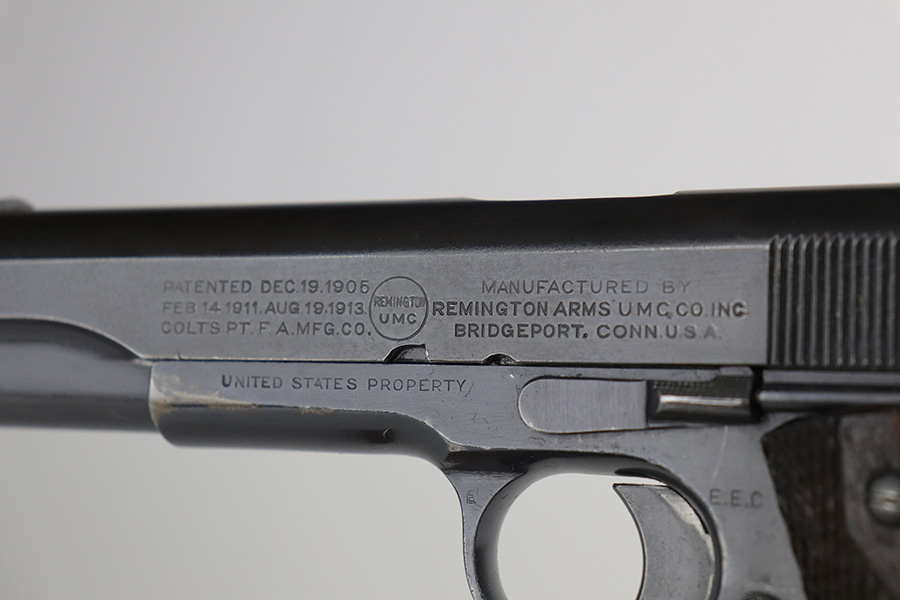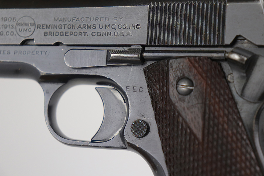 11/18/21 – This is a rare Remington UMC 1911 in all-original configuration.  Of the three manufacturers of U.S. Military 1911 pistols, the Remington-UMC is the least common with only ~21,000 produced.  This pistol is a second-year Remington UMC production (1919), with proper E.E.C. inspectors marking on the left side of the frame.  Major Edmond E. Chapman was responsible for the entire Rem-UMC production.  Below his mark is an Eagle/28 proof.  The slide is marked with the ‘E’ above the firing pin stop.  Barrel chamber is marked with a single “P”, which is correct for Remington-UMC production. This particular gun has about 85% of the blue remaining, with wear on the front edges of the frame, trigger guard, front strap and mainspring housing. The bore is terrific with minimal signs of use. Very nice grips with crisp checkering and no cracks or chips. Two-tone magazine.
