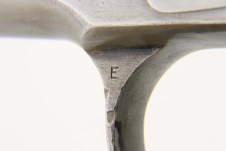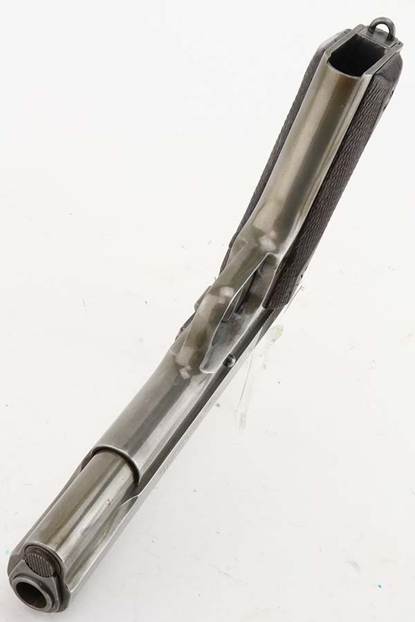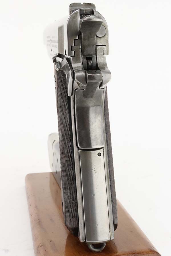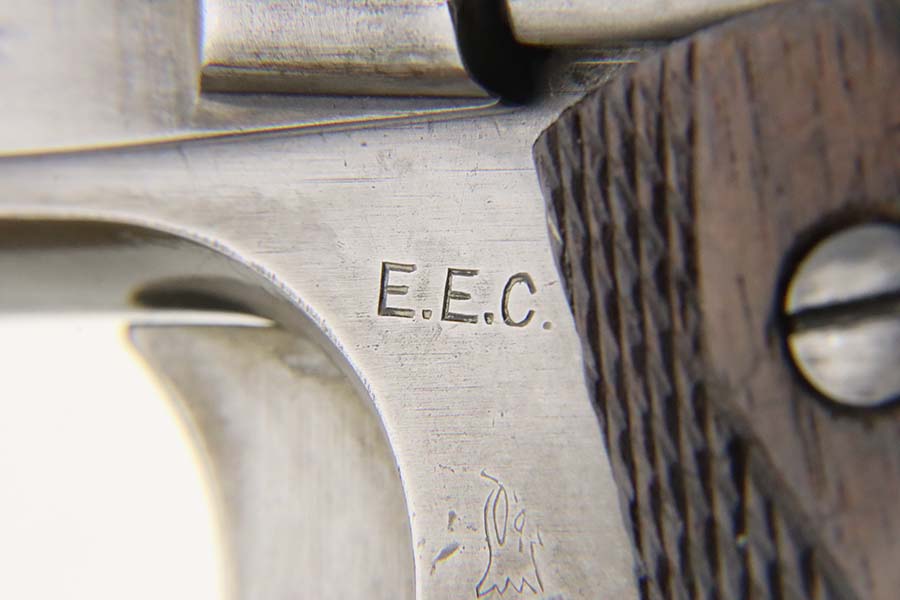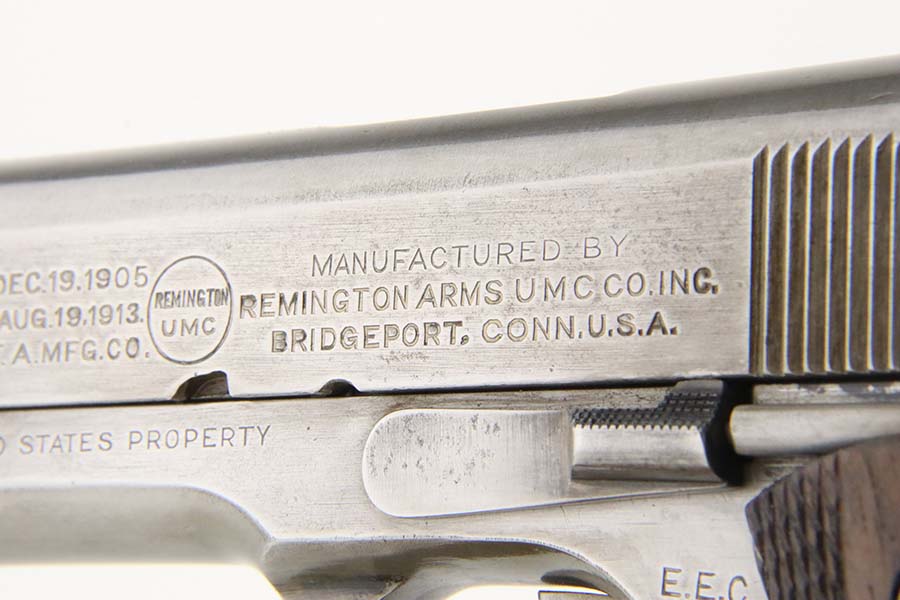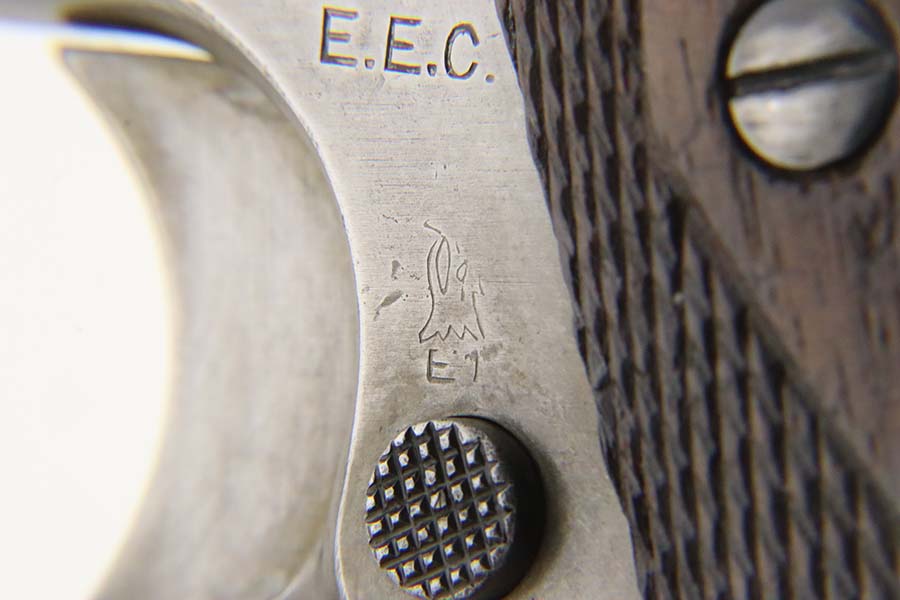 3/6/24 – This is a rare Remington UMC 1911. Of the three manufacturers of accepted U.S. Military 1911 pistols, the Remington-UMC is the least common with only ~21,000 produced. This pistol is a first-year Remington UMC production (1918), with proper E.E.C. inspectors marking on the left side of the frame. Major Edmond E. Chapman was responsible for the entire Rem-UMC production. Below his mark is an Eagle/1 proof. The barrel is High Standard. The gun has lost virtually all of its finish. Fitted with period-correct wood grips and comes with a proper two-tone magazine. Excellent bore.