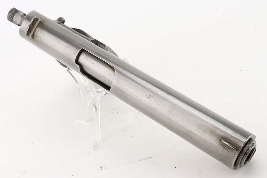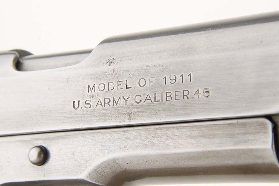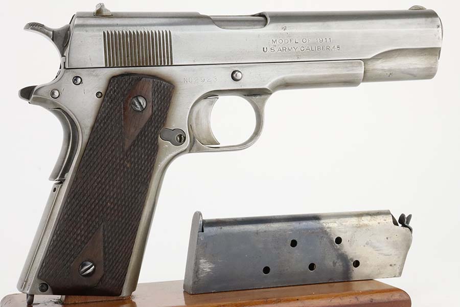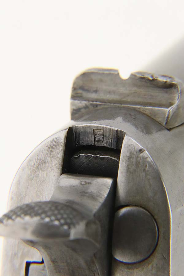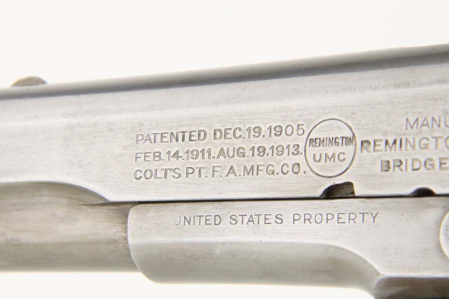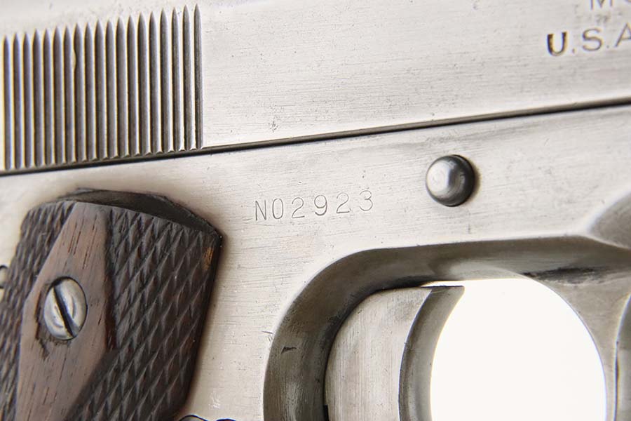 3/6/24 – This is a rare Remington UMC 1911. Of the three manufacturers of accepted U.S. Military 1911 pistols, the Remington-UMC is the least common with only ~21,000 produced. This pistol is a first-year Remington UMC production (1918), with proper E.E.C. inspectors marking on the left side of the frame. Major Edmond E. Chapman was responsible for the entire Rem-UMC production. Below his mark is an Eagle/1 proof. The barrel is High Standard. The gun has lost virtually all of its finish. Fitted with period-correct wood grips and comes with a proper two-tone magazine. Excellent bore.
