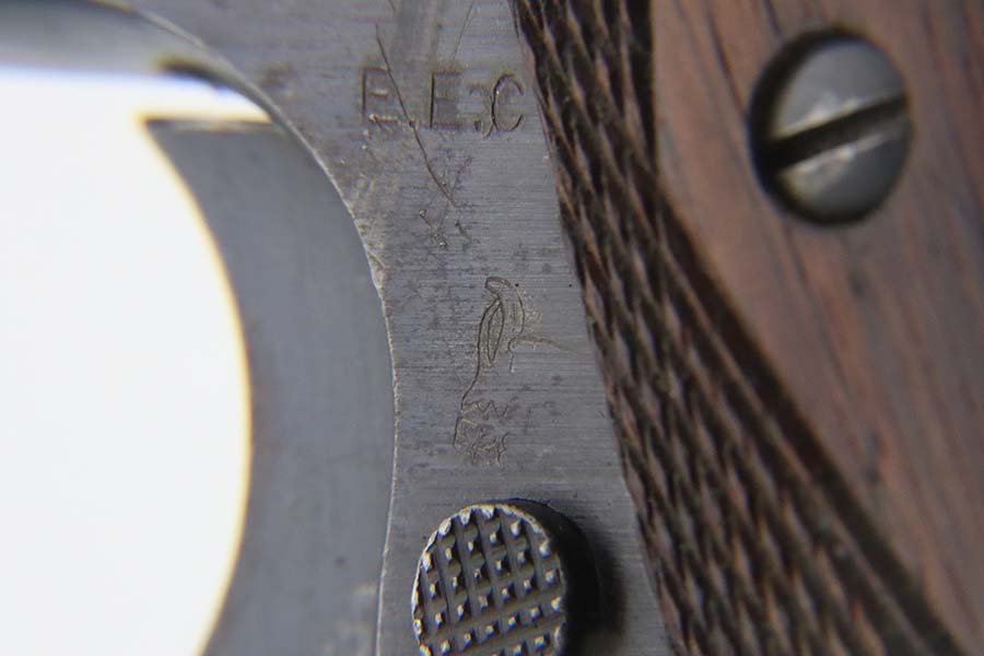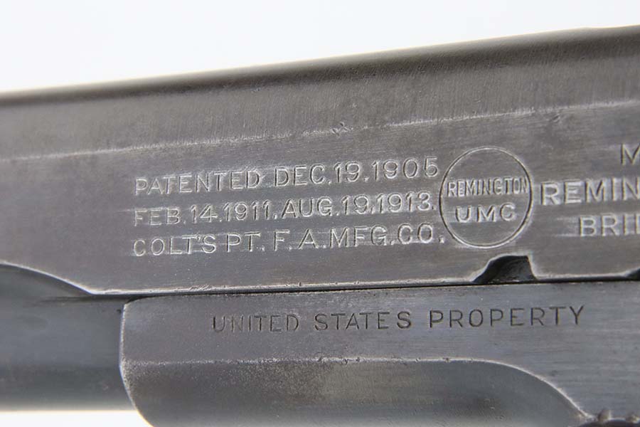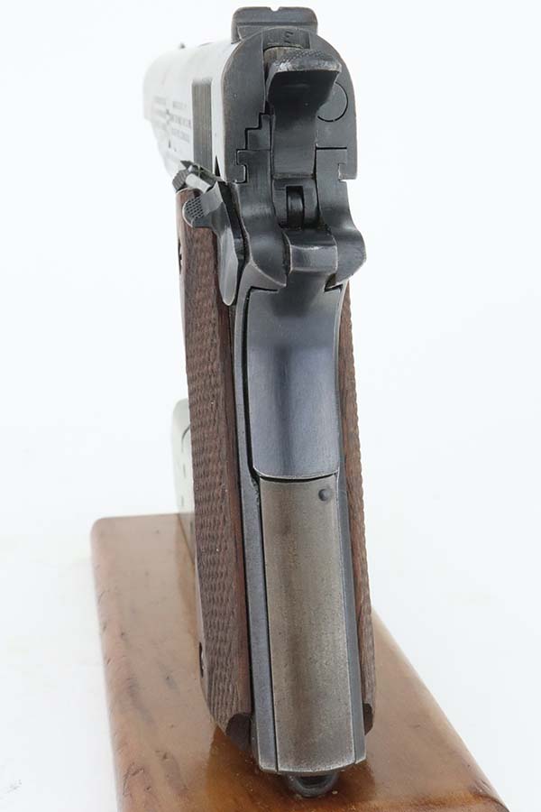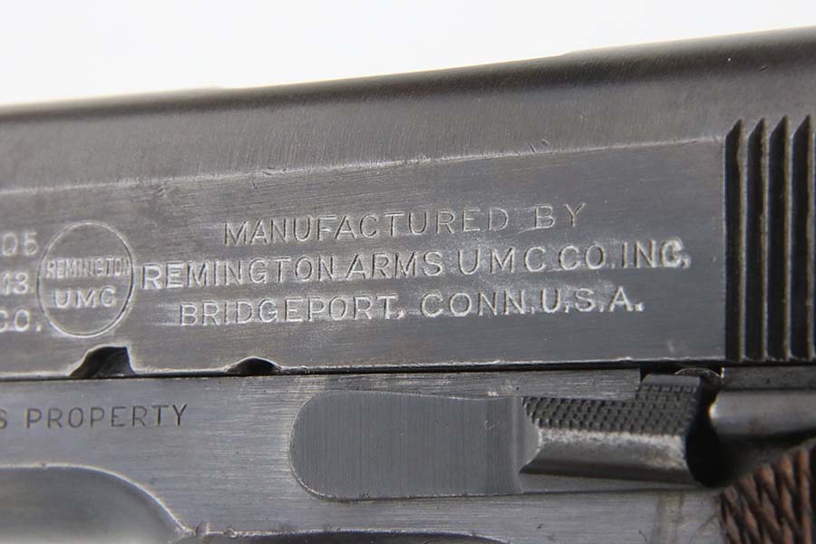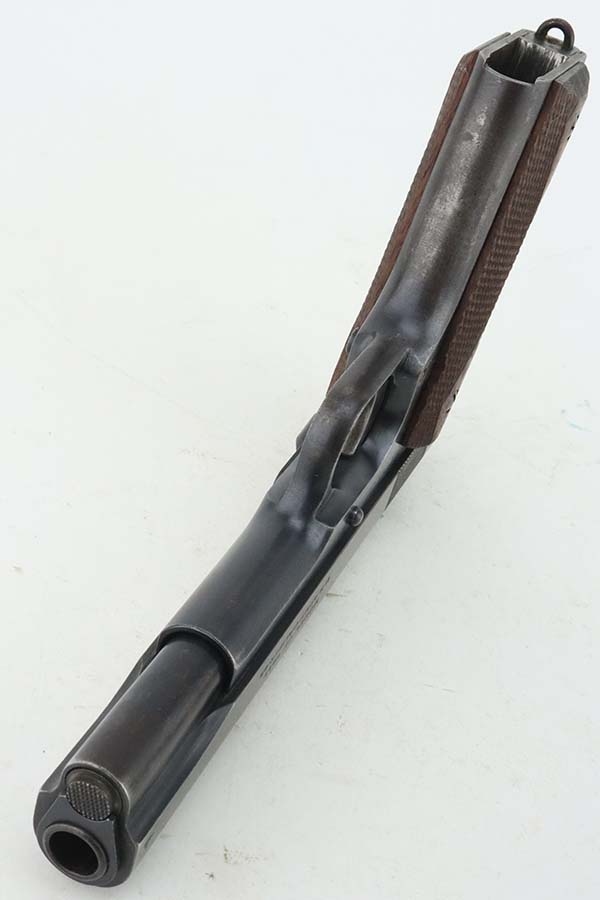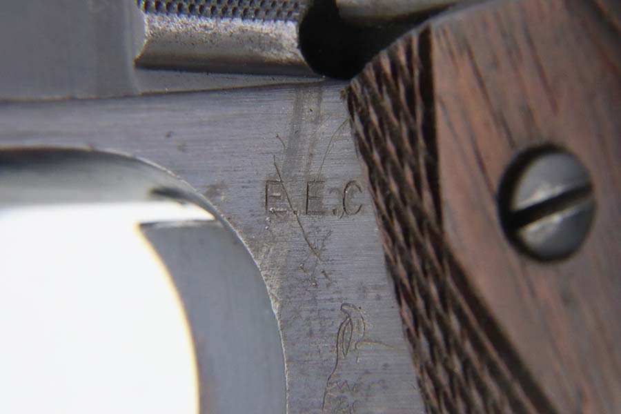 3/26/24 – This is a rare Remington UMC 1911. Of the three manufacturers of accepted U.S. Military 1911 pistols, the Remington-UMC is the least common with only ~21,000 produced. It has the proper E.E.C. inspectors marking on the left side of the frame. Major Edmond E. Chapman was responsible for the entire Rem-UMC production. Below his mark is an Eagle Head proof. The slide is marked with the ‘E’ above the firing pin stop. Correct barrel with a “P” in the ejection port. The gun has retained roughly 75% of its finish. There is obvious thinning, discoloration, and light brown patina throughout. Fitted with excellent period-correct wood grips and comes with a proper two-tone magazine. Mint bore.