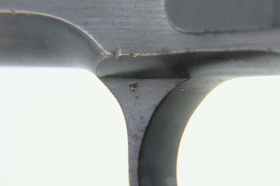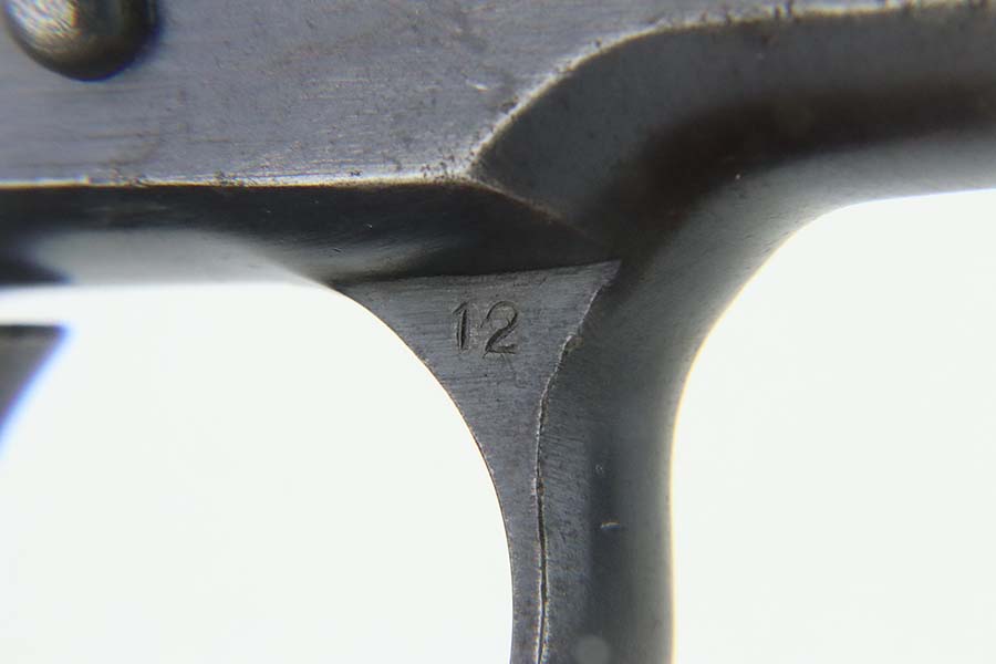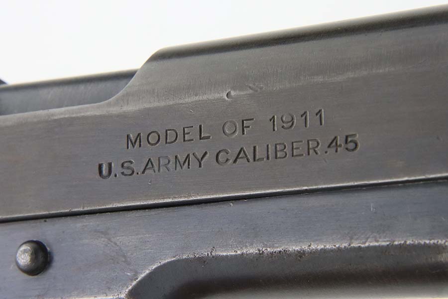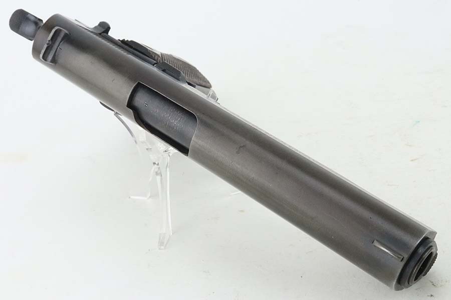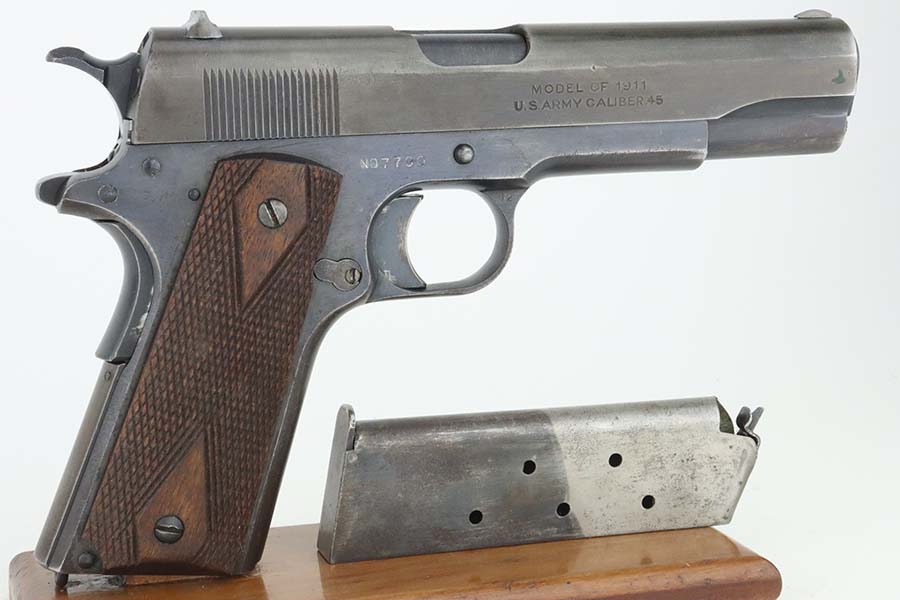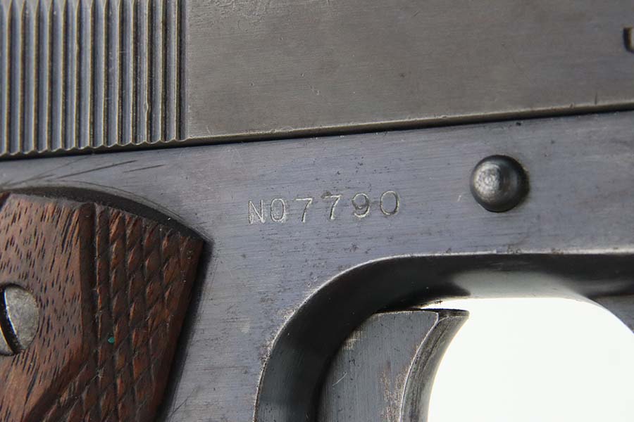 3/26/24 – This is a rare Remington UMC 1911. Of the three manufacturers of accepted U.S. Military 1911 pistols, the Remington-UMC is the least common with only ~21,000 produced. It has the proper E.E.C. inspectors marking on the left side of the frame. Major Edmond E. Chapman was responsible for the entire Rem-UMC production. Below his mark is an Eagle Head proof. The slide is marked with the ‘E’ above the firing pin stop. Correct barrel with a “P” in the ejection port. The gun has retained roughly 75% of its finish. There is obvious thinning, discoloration, and light brown patina throughout. Fitted with excellent period-correct wood grips and comes with a proper two-tone magazine. Mint bore.