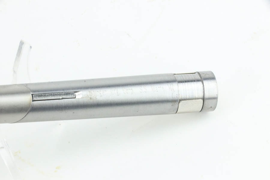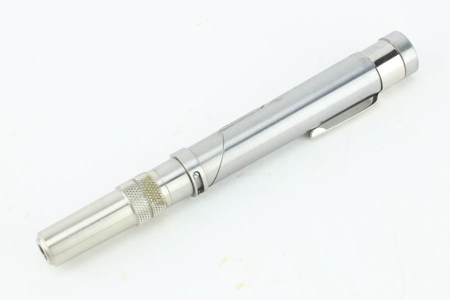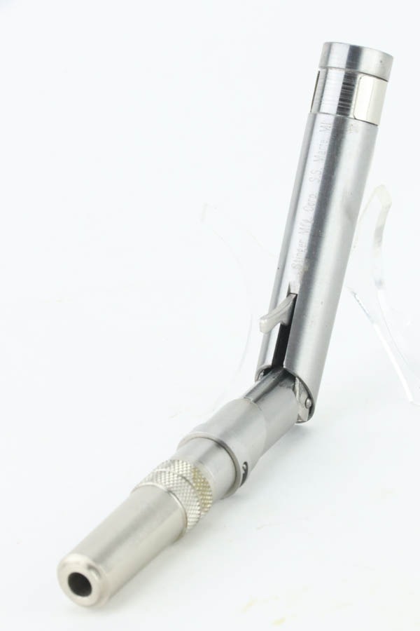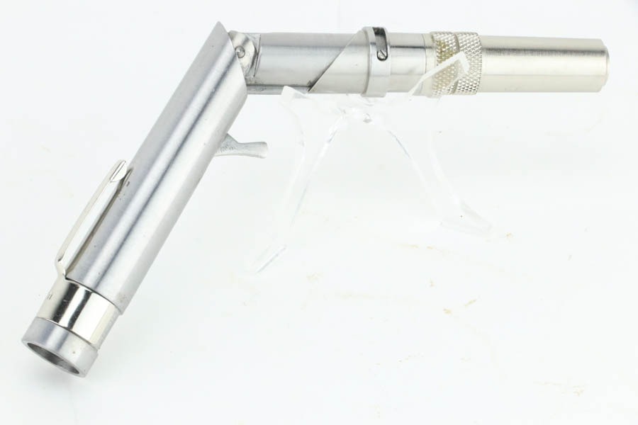 11/20/24 – This is an excellent example of a rare and unique RJ Braverman Corp Stinger pen gun, chambered in .22 LR. These were produced in limited numbers from 1995 to 1997 and feature stainless steel construction with a knurled barrel ring, swiveling safety, and pocket clip. To operate, the barrel must be pulled and bent into the “L” shape. Then it is ready to fire. When it is in the non-firing configuration, it resembles a pen. This one is fully functional. This is a Non-NFA item, but an FFL is required.