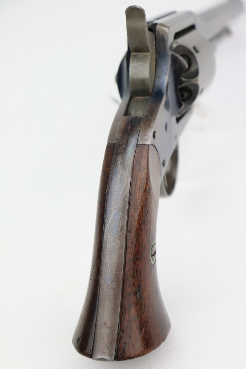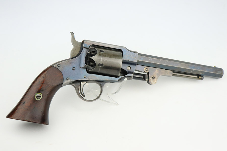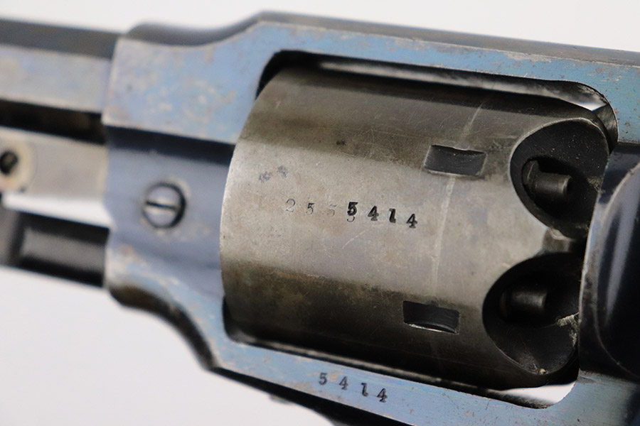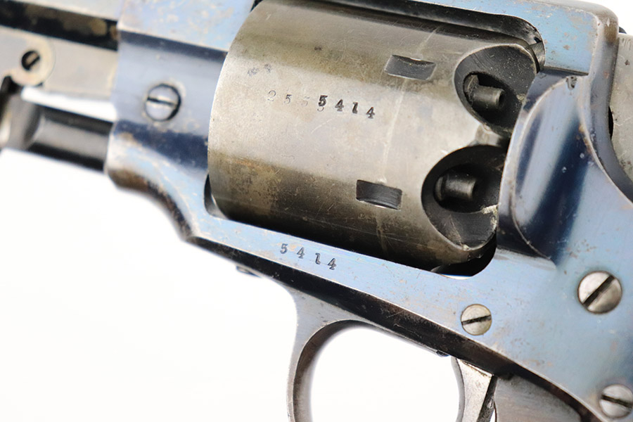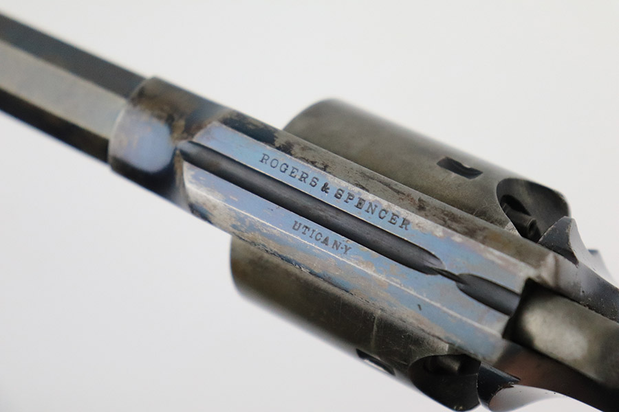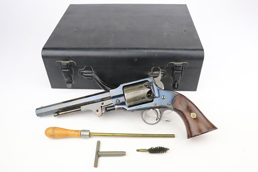 11/17/22 – This is a very nice example of a rare Rogers & Spencer .44 Caliber Army Revolver. The Rogers & Spencer “Army” revolver was likely the pinnacle of single-action percussion revolver design, but unfortunately the 5,000 revolvers purchased by the US government never made it into the field before the end of the American Civil War. The firm of Rogers & Spencer was formed by Amos Rogers and Julius Spencer in 1837 in Willowville, NY, not far from Utica. The company is probably most famous for producing the Pettengill family of revolvers. In 1859, they were hired to manufacture guns of the CS Pettengill design, but when the Pettengill company failed, Rogers & Spencer purchased the rights to the design and continued with production of the revolvers. This led to a contract in 1861 to produce 2,000 .44 caliber “Army” sized Pettengill revolvers, which Rogers & Spencer delivered between October 1862 and January 1863. The firm subsequently managed to secure a contract in November of 1864 for 5,000 revolvers of their own design, at the rate of $12.00 per revolver, with deliveries to be made at the rate of 500 per month, starting in January of 1865. This particular example is almost entirely matching, but the loading rod is mismatched and the barrel appears to have been re-numbered to match. The gun has retained roughly 45% of its original high polish fire-blue finish. There is splotchy discoloration and areas of desirable “attic patina” throughout. There is some light scratching and some tiny dings at the front end of the frame. Comes with correct wood grips (numbered but not matching) that just have minor bruising, to be expected with a gun this old. The bore is excellent – shiny with strong rifling. Fully functional. The gun comes with a custom-made case, percussion cap tool, cleaning rod, some percussion caps, and a few lead bullets.