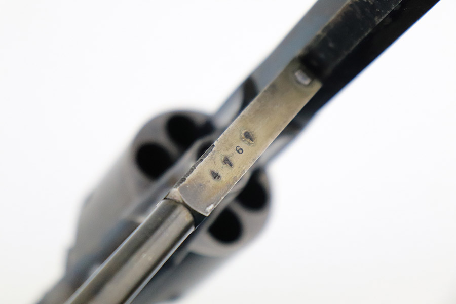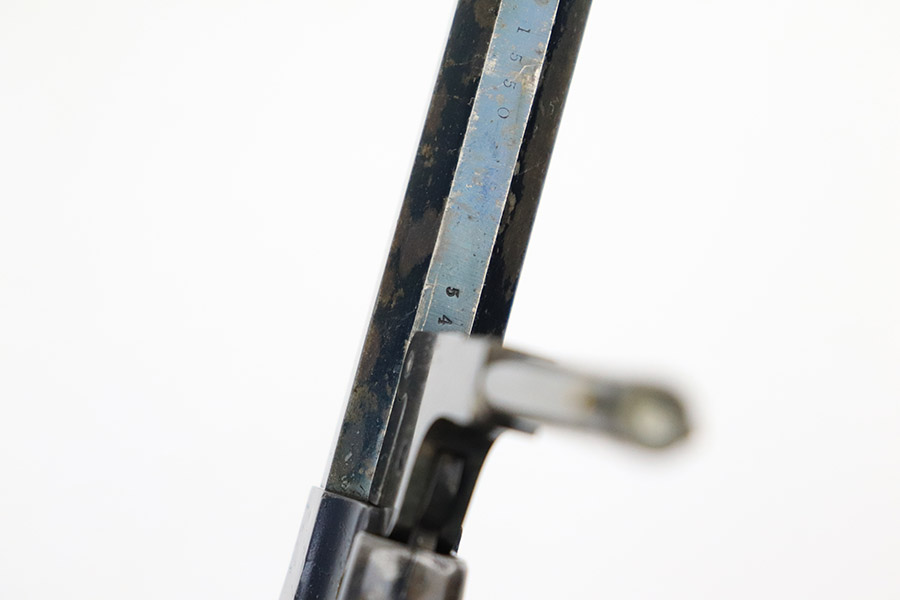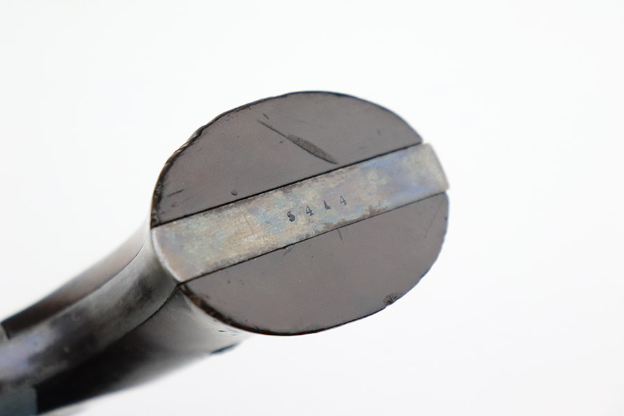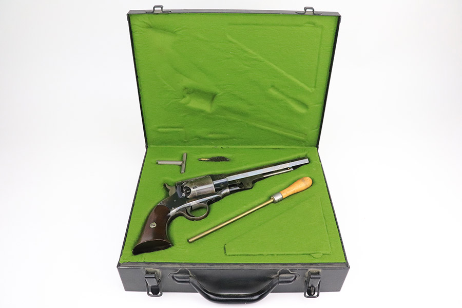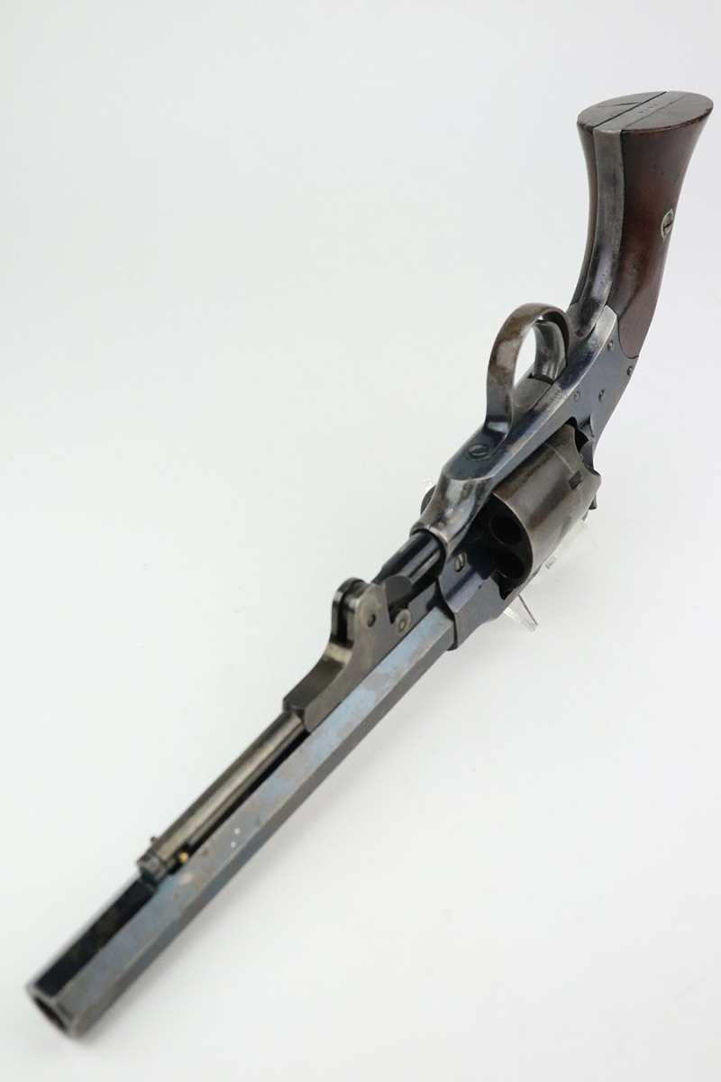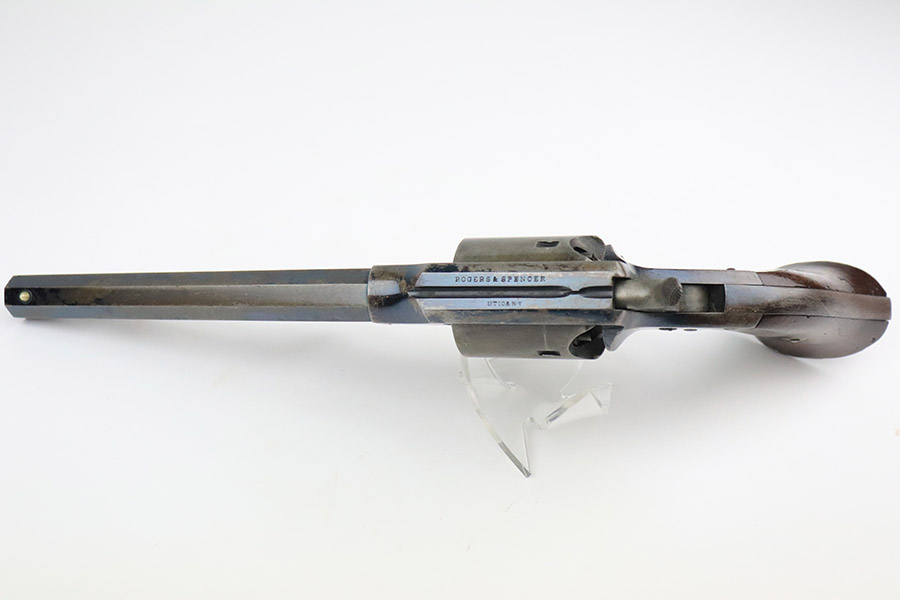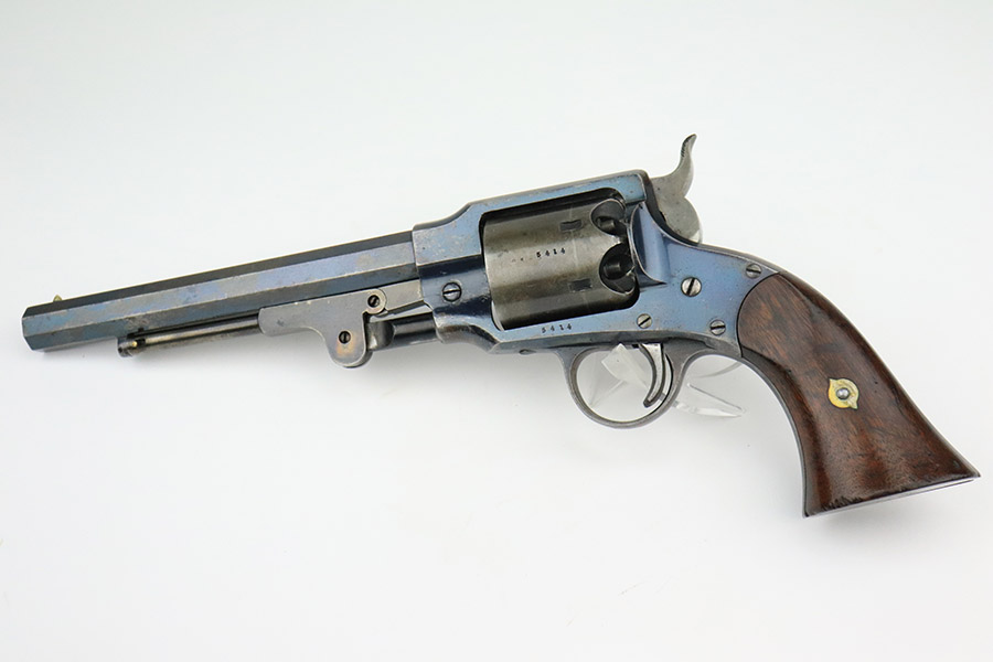 11/17/22 – This is a very nice example of a rare Rogers & Spencer .44 Caliber Army Revolver. The Rogers & Spencer “Army” revolver was likely the pinnacle of single-action percussion revolver design, but unfortunately the 5,000 revolvers purchased by the US government never made it into the field before the end of the American Civil War. The firm of Rogers & Spencer was formed by Amos Rogers and Julius Spencer in 1837 in Willowville, NY, not far from Utica. The company is probably most famous for producing the Pettengill family of revolvers. In 1859, they were hired to manufacture guns of the CS Pettengill design, but when the Pettengill company failed, Rogers & Spencer purchased the rights to the design and continued with production of the revolvers. This led to a contract in 1861 to produce 2,000 .44 caliber “Army” sized Pettengill revolvers, which Rogers & Spencer delivered between October 1862 and January 1863. The firm subsequently managed to secure a contract in November of 1864 for 5,000 revolvers of their own design, at the rate of $12.00 per revolver, with deliveries to be made at the rate of 500 per month, starting in January of 1865. This particular example is almost entirely matching, but the loading rod is mismatched and the barrel appears to have been re-numbered to match. The gun has retained roughly 45% of its original high polish fire-blue finish. There is splotchy discoloration and areas of desirable “attic patina” throughout. There is some light scratching and some tiny dings at the front end of the frame. Comes with correct wood grips (numbered but not matching) that just have minor bruising, to be expected with a gun this old. The bore is excellent – shiny with strong rifling. Fully functional. The gun comes with a custom-made case, percussion cap tool, cleaning rod, some percussion caps, and a few lead bullets.