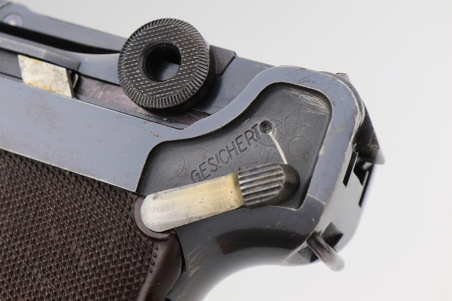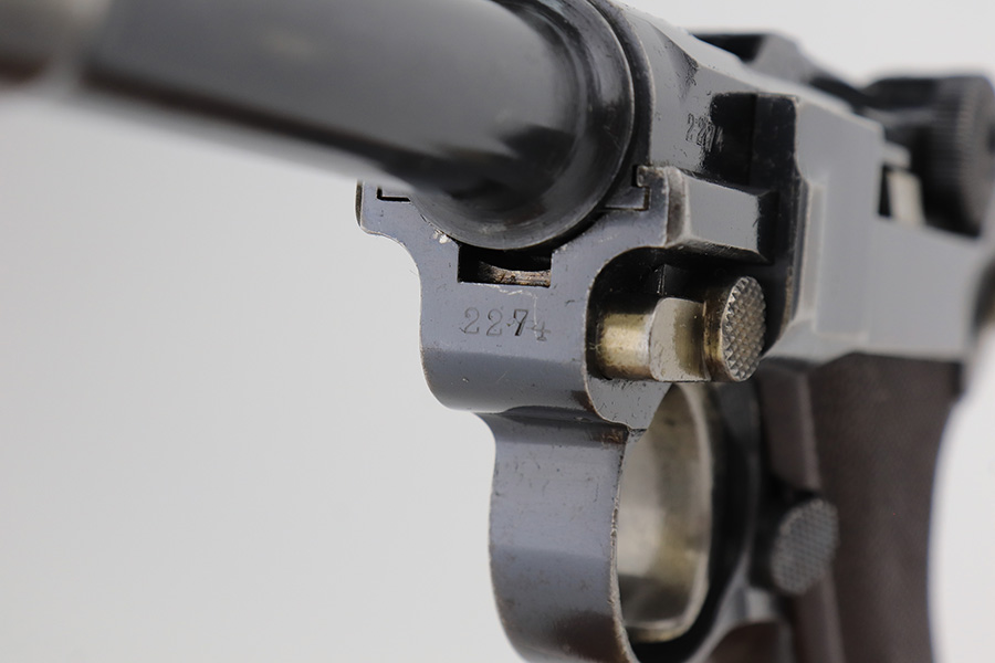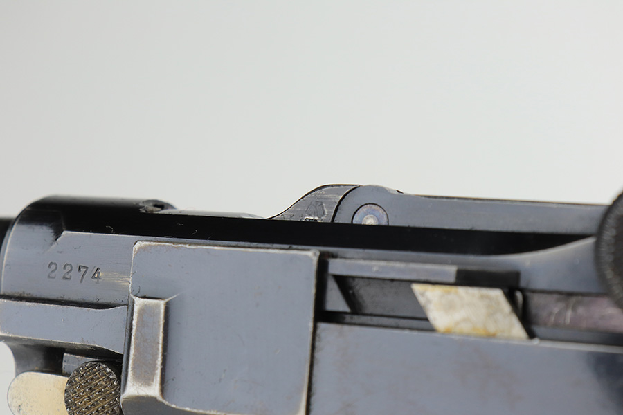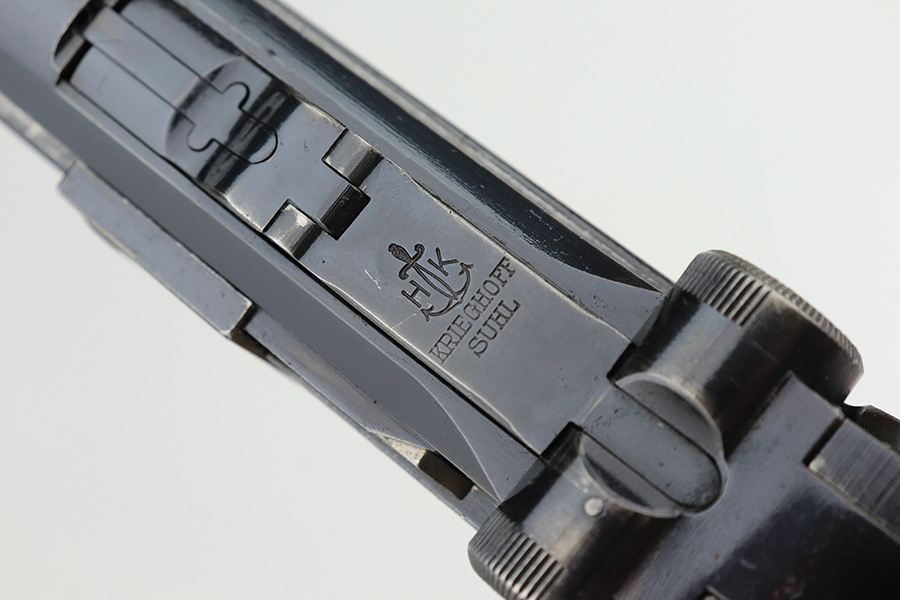 6/21/24 – This is an early 1936 manufactured Krieghoff Luger, considered a “mid-S” variation. There were only 1,700 of this variation produced, as referenced on pages 158-159 of Gibson’s book. This contract was issued to the Luftwaffe in 1936, with many going to the paratroopers and pilots, making these a desirable collector’s Luger. This pistol has finely checkered Ritz style Krieghoff grips and about 90% original blue with most of the finish loss on the front and back straps. This is honest handling and age wear with light surface patina. The small parts show excellent original straw color. The characteristic Krieghoff ‘thumb print’ is visible on the back of the frame, and the ears have a proper matte finish. All numbered parts are matching, with the exception of the magazine. However, the HK magazine is only ONE digit off (see photos). The bore has some light use wear but overall excellent and rates about 9 out of 10.