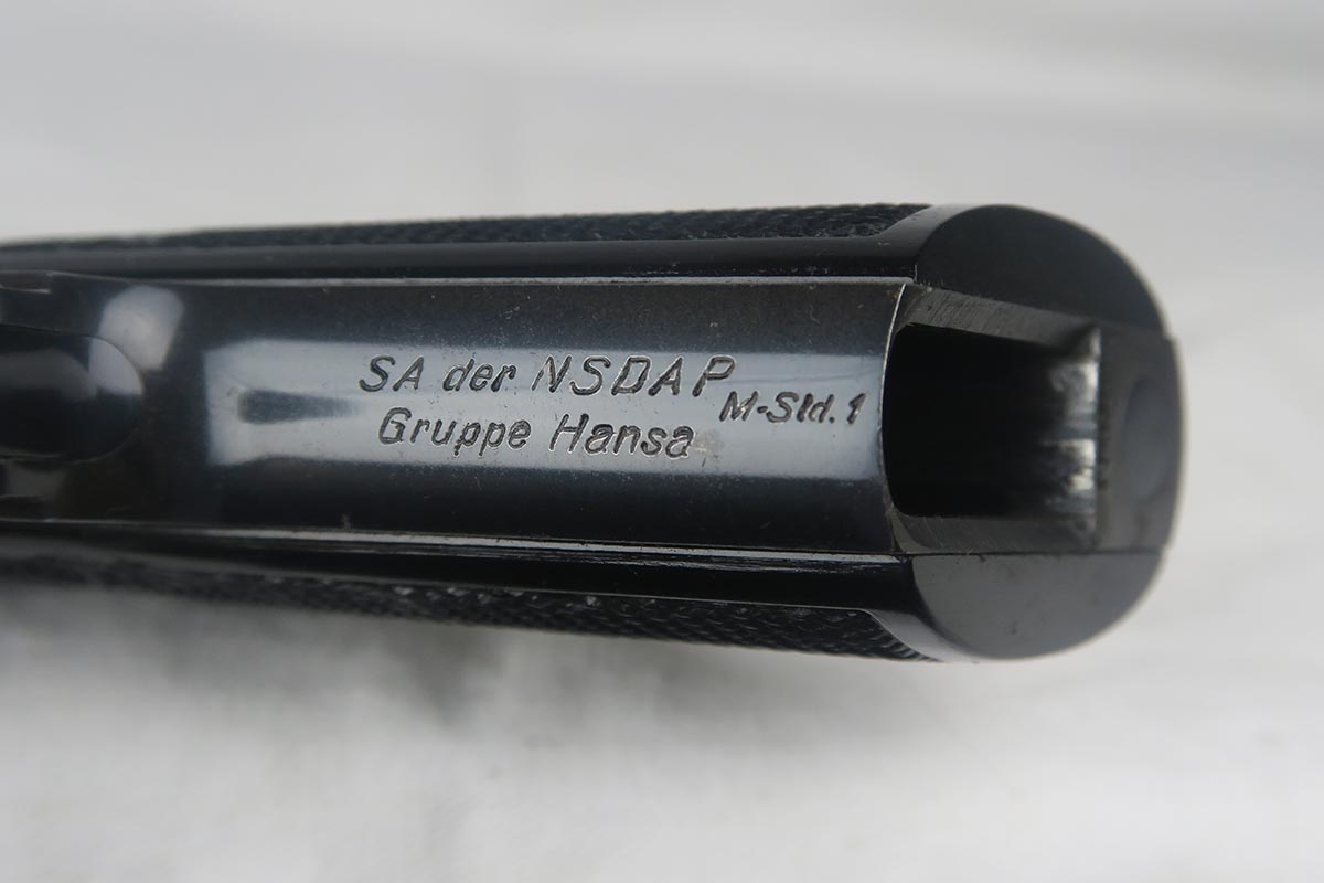 8/18/17 – This is an ultra rare Sa Walther PP that was issued to Gruppe Hansa.  What makes it especially rare is that the SA proof features an additional marking to denote a subdivision of the Gruppe.  There were only two recorded SA PP’s issued to this Gruppe in Axis Pistols, and none mention the subdivision, making this a near one-of-a-kind find!  All original and correct, the bluing rates at about 93-94%.  There is muzzle wear on both sides, and the left side of the slide shows multiple little spots of finish loss.  Not sure what caused this wear, but it is not pitting, just finish loss.  Nice mag and grips.  Excellent bore.