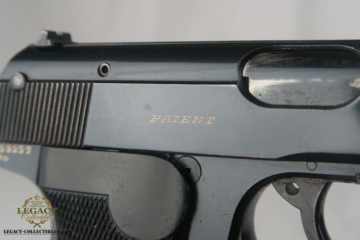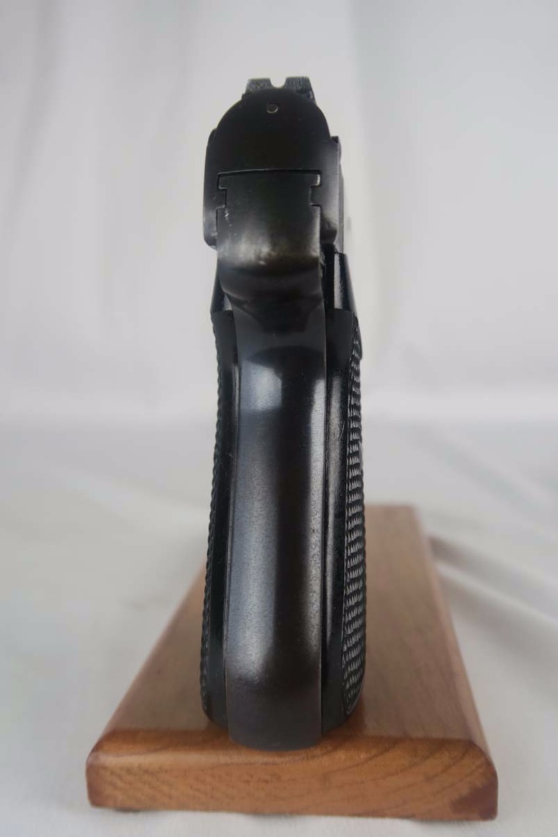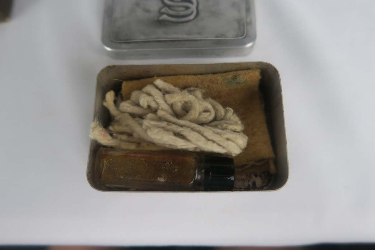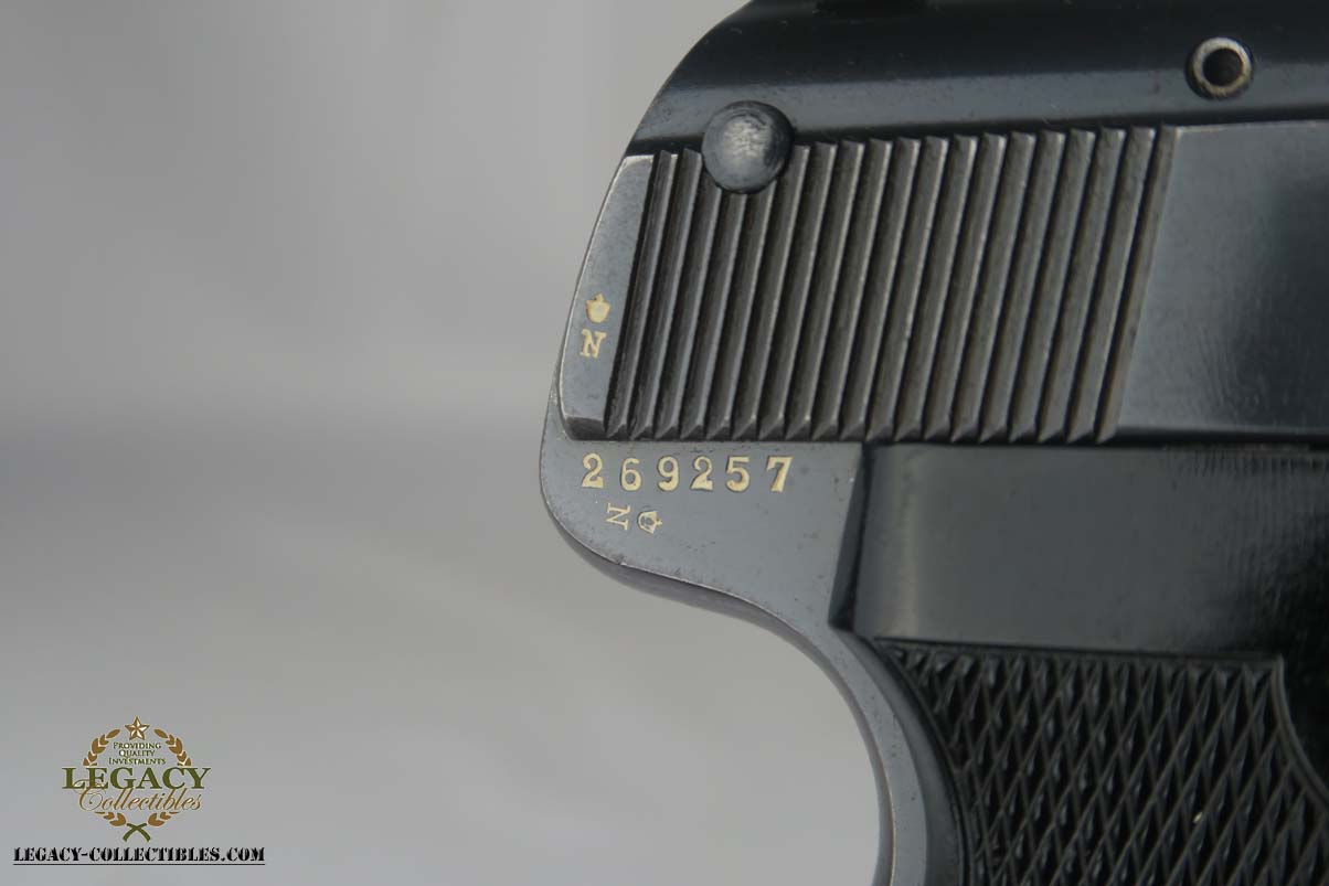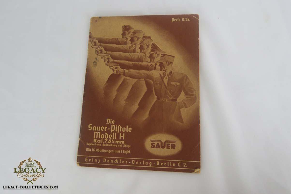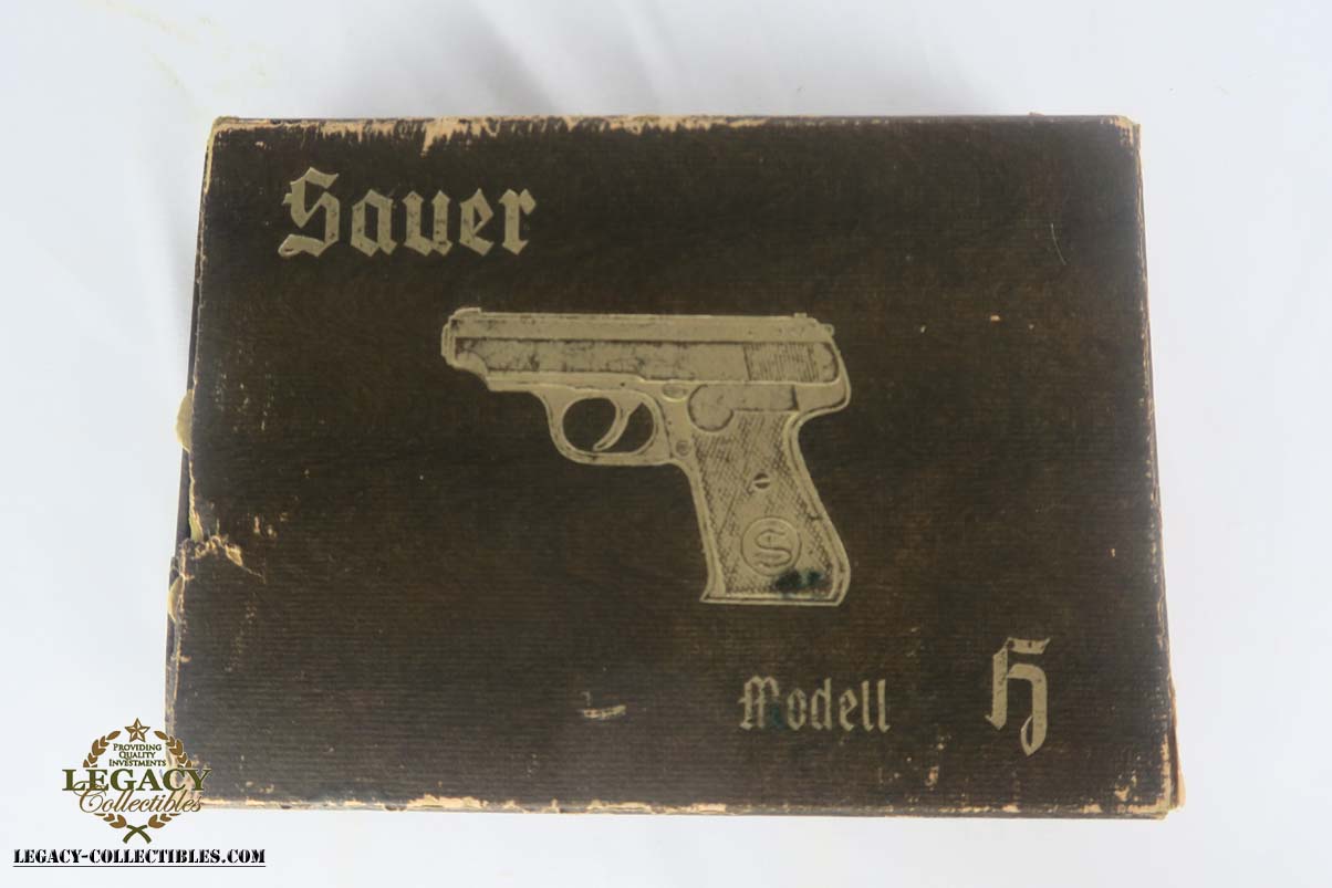 12/6/17 – Here we have a very rare Sauer 38h in the original box with all the fixings. Included amongst those is the original manual and oiler tin, both of which are very difficult to find. There is also a cleaning rod, spare magazine and three dummy rounds. The original finish of the pistol rates at about 96%, with a spot of wear on the trigger guard. The box is clearly legible but one edge of the top has fallen off. Along with these items, the original wood box that the pistol was brought home in by the vet remains with the pistol. Estimated date of 1940 or 41 as this is one of the latest serial numbers to have Crown/N proofs. Mint bore.
