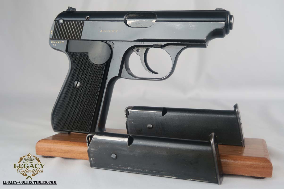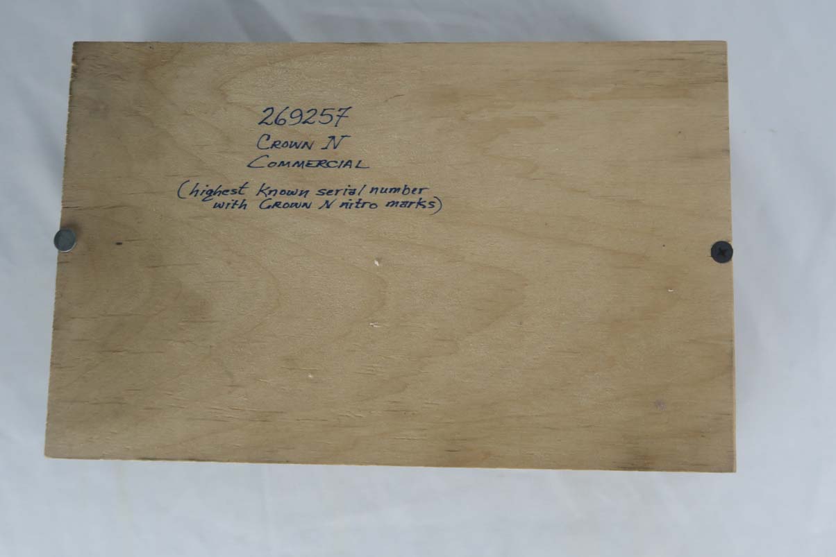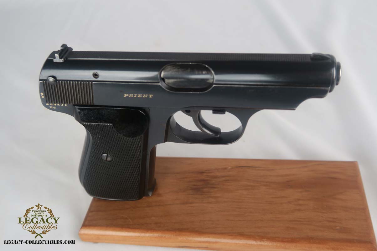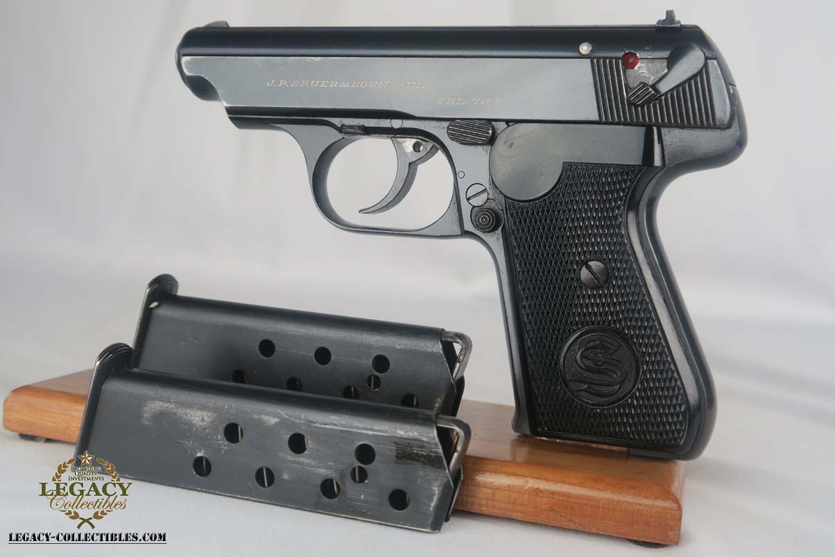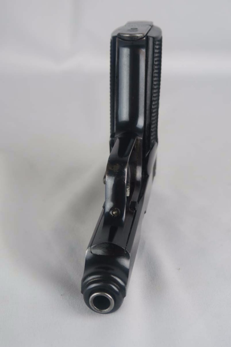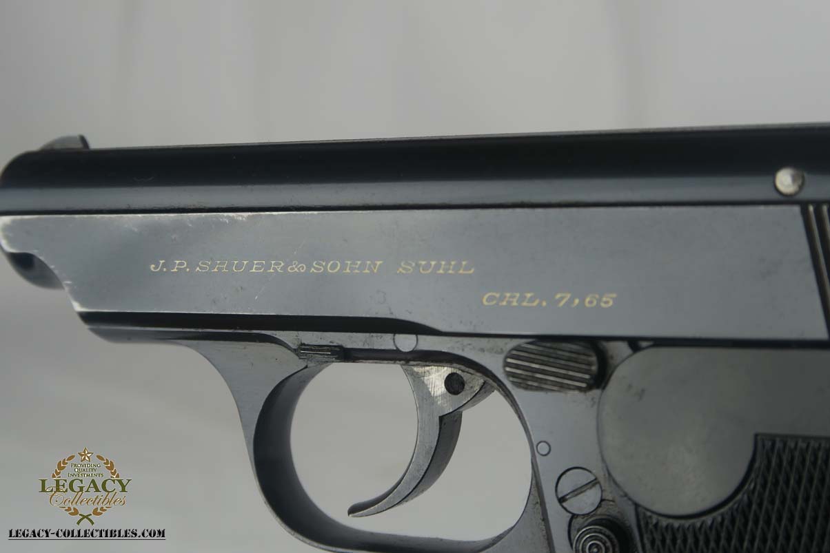 12/6/17 – Here we have a very rare Sauer 38h in the original box with all the fixings. Included amongst those is the original manual and oiler tin, both of which are very difficult to find. There is also a cleaning rod, spare magazine and three dummy rounds. The original finish of the pistol rates at about 96%, with a spot of wear on the trigger guard. The box is clearly legible but one edge of the top has fallen off. Along with these items, the original wood box that the pistol was brought home in by the vet remains with the pistol. Estimated date of 1940 or 41 as this is one of the latest serial numbers to have Crown/N proofs. Mint bore.