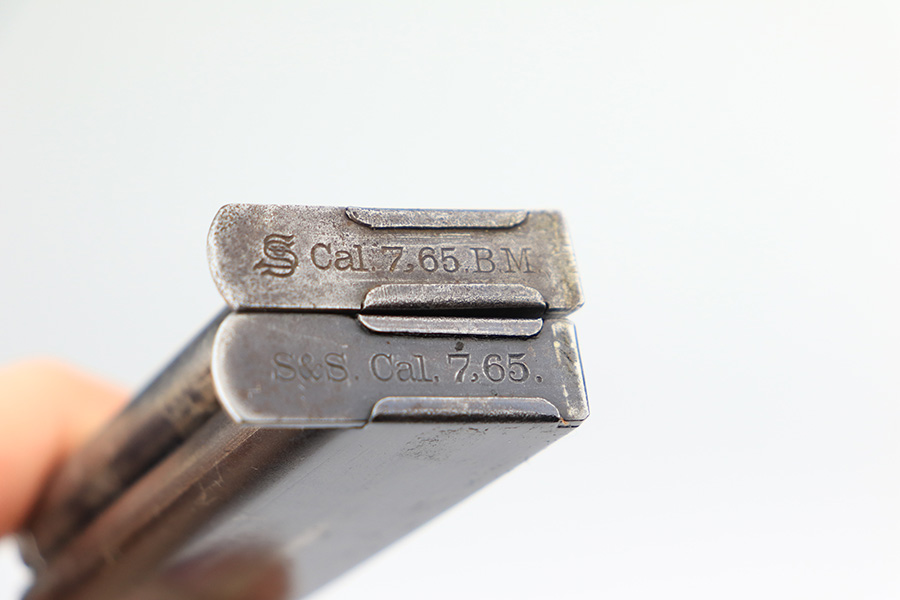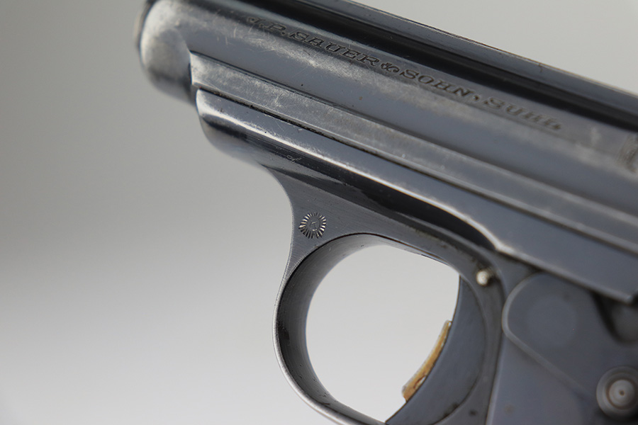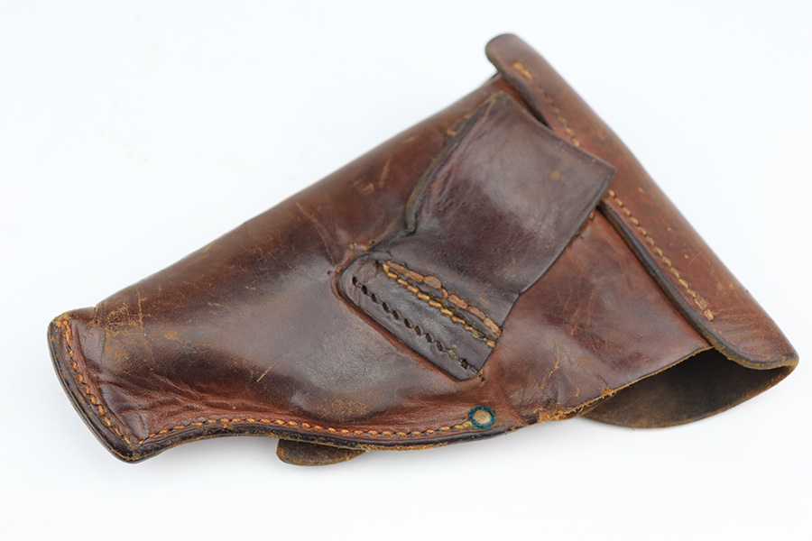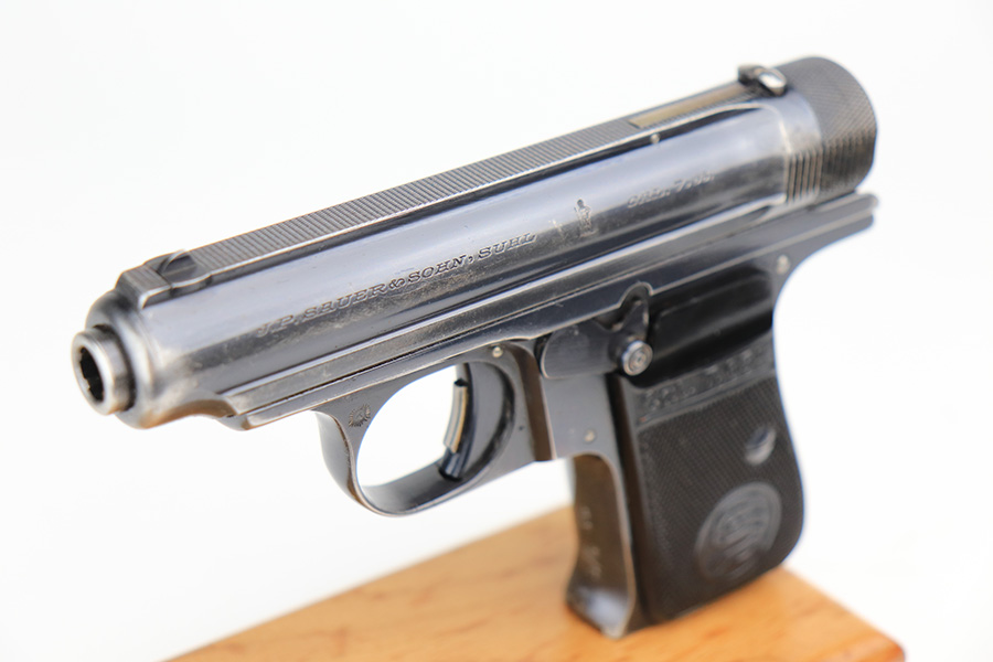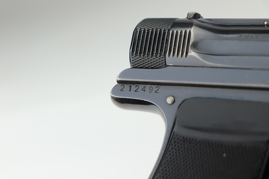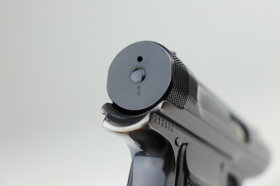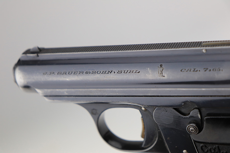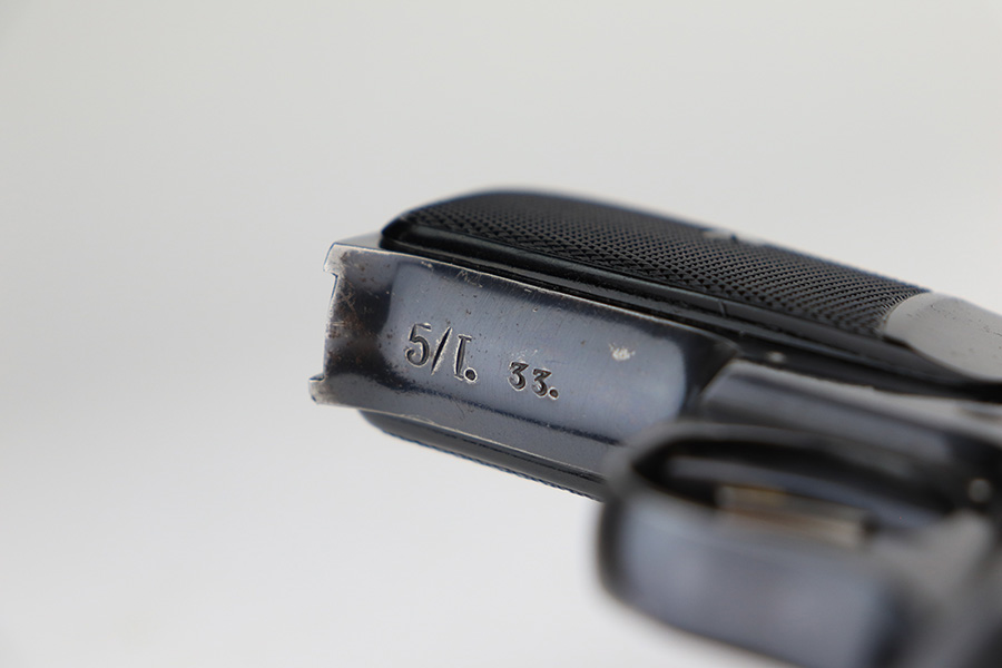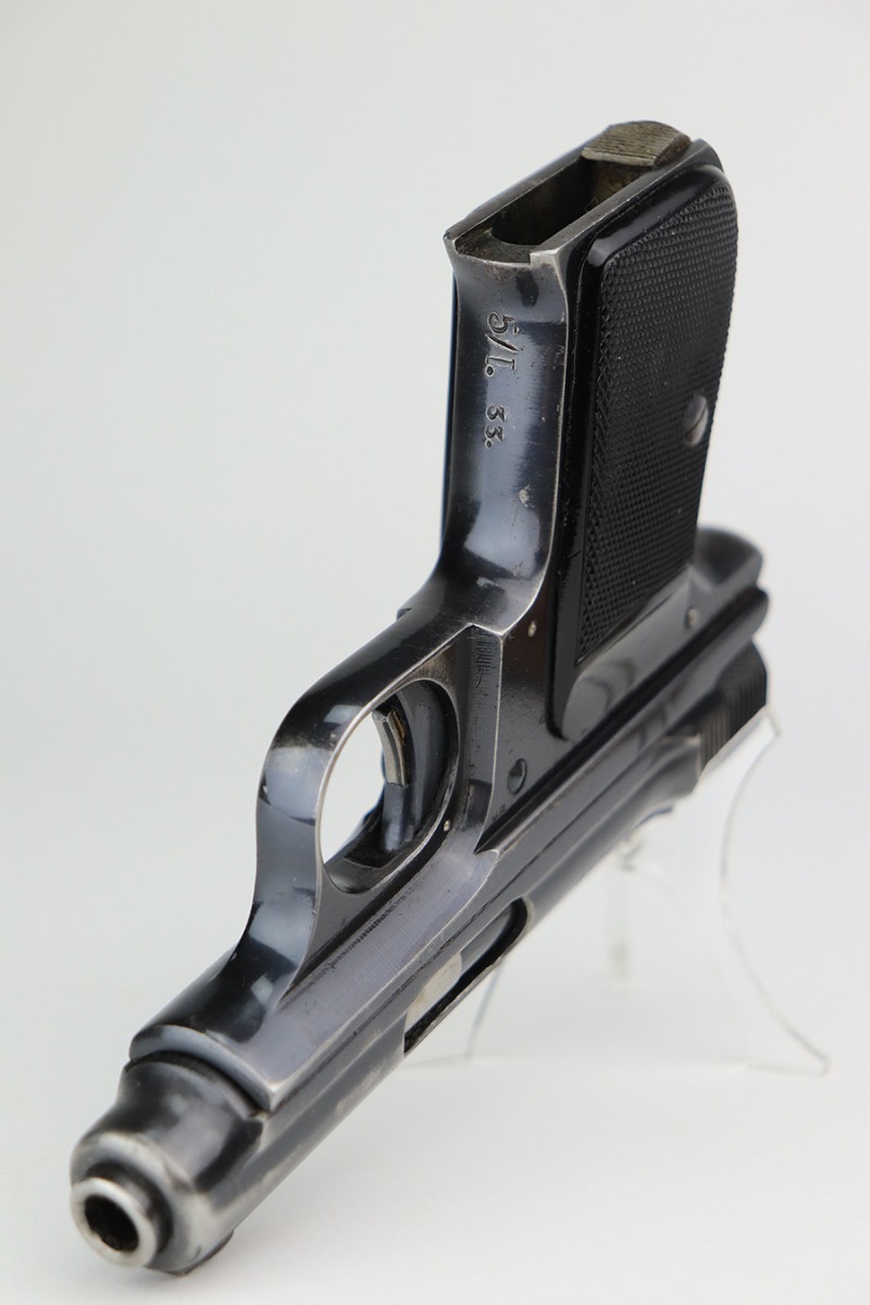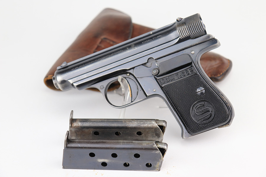 3/10/22 – This is a very nice example of a rare Sauer Behorden pistol. This is a Sauer Model 1913 issued to the Nazi-era Prussian State Police. This is evidenced by the “Starburst K” marking on the web of the trigger guard. This was the last iteration of this pistol before they switched over to the 38h. They were marketed to and almost exclusively sold to Nazi-era police organizations. They had added safety features, such as the additional trigger safety, making them appealing for police. Very few of these guns were produced. This particular gun is all matching and has a “5/I. 33.” police unit marking on the front strap. It comes as a rig with a nice tan leather 1937-dated police holster and two period-correct magazines. It has retained about 90% of its original finish. Most of the wear is around the muzzle and on the round edges of the slide. There is also very minor thinning on the grip straps and an area of spotty discoloration on the back strap. Comes with excellent period-correct black bakelite grips. Mint bore.