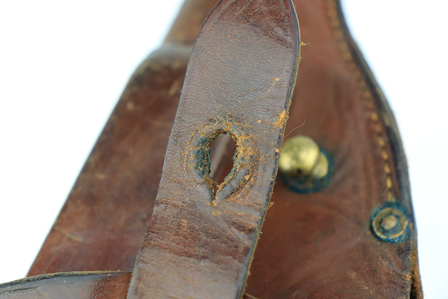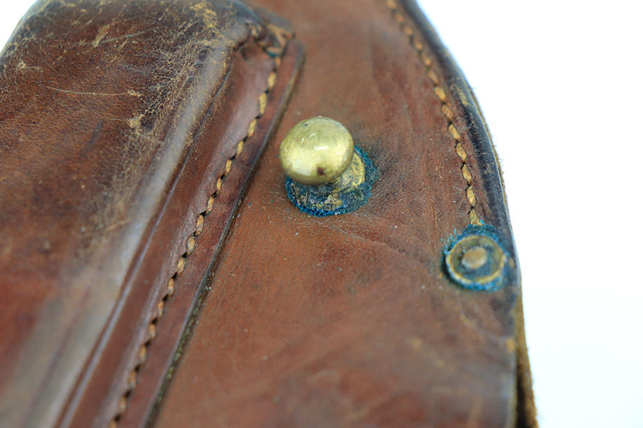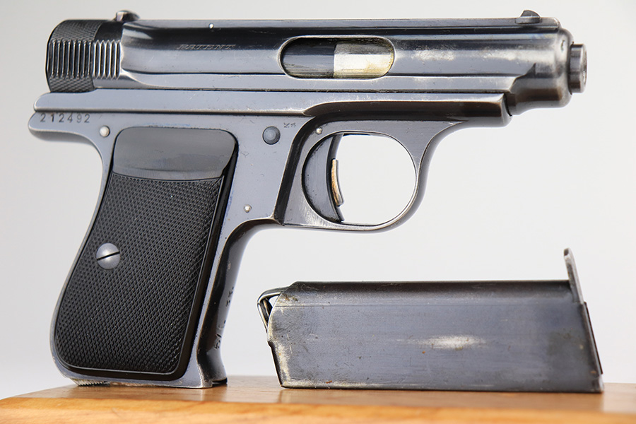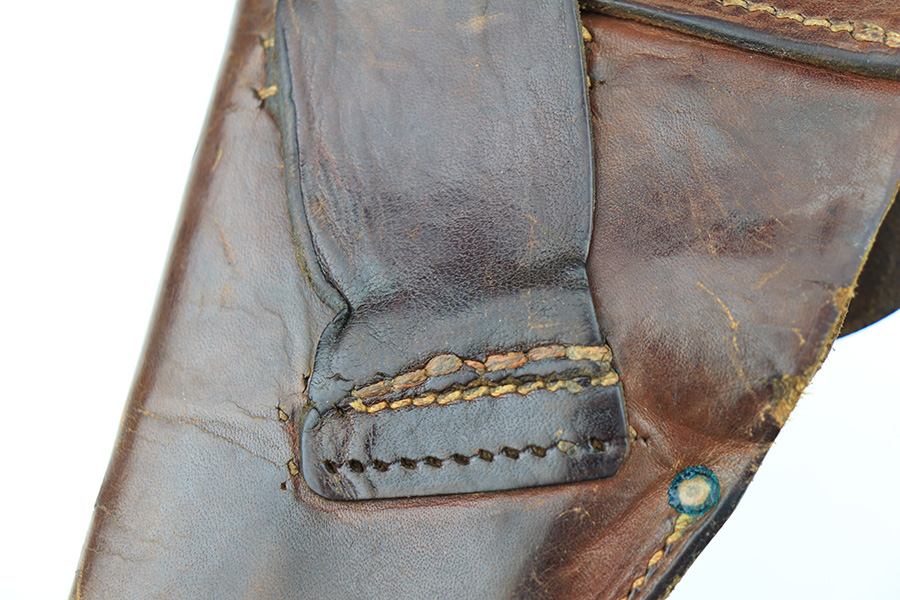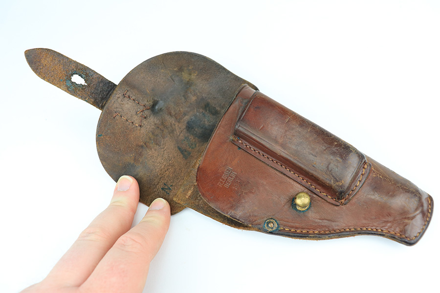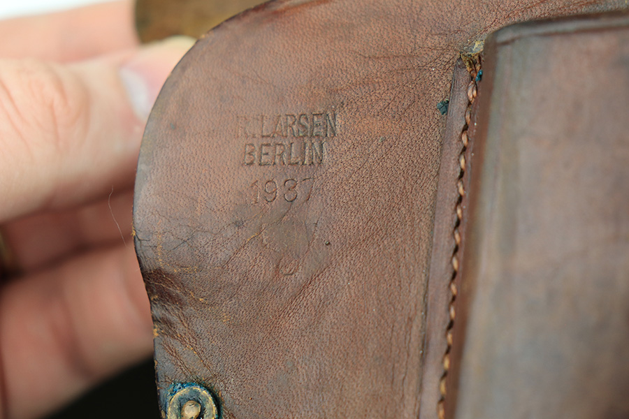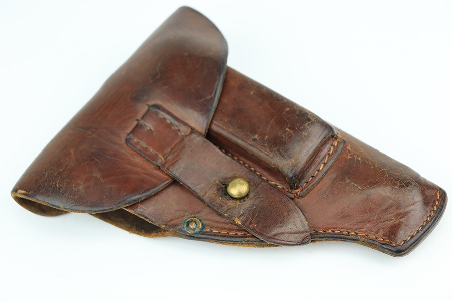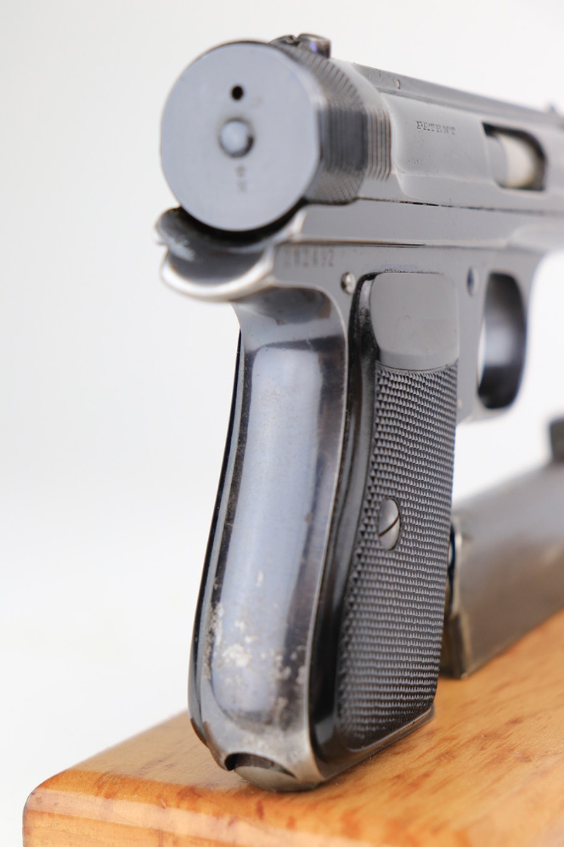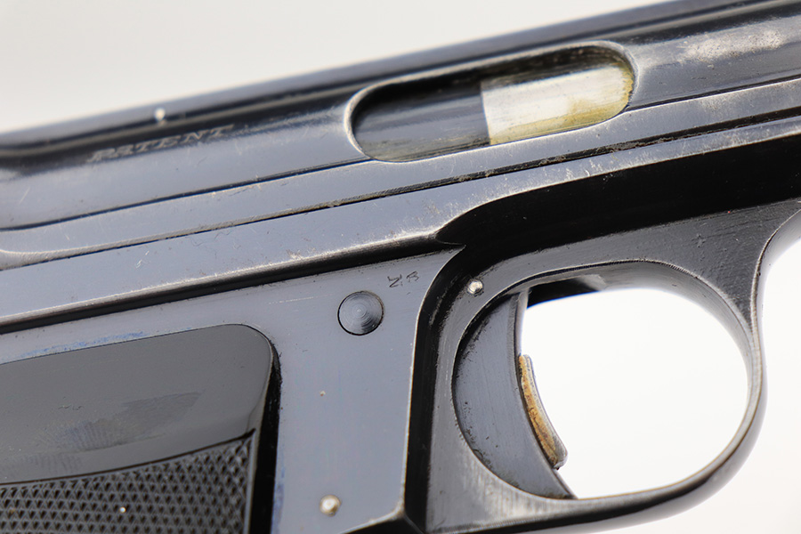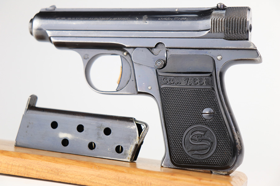 3/10/22 – This is a very nice example of a rare Sauer Behorden pistol. This is a Sauer Model 1913 issued to the Nazi-era Prussian State Police. This is evidenced by the “Starburst K” marking on the web of the trigger guard. This was the last iteration of this pistol before they switched over to the 38h. They were marketed to and almost exclusively sold to Nazi-era police organizations. They had added safety features, such as the additional trigger safety, making them appealing for police. Very few of these guns were produced. This particular gun is all matching and has a “5/I. 33.” police unit marking on the front strap. It comes as a rig with a nice tan leather 1937-dated police holster and two period-correct magazines. It has retained about 90% of its original finish. Most of the wear is around the muzzle and on the round edges of the slide. There is also very minor thinning on the grip straps and an area of spotty discoloration on the back strap. Comes with excellent period-correct black bakelite grips. Mint bore.