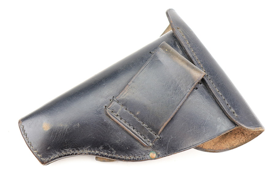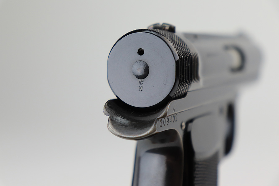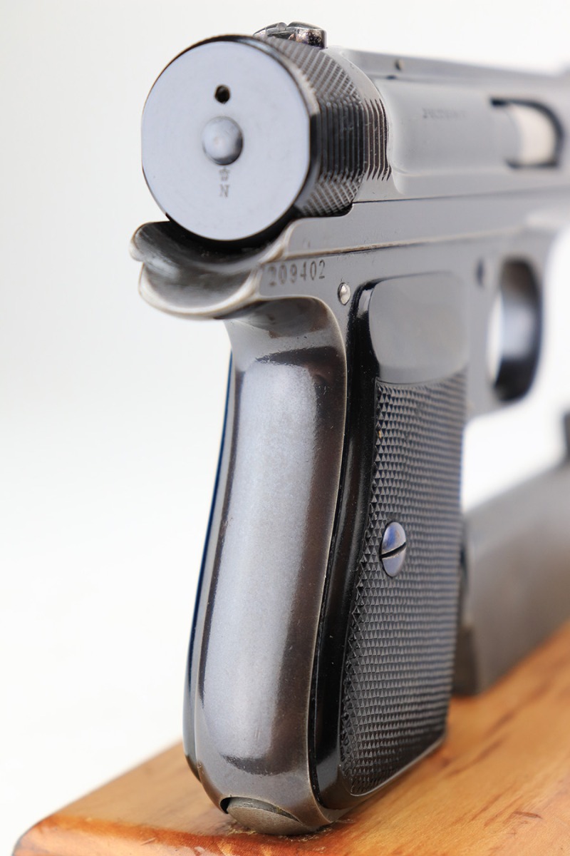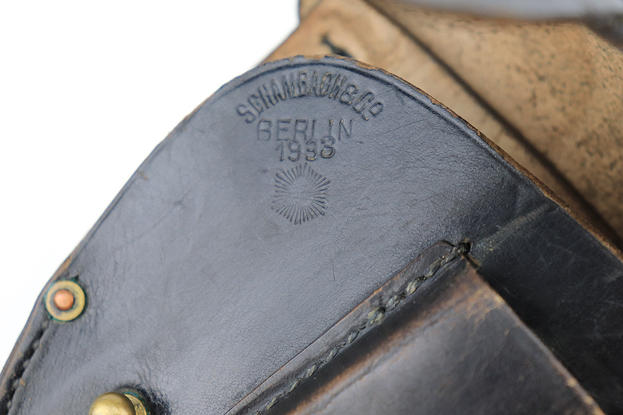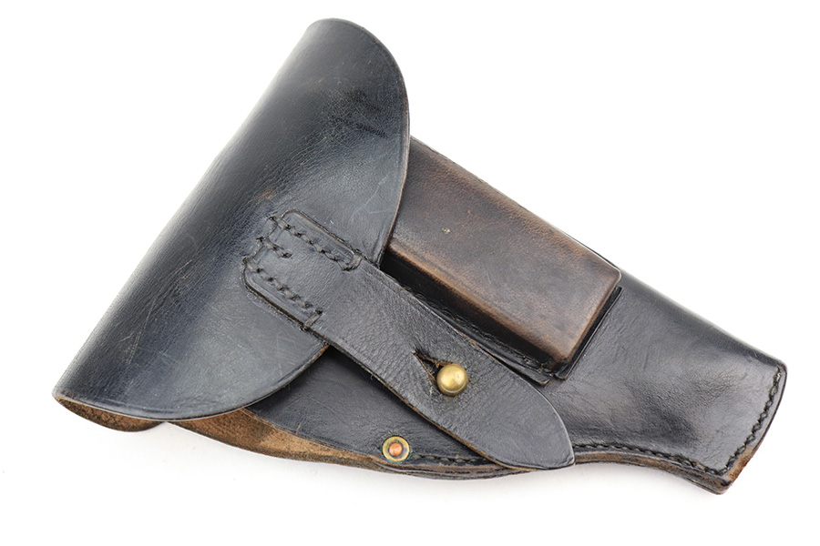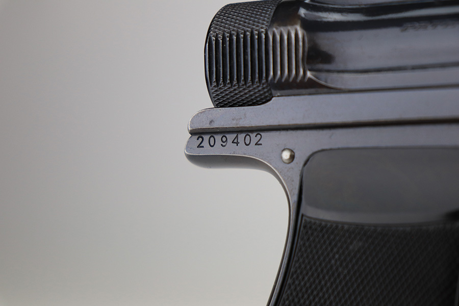 3/17/22 – This is an excellent example of a rare Sauer Behorden pistol. This is a Sauer Model 1913 issued to the Nazi-era Prussian State Police. This is evidenced by the “Starburst K” marking on the web of the trigger guard. This was the last iteration of this pistol before they switched over to the 38h. They were marketed to and almost exclusively sold to Nazi-era police organizations. They had added safety features, such as the additional trigger safety, making them appealing for police. Very few of these guns were produced. This particular gun is all matching and comes as a rig with an excellent 1933-dated police holster and two period-correct magazines. It has retained about 97% of its original finish. Most of the wear is around the muzzle. There is some very minor freckling on the grip straps. Comes with excellent period-correct black bakelite grips. Mint bore.