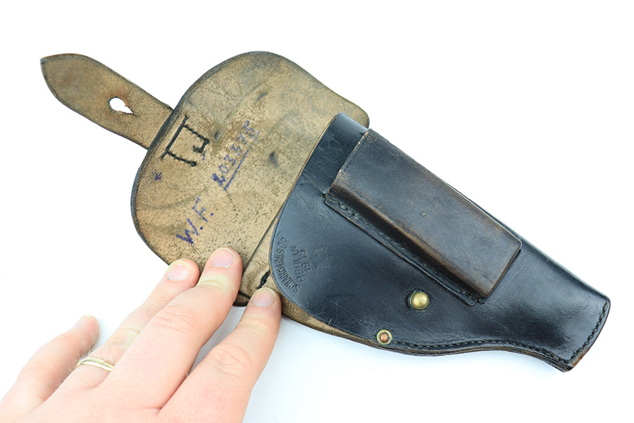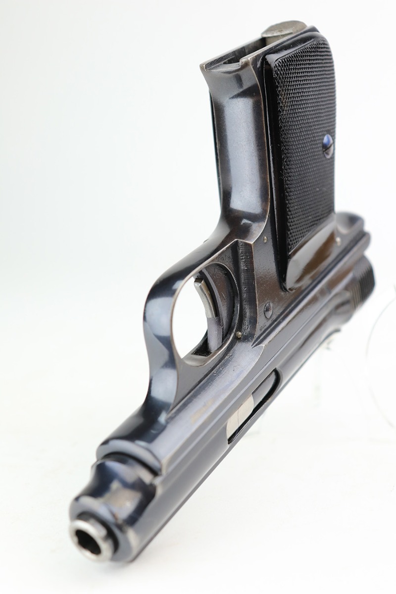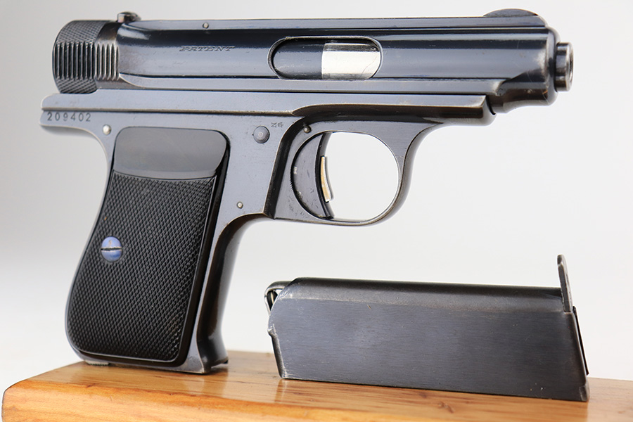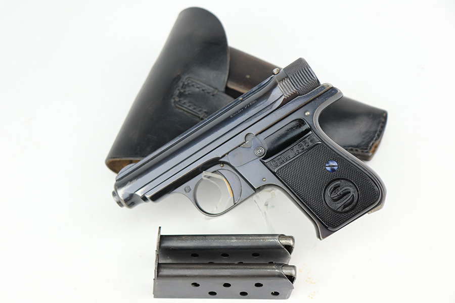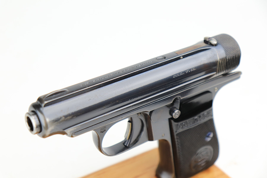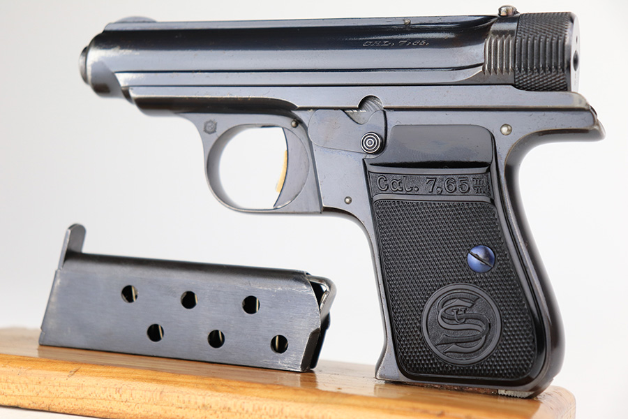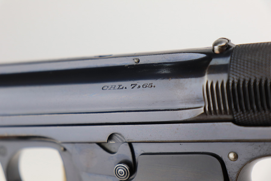 3/17/22 – This is an excellent example of a rare Sauer Behorden pistol. This is a Sauer Model 1913 issued to the Nazi-era Prussian State Police. This is evidenced by the “Starburst K” marking on the web of the trigger guard. This was the last iteration of this pistol before they switched over to the 38h. They were marketed to and almost exclusively sold to Nazi-era police organizations. They had added safety features, such as the additional trigger safety, making them appealing for police. Very few of these guns were produced. This particular gun is all matching and comes as a rig with an excellent 1933-dated police holster and two period-correct magazines. It has retained about 97% of its original finish. Most of the wear is around the muzzle. There is some very minor freckling on the grip straps. Comes with excellent period-correct black bakelite grips. Mint bore.