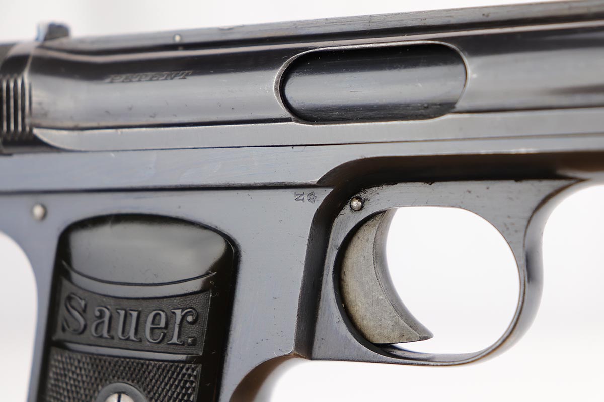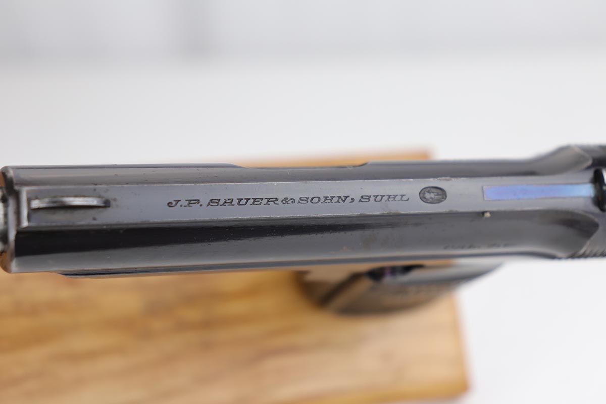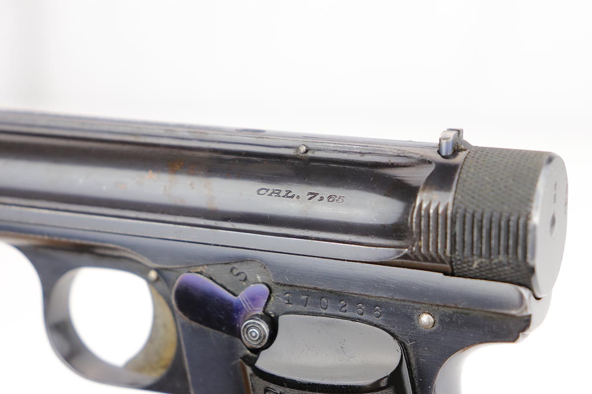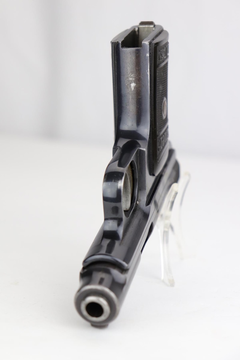10/1/19 – This is a very rare Sauer model 1926 export – only of only a few we’ve ever encountered! There were only 3,000-4,000 of this variation produced, and not a lot is known about them. This one has the telltale characteristics that separate it from the 1919 model and the 1929/30. The serrations on the cocking knob continue to the slide, and the trigger guard is the (correct) later oval shape. This one is all original and correct with about 92-93% high-polish blue remaining. There is some minor high edge wear on the slide, as well as a couple small areas of pinpricking, but the majority of the finish loss is on the front strap. Excellent grips and proper magazine. Minty bore.