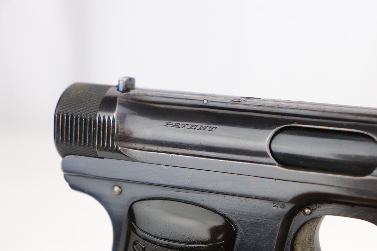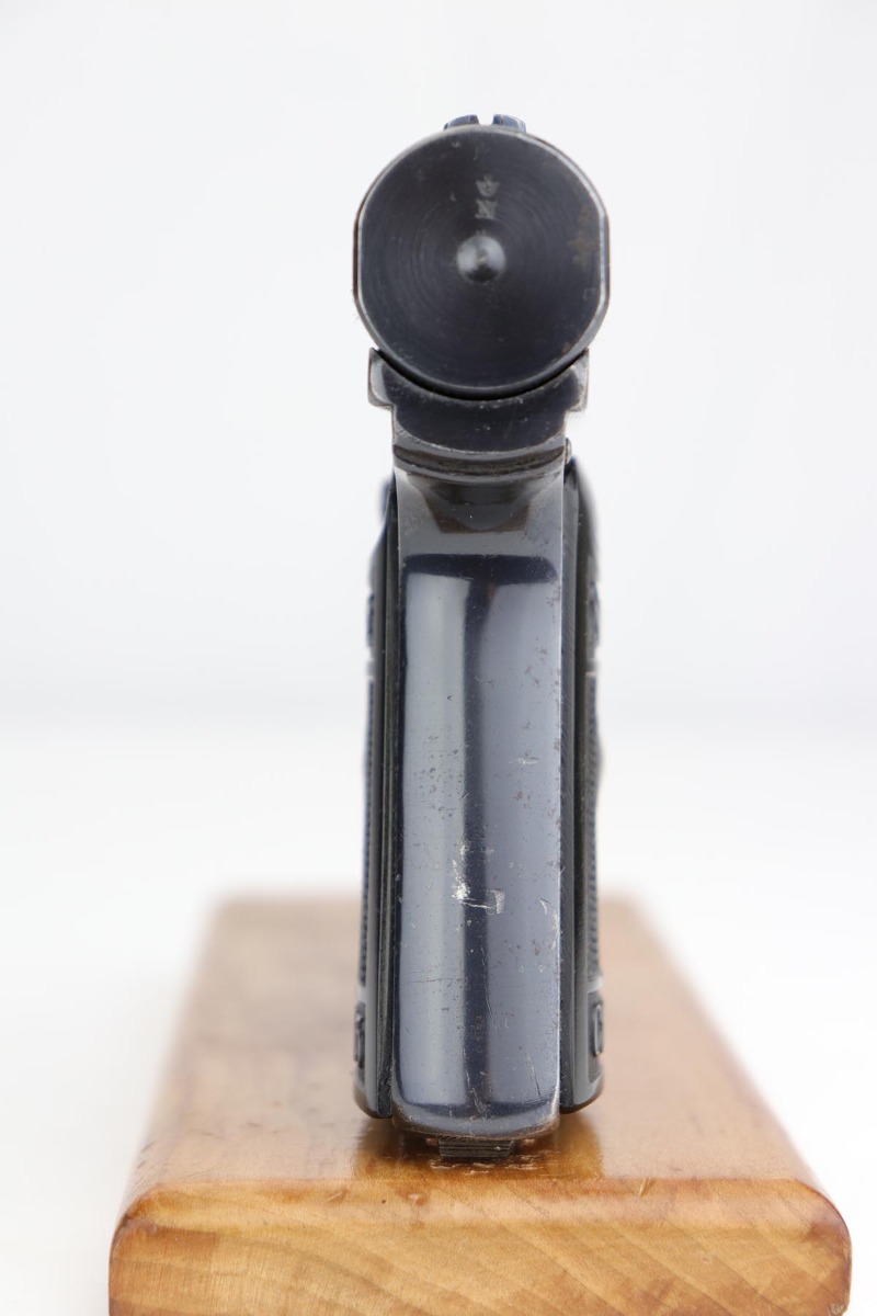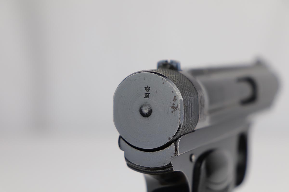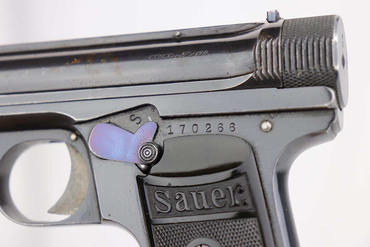 10/1/19 – This is a very rare Sauer model 1926 export – only of only a few we’ve ever encountered! There were only 3,000-4,000 of this variation produced, and not a lot is known about them. This one has the telltale characteristics that separate it from the 1919 model and the 1929/30. The serrations on the cocking knob continue to the slide, and the trigger guard is the (correct) later oval shape. This one is all original and correct with about 92-93% high-polish blue remaining. There is some minor high edge wear on the slide, as well as a couple small areas of pinpricking, but the majority of the finish loss is on the front strap. Excellent grips and proper magazine. Minty bore.