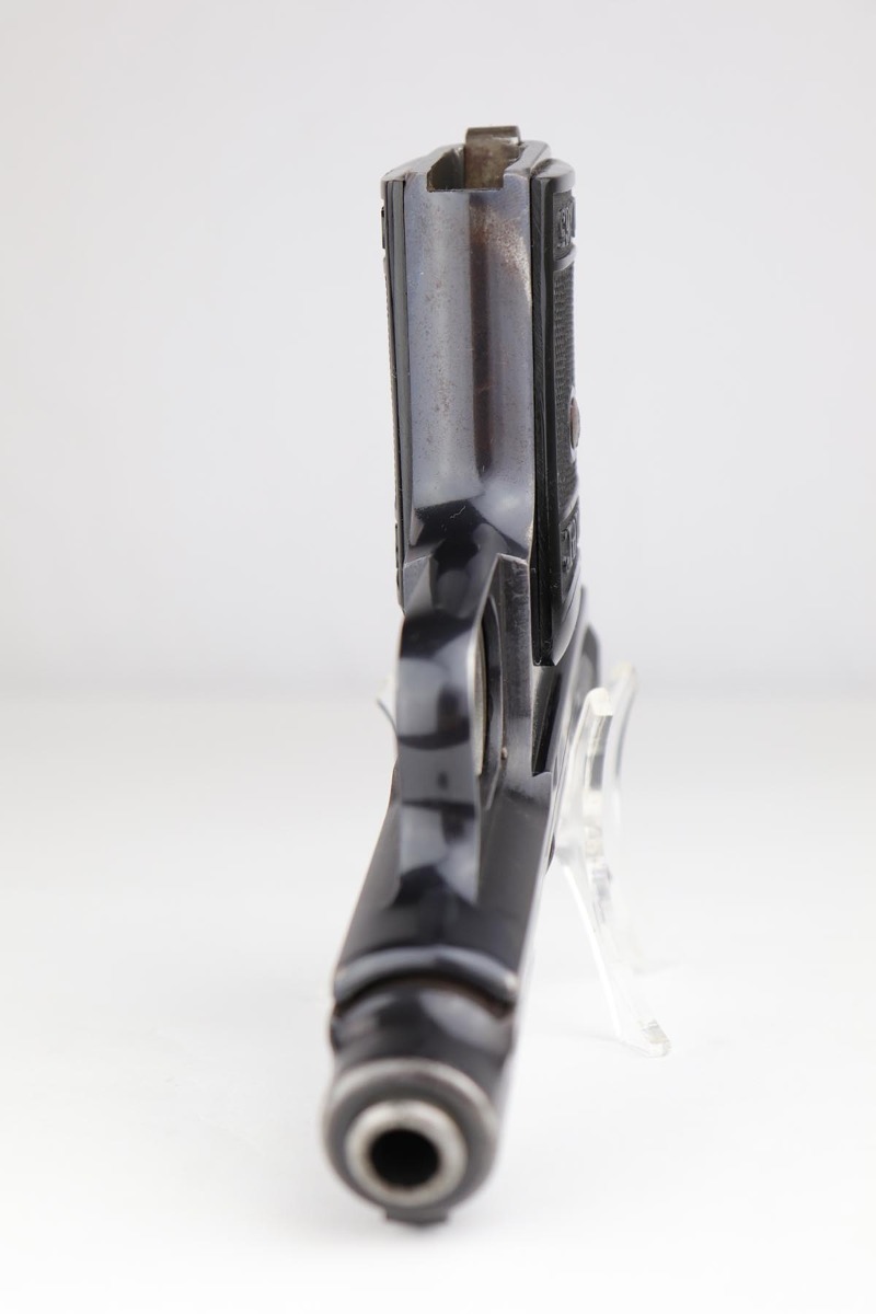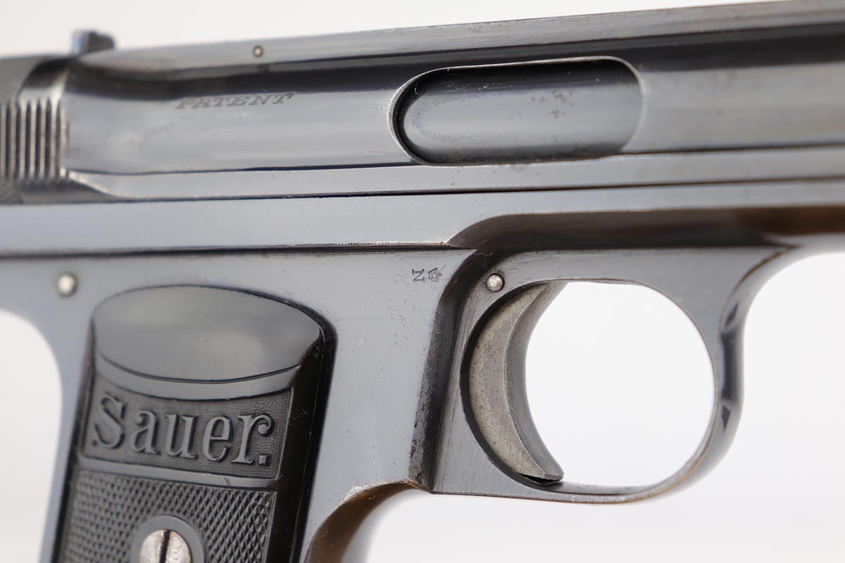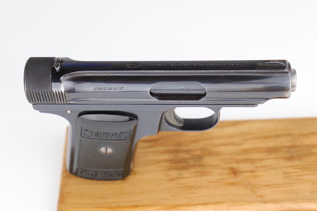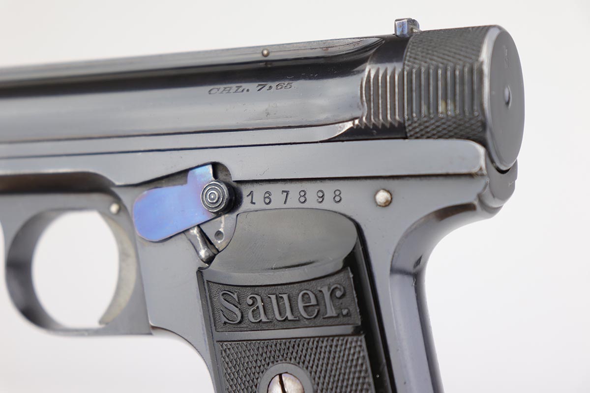 5/7/19 – This is a very rare Sauer model 1926 export – only the second we have ever offered! There were only 3,000-4,000 of this variation produced, and not a lot is known about them. This one has the telltale characteristics that separate it from the 1919 model and the 1929/30. The serrations on the cocking knob continue to the slide, and the trigger guard is the (correct) later oval shape. This one is all original and correct with about 95% high-polish blue remaining. The wear is evenly distributed on either side of the slide, near the muzzle, with another area of finish loss on the front strap. Excellent grips and proper magazine. Bore shows some use and minor frost but overall in good condition with nice rifling.