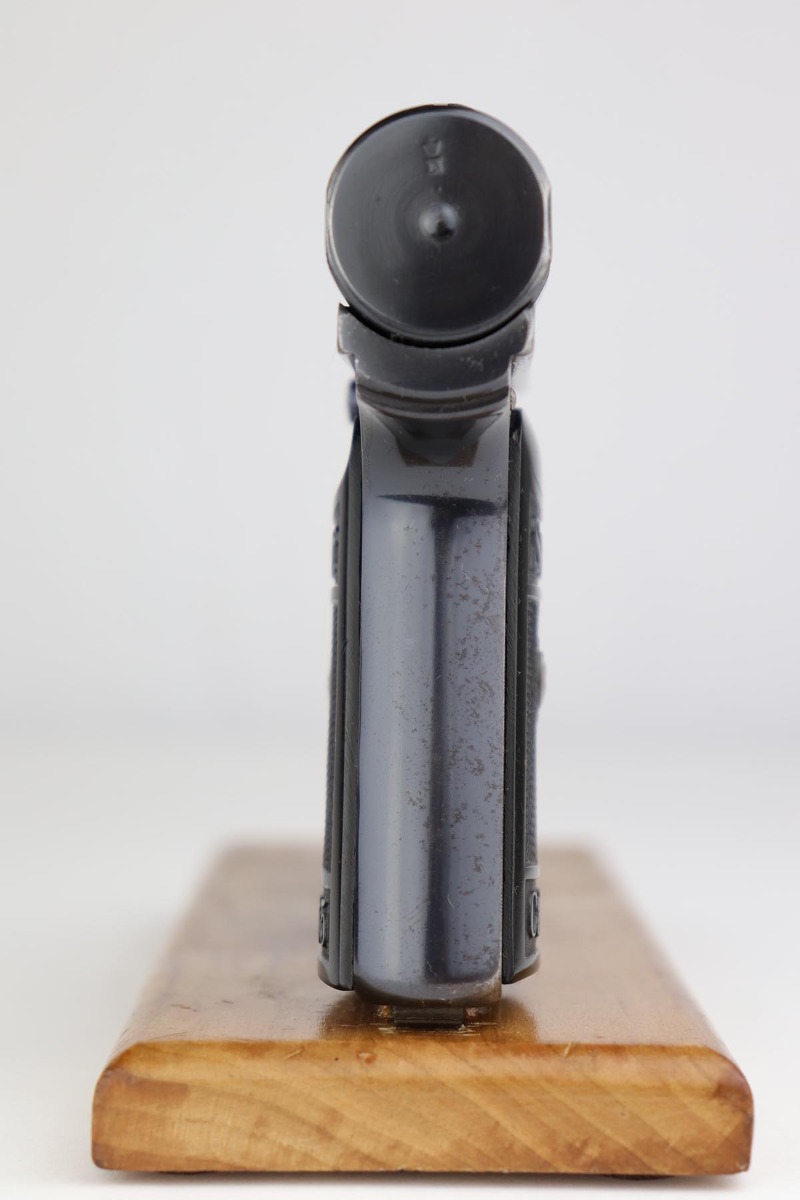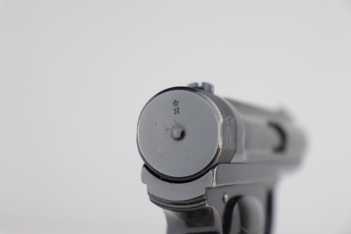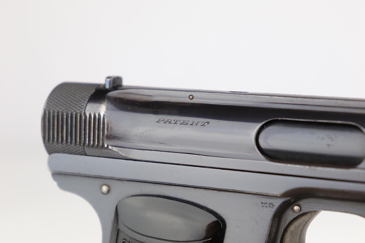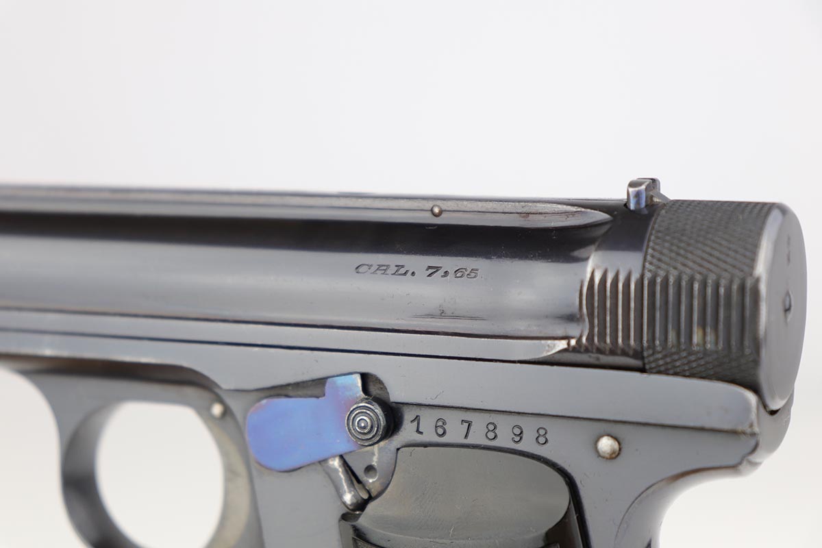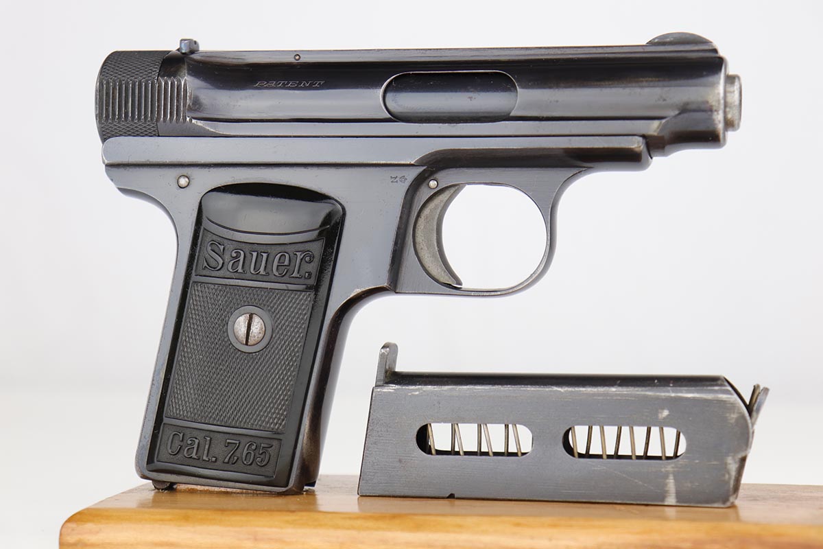 5/7/19 – This is a very rare Sauer model 1926 export – only the second we have ever offered! There were only 3,000-4,000 of this variation produced, and not a lot is known about them. This one has the telltale characteristics that separate it from the 1919 model and the 1929/30. The serrations on the cocking knob continue to the slide, and the trigger guard is the (correct) later oval shape. This one is all original and correct with about 95% high-polish blue remaining. The wear is evenly distributed on either side of the slide, near the muzzle, with another area of finish loss on the front strap. Excellent grips and proper magazine. Bore shows some use and minor frost but overall in good condition with nice rifling.