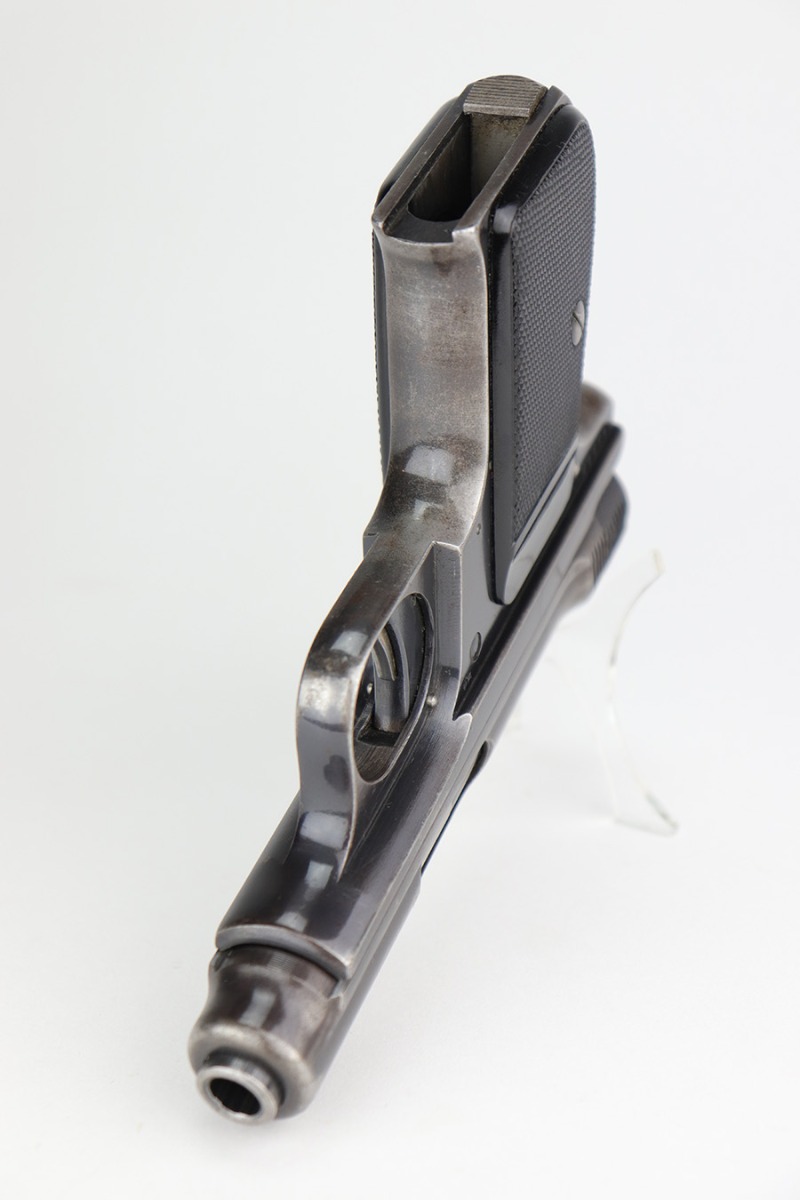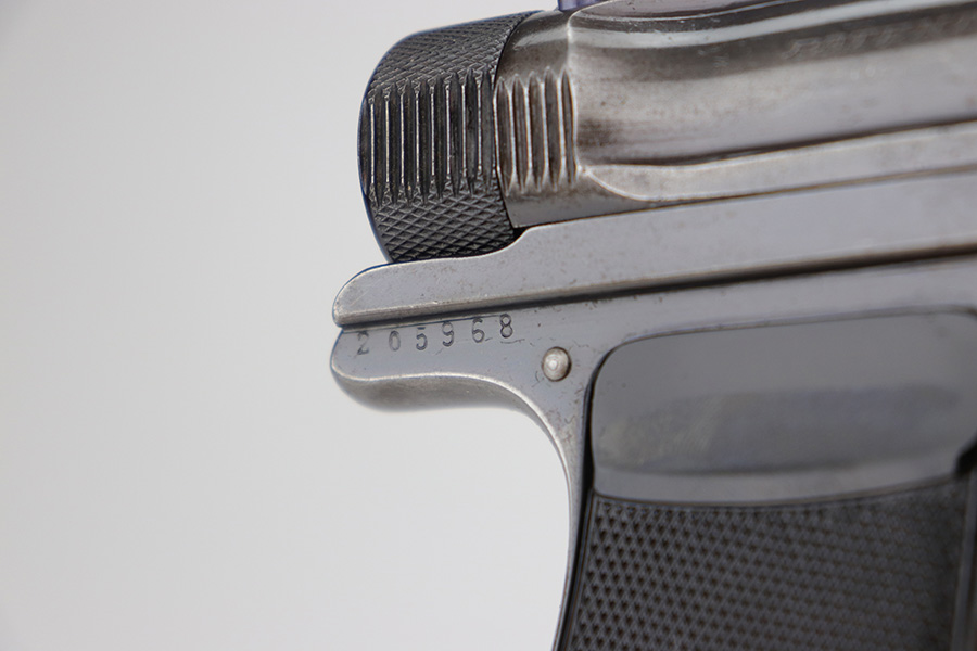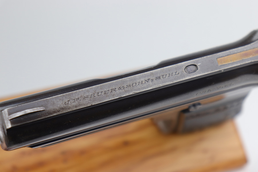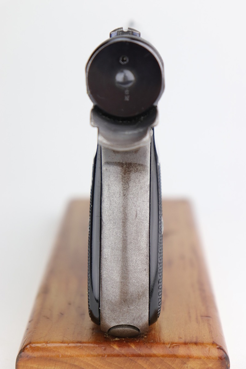 1/27/23 – This is a nice example of a rare Sauer Behorden, manufactured in the 1930’s and chambered in 7.65mm. It is all matching and has the proper “Crown N” proofs throughout. Most of these went to the police, but this one may have been sold in the commercial market – it lacks police proofs of any kind. It has retained roughly 75% of its original high polish finish. There is obvious finish loss throughout, concentrated mostly on the grip straps and along the round edges of the slide. Comes with excellent period-correct black bakelite grips and one proper magazine. Mint bore.