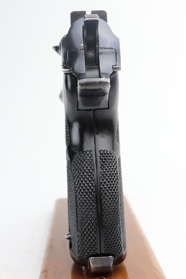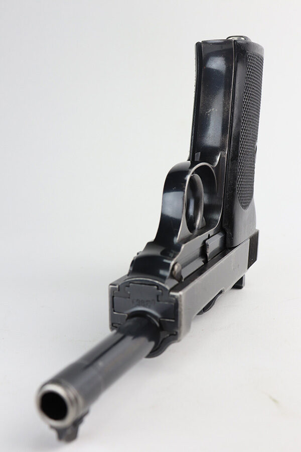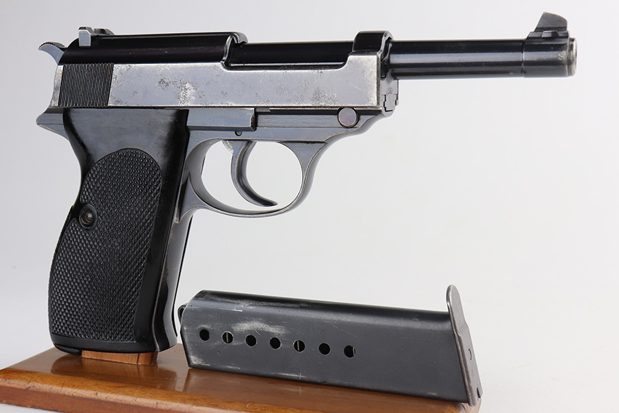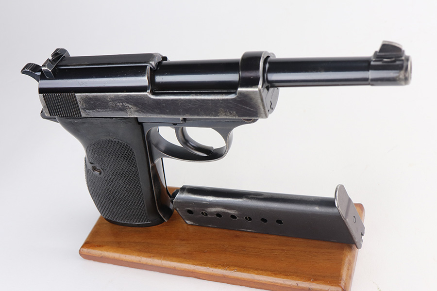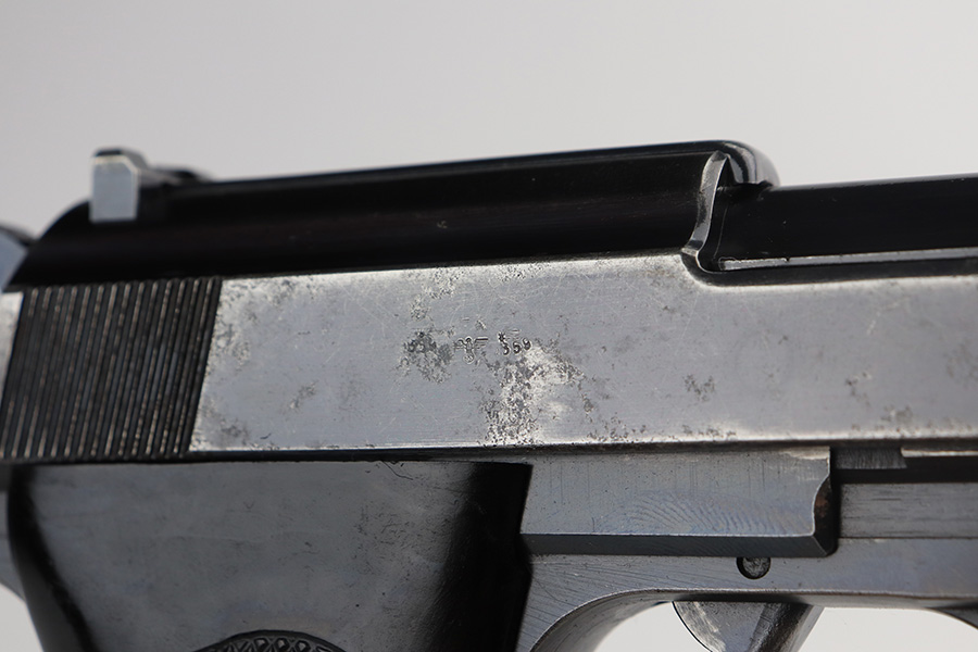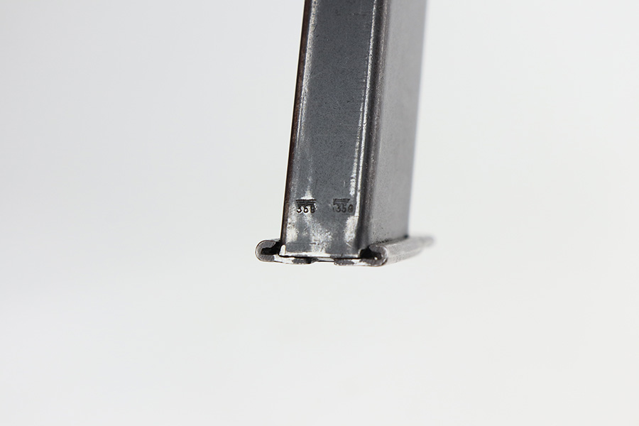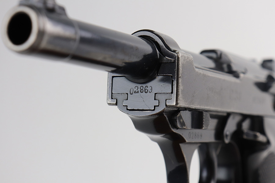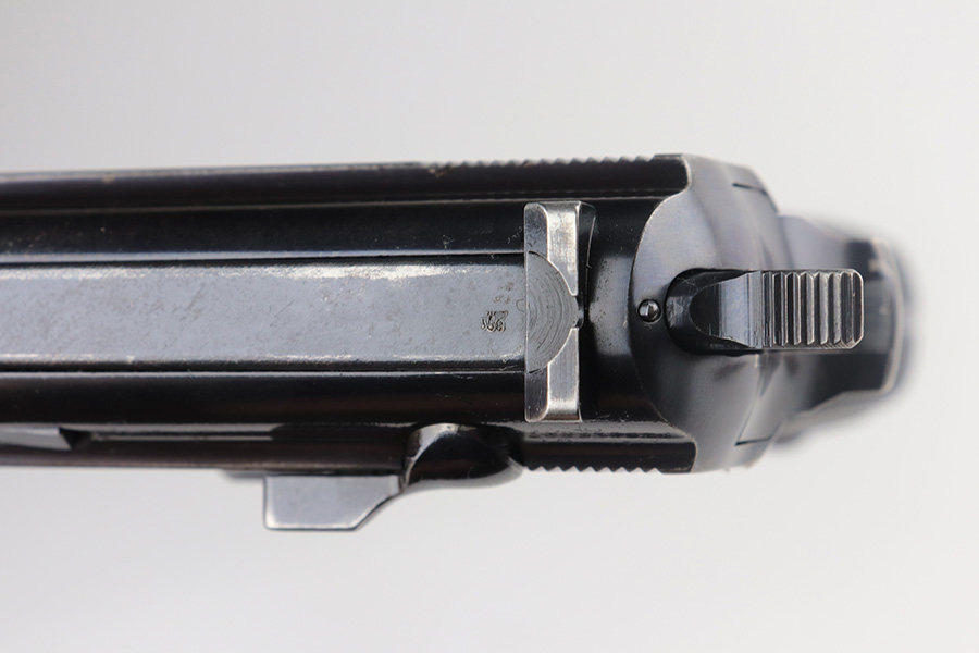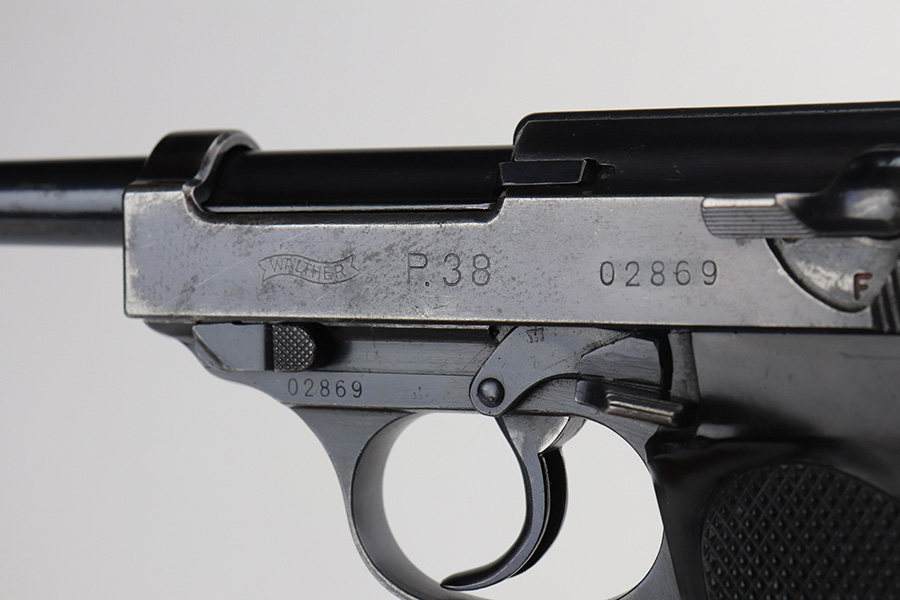 6/14/21 – This is a rare second-variation “Zero Series” Walther P.38 issued to the Nazi military in 1940. It has the proper rectangular firing pin. The gun is matching and has the proper “Eagle 359” military proofs throughout. It has retained roughly 85% of its original finish. There is spotty wear on the front strap, on both sides of the slide, and around the muzzle. Spotty freckling here and there and areas of minor pitting on the right side of the slide. Comes with excellent matching grips and an original matching magazine. Minty bore.