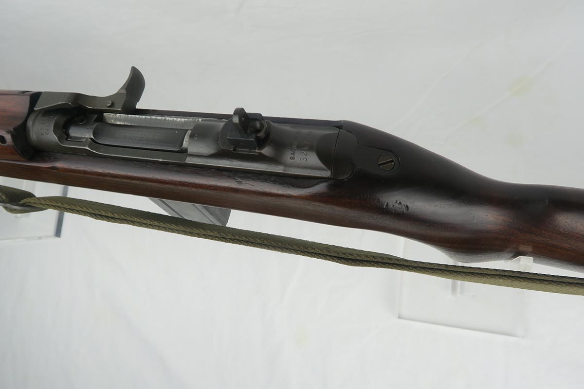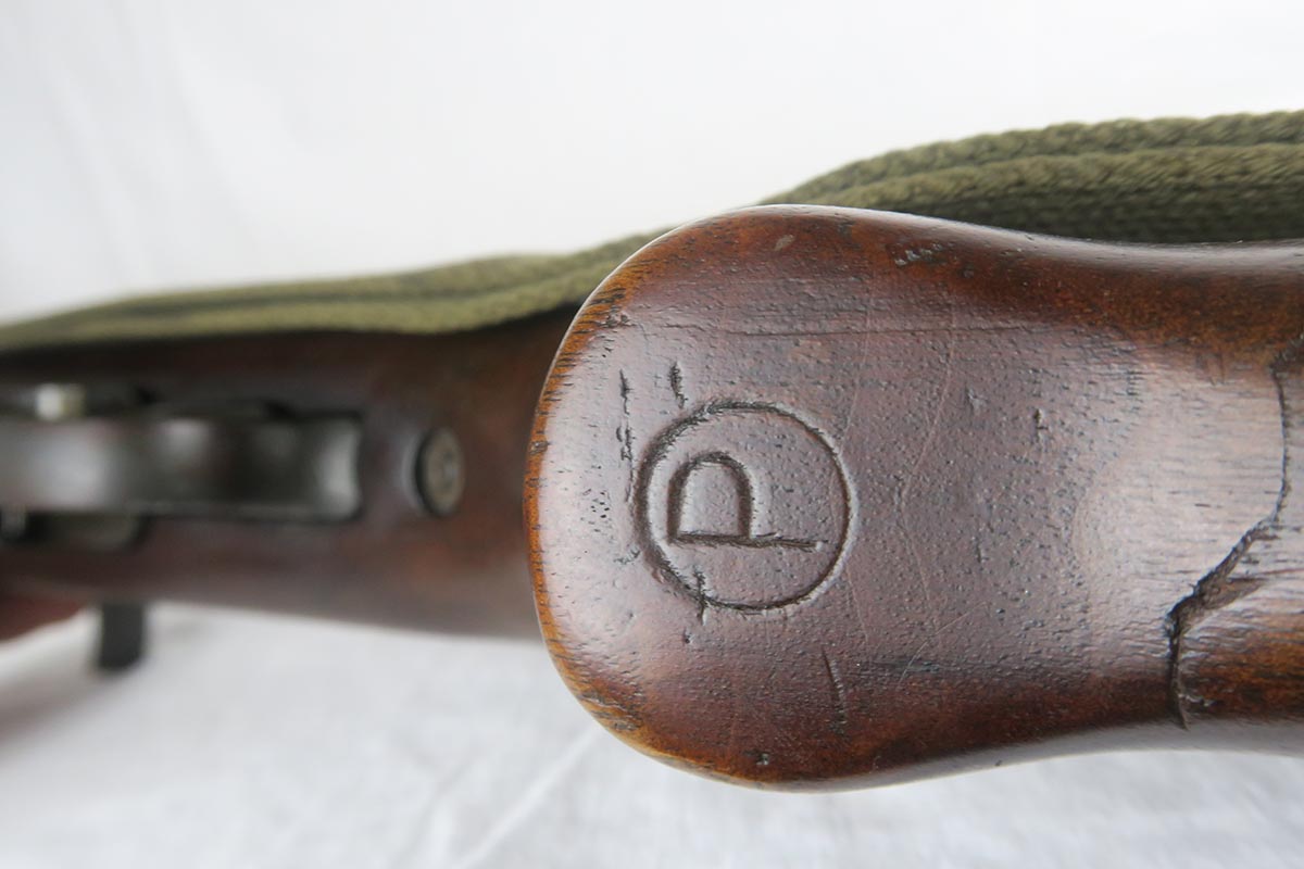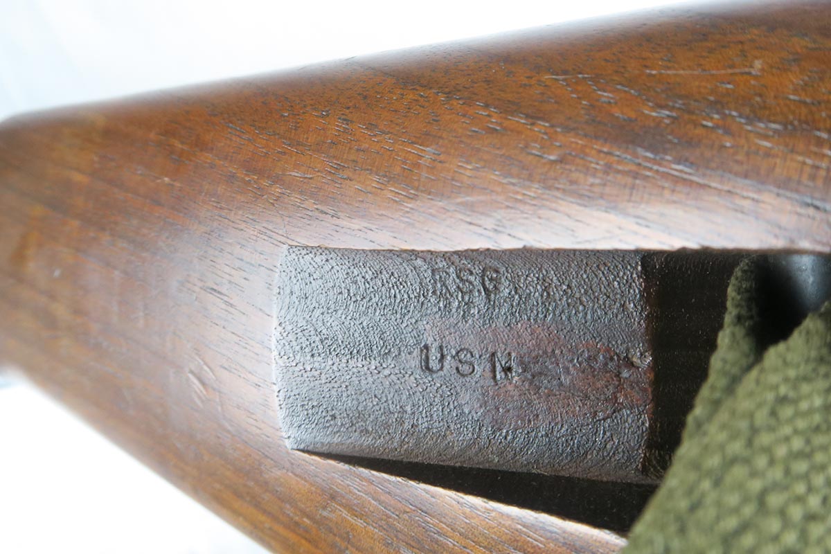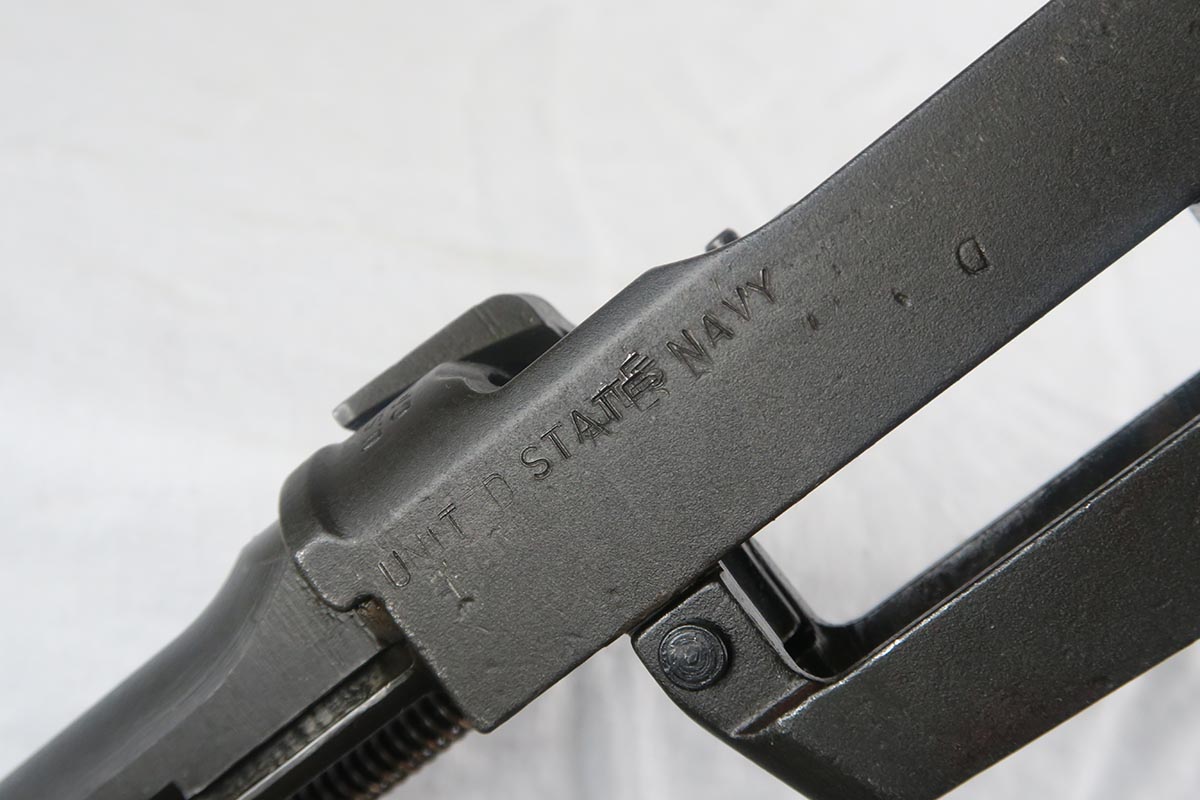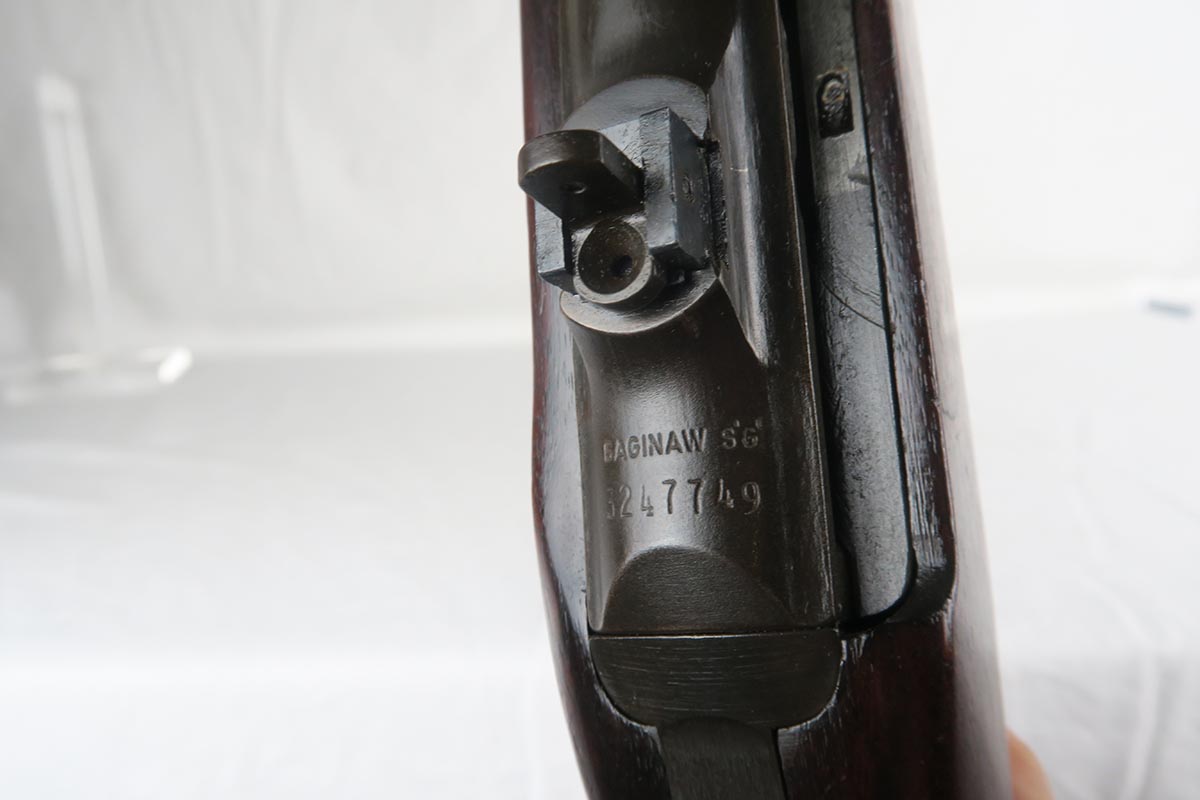 12/1/17 – This is an excellent and potentially very rare M1 Carbine made by Saginaw.  Saginaw Gear only made about 8% of the total carbines in WW2 and gained two locations when they took over the Irwin Pedersen Arms Co.   They used Underwood barrels, and this one has the date of June, 1943.  Also marked with a flaming bomb and P.   The stock is excellent with the exception of a “ding” on the forward left side.  Under the strap is the RSG mark for Saginaw Gear, but also a USN mark.  Along with this, the receiver is marked UNITED STATES NAVY, but it’s mostly obscured by the stock until you take the gun apart.   Have not seen this before, and we don’t know when the mark would’ve been applied.  There are various small parts marked IP as they were left over Irwin Pedersen parts. These include the safety button and rear site.  Many other parts are marked S’G’ including the Magazine.  Excellent and all original finish.  Bore is pretty shiny with strong rifling.  Very little muzzle wear.