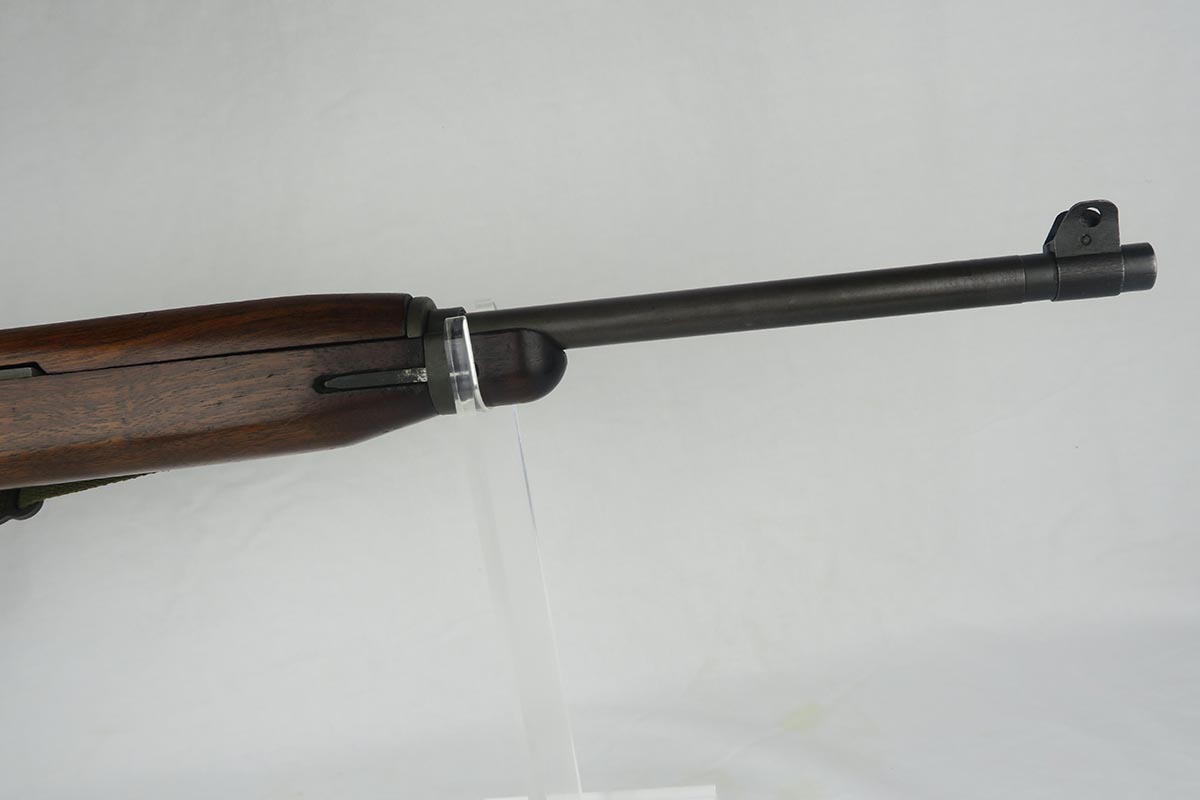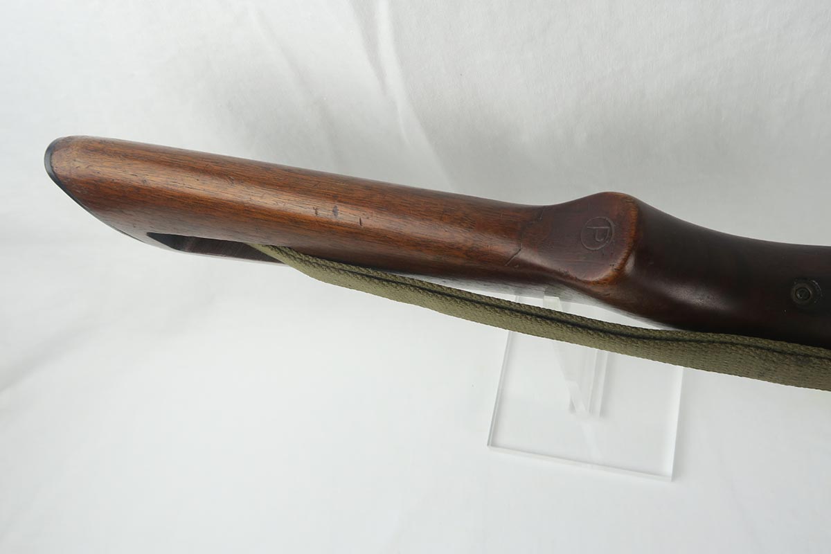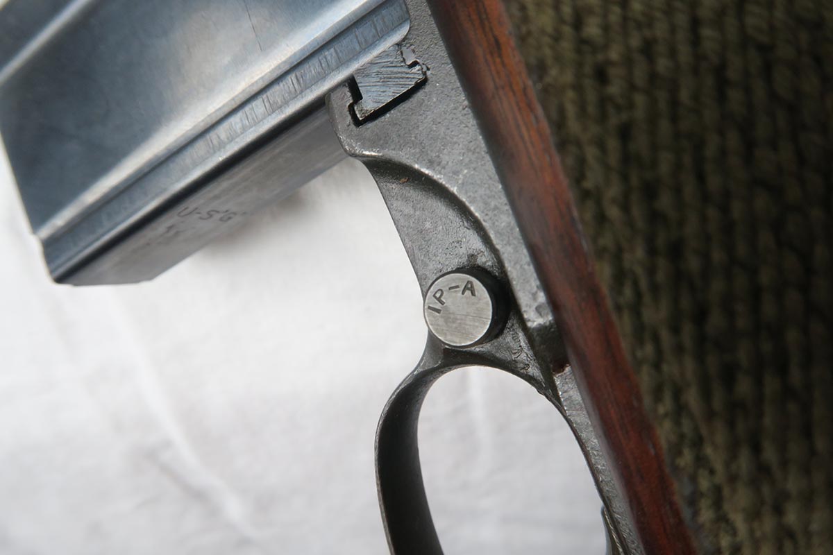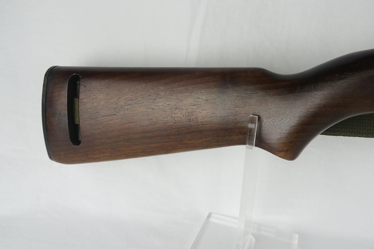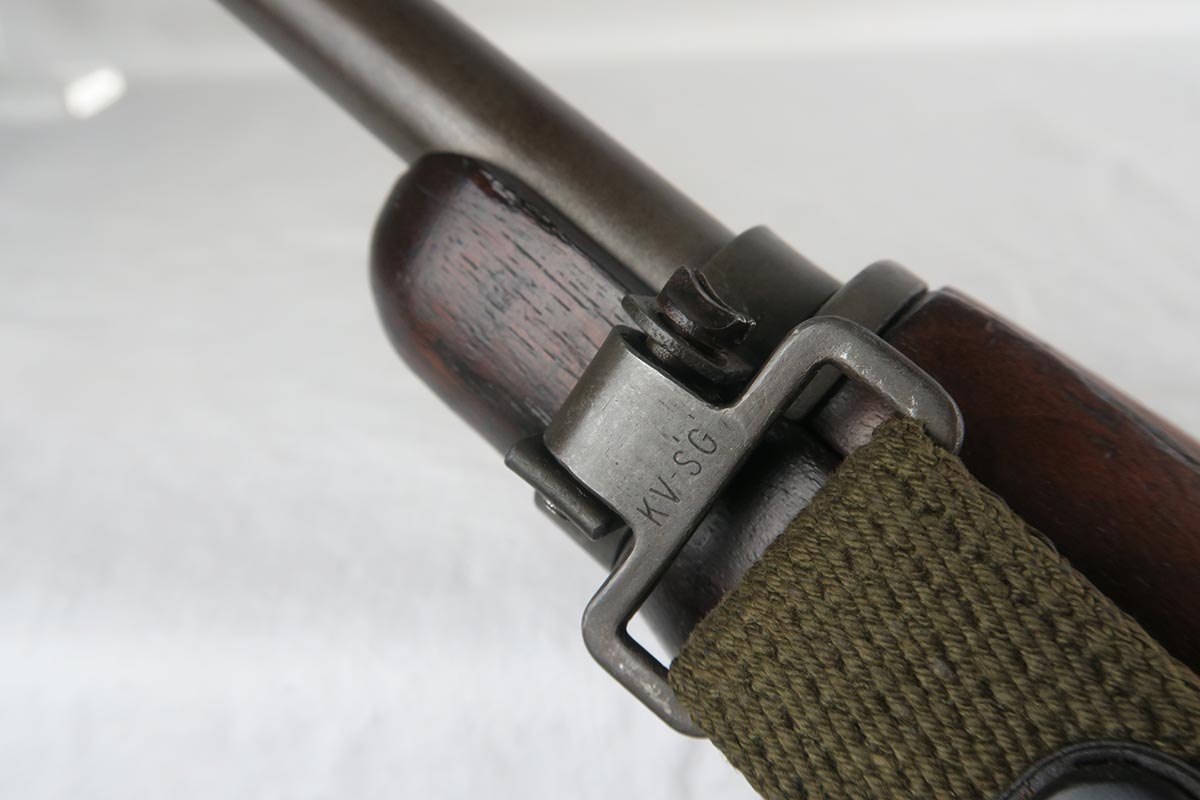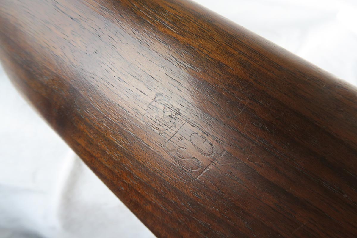12/1/17 – This is an excellent and potentially very rare M1 Carbine made by Saginaw.  Saginaw Gear only made about 8% of the total carbines in WW2 and gained two locations when they took over the Irwin Pedersen Arms Co.   They used Underwood barrels, and this one has the date of June, 1943.  Also marked with a flaming bomb and P.   The stock is excellent with the exception of a “ding” on the forward left side.  Under the strap is the RSG mark for Saginaw Gear, but also a USN mark.  Along with this, the receiver is marked UNITED STATES NAVY, but it’s mostly obscured by the stock until you take the gun apart.   Have not seen this before, and we don’t know when the mark would’ve been applied.  There are various small parts marked IP as they were left over Irwin Pedersen parts. These include the safety button and rear site.  Many other parts are marked S’G’ including the Magazine.  Excellent and all original finish.  Bore is pretty shiny with strong rifling.  Very little muzzle wear.