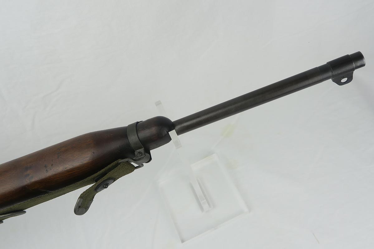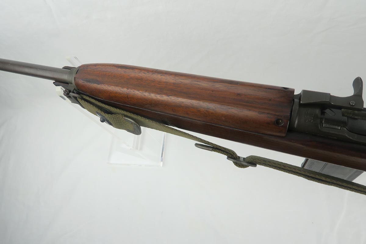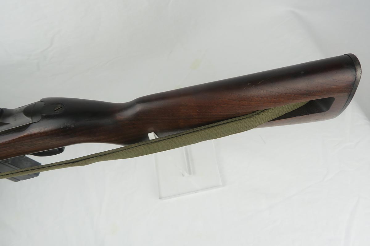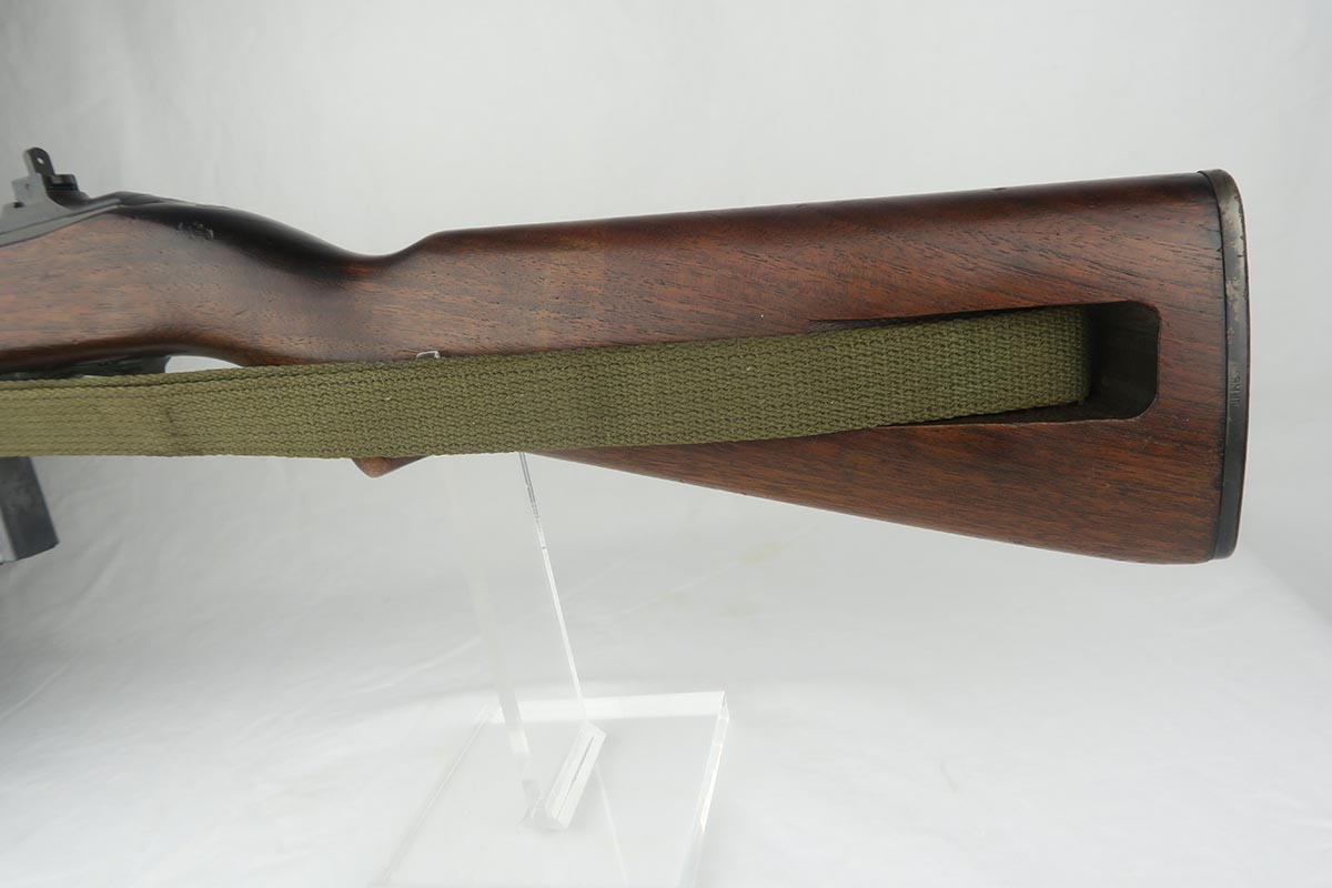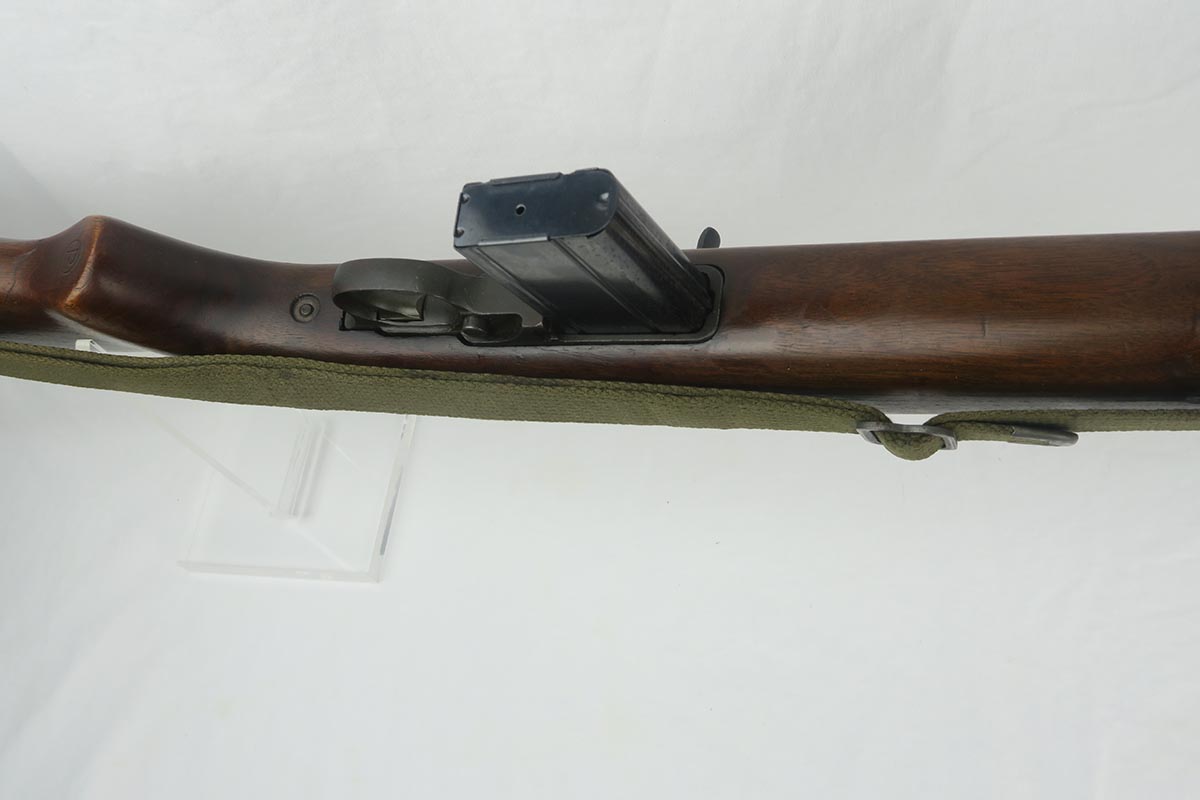12/1/17 – This is an excellent and potentially very rare M1 Carbine made by Saginaw.  Saginaw Gear only made about 8% of the total carbines in WW2 and gained two locations when they took over the Irwin Pedersen Arms Co.   They used Underwood barrels, and this one has the date of June, 1943.  Also marked with a flaming bomb and P.   The stock is excellent with the exception of a “ding” on the forward left side.  Under the strap is the RSG mark for Saginaw Gear, but also a USN mark.  Along with this, the receiver is marked UNITED STATES NAVY, but it’s mostly obscured by the stock until you take the gun apart.   Have not seen this before, and we don’t know when the mark would’ve been applied.  There are various small parts marked IP as they were left over Irwin Pedersen parts. These include the safety button and rear site.  Many other parts are marked S’G’ including the Magazine.  Excellent and all original finish.  Bore is pretty shiny with strong rifling.  Very little muzzle wear.