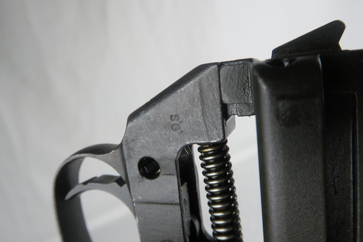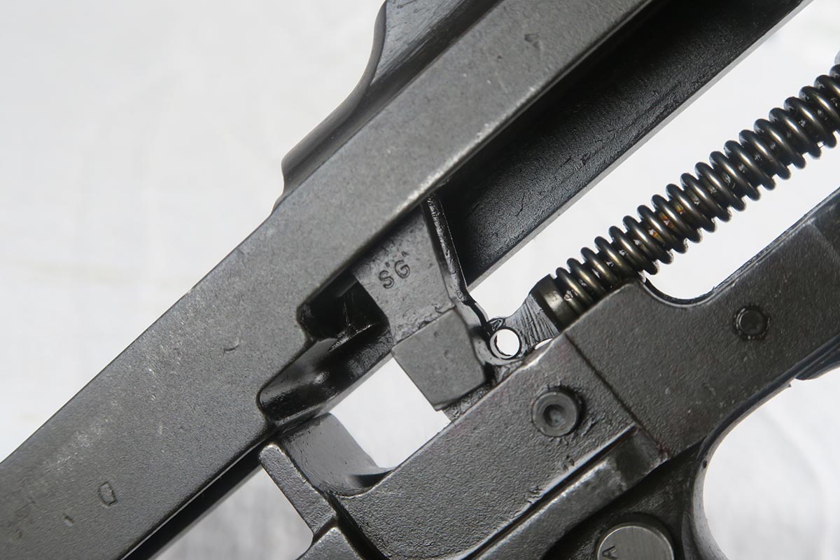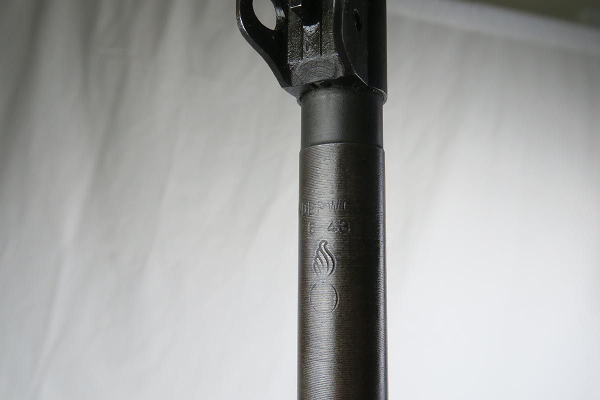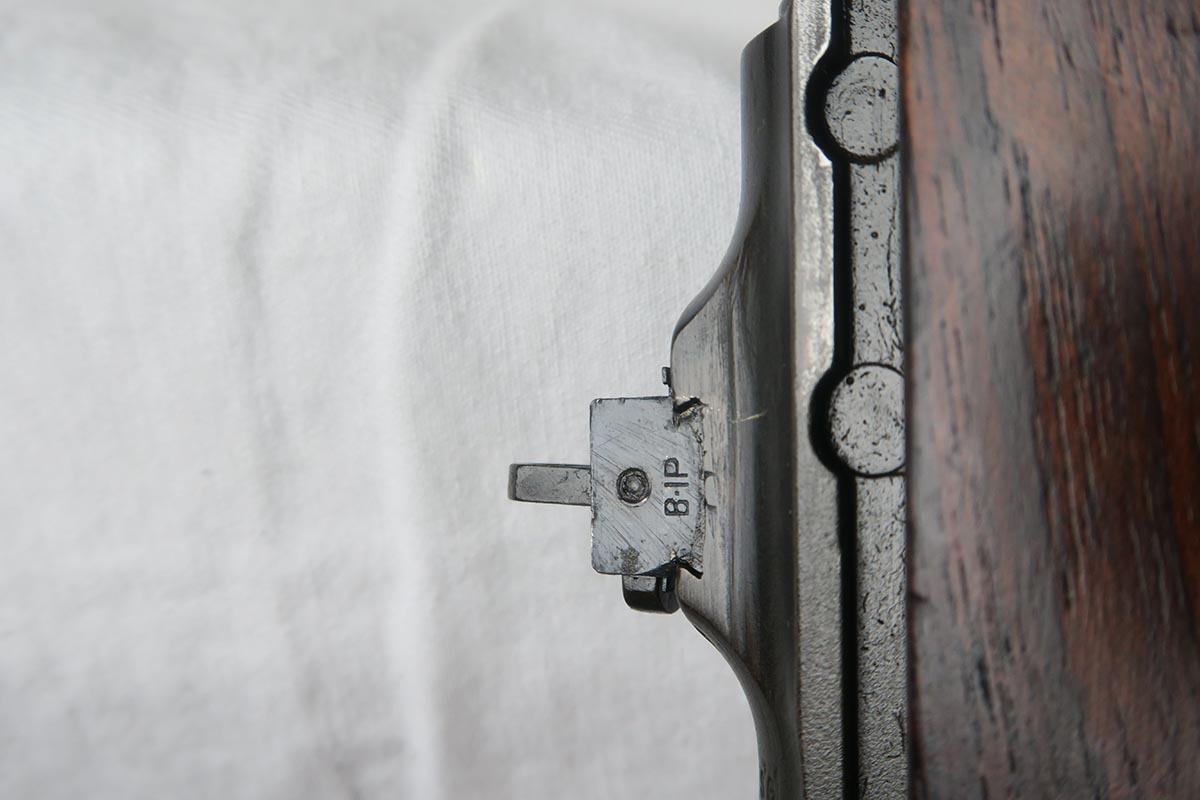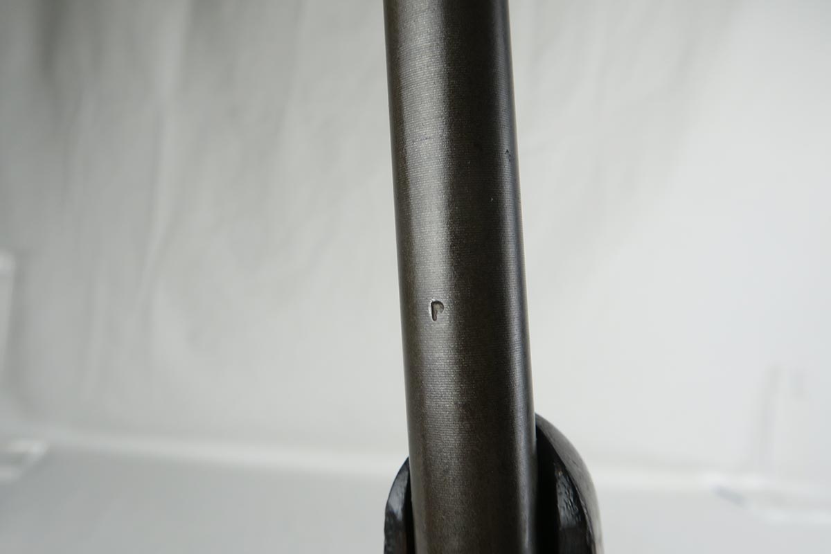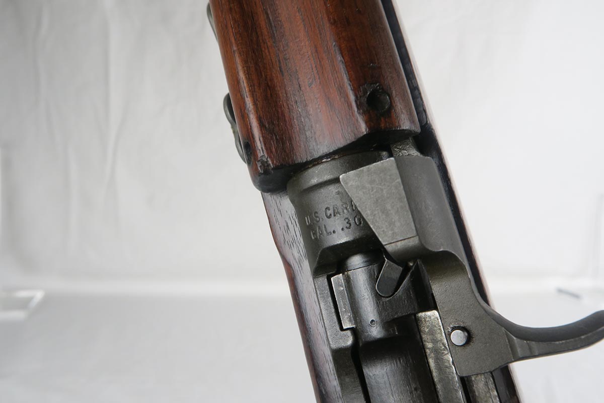 12/1/17 – This is an excellent and potentially very rare M1 Carbine made by Saginaw.  Saginaw Gear only made about 8% of the total carbines in WW2 and gained two locations when they took over the Irwin Pedersen Arms Co.   They used Underwood barrels, and this one has the date of June, 1943.  Also marked with a flaming bomb and P.   The stock is excellent with the exception of a “ding” on the forward left side.  Under the strap is the RSG mark for Saginaw Gear, but also a USN mark.  Along with this, the receiver is marked UNITED STATES NAVY, but it’s mostly obscured by the stock until you take the gun apart.   Have not seen this before, and we don’t know when the mark would’ve been applied.  There are various small parts marked IP as they were left over Irwin Pedersen parts. These include the safety button and rear site.  Many other parts are marked S’G’ including the Magazine.  Excellent and all original finish.  Bore is pretty shiny with strong rifling.  Very little muzzle wear.